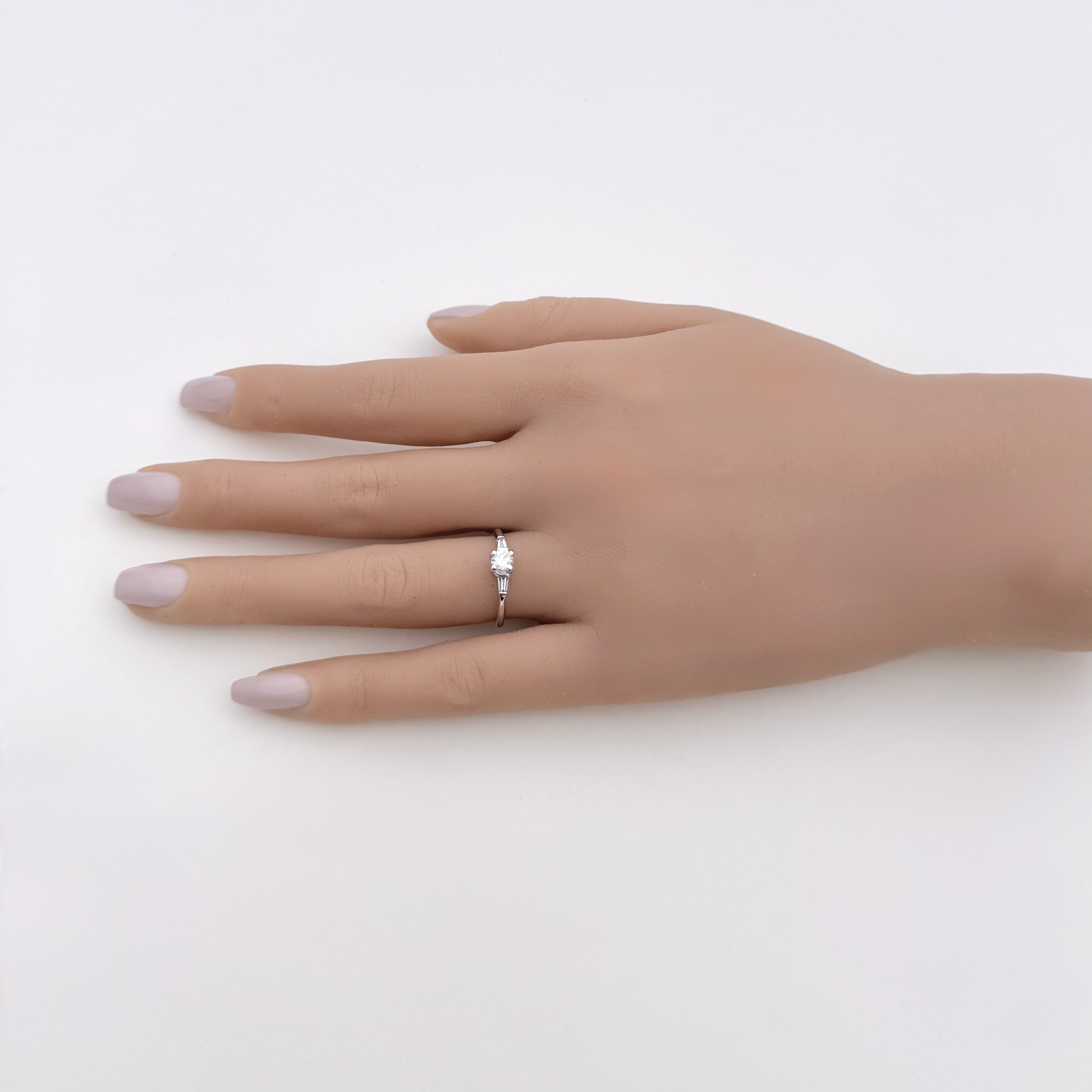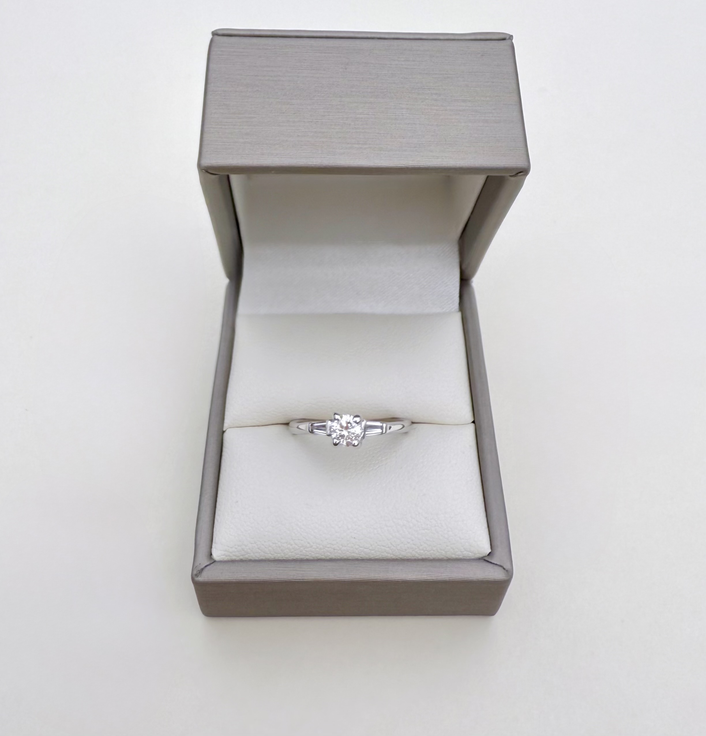 Hallmarked 18ct. White Gold Ring with a stunning round brilliant cut Diamond - four claw set - to centre and two elegant baguette cut Diamonds - one on each shoulder - flanking the centre stone. Total diamonds: 0.60 carat of excellent clarity and top grade colour. New 18ct. white gold band fitted. Hallmarked Birmingham. Band width at shoulders: 1.65mm. widening to 2mm. at centre rear. Ring is accompanied by original certification paperwork verifying the diamond’s purchase from the renowned Diamond Quarter in Amsterdam. The perfect Engagement ring or simply a treat for yourself or someone special!  Size: M. Weight: 2.72 gms.