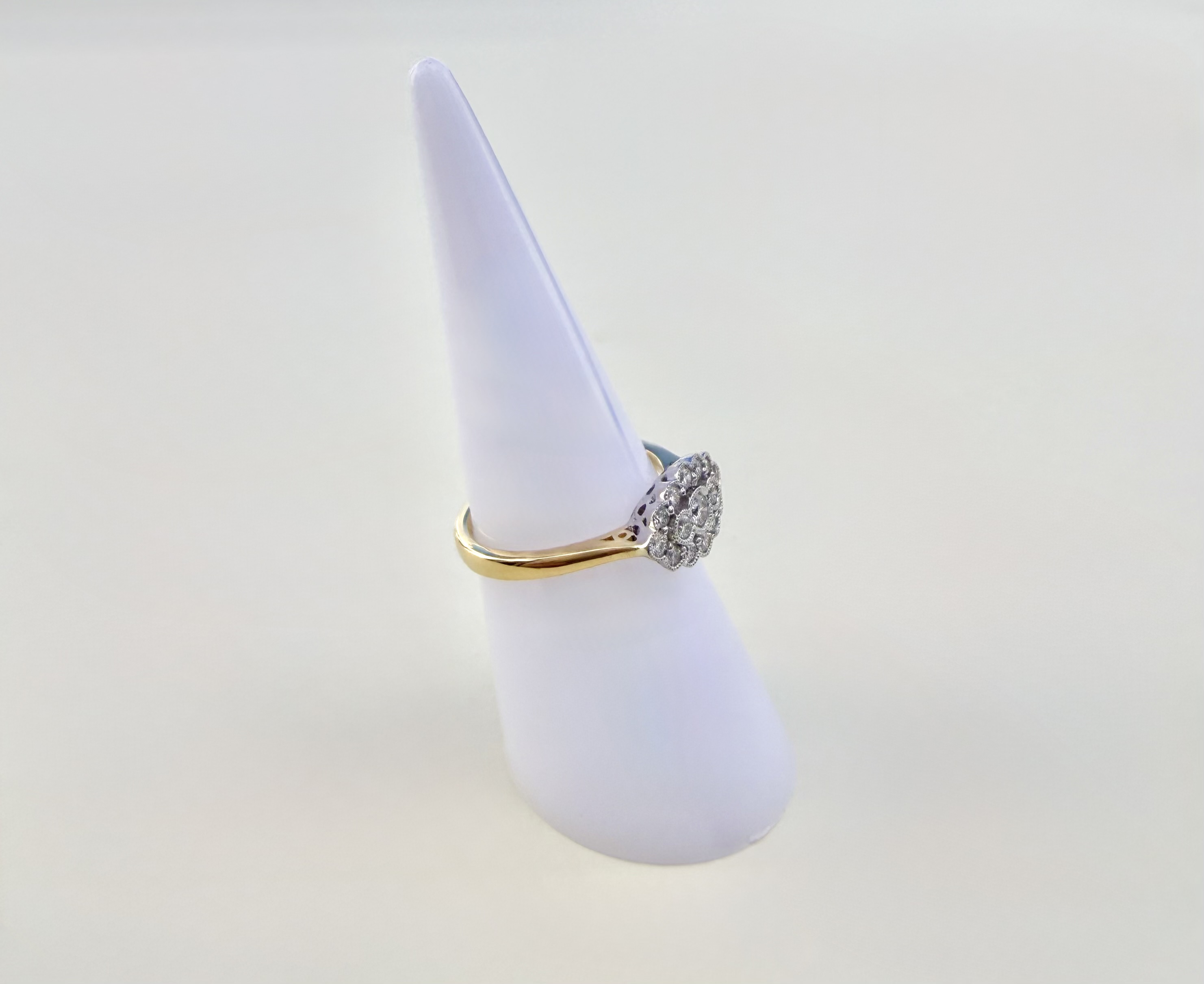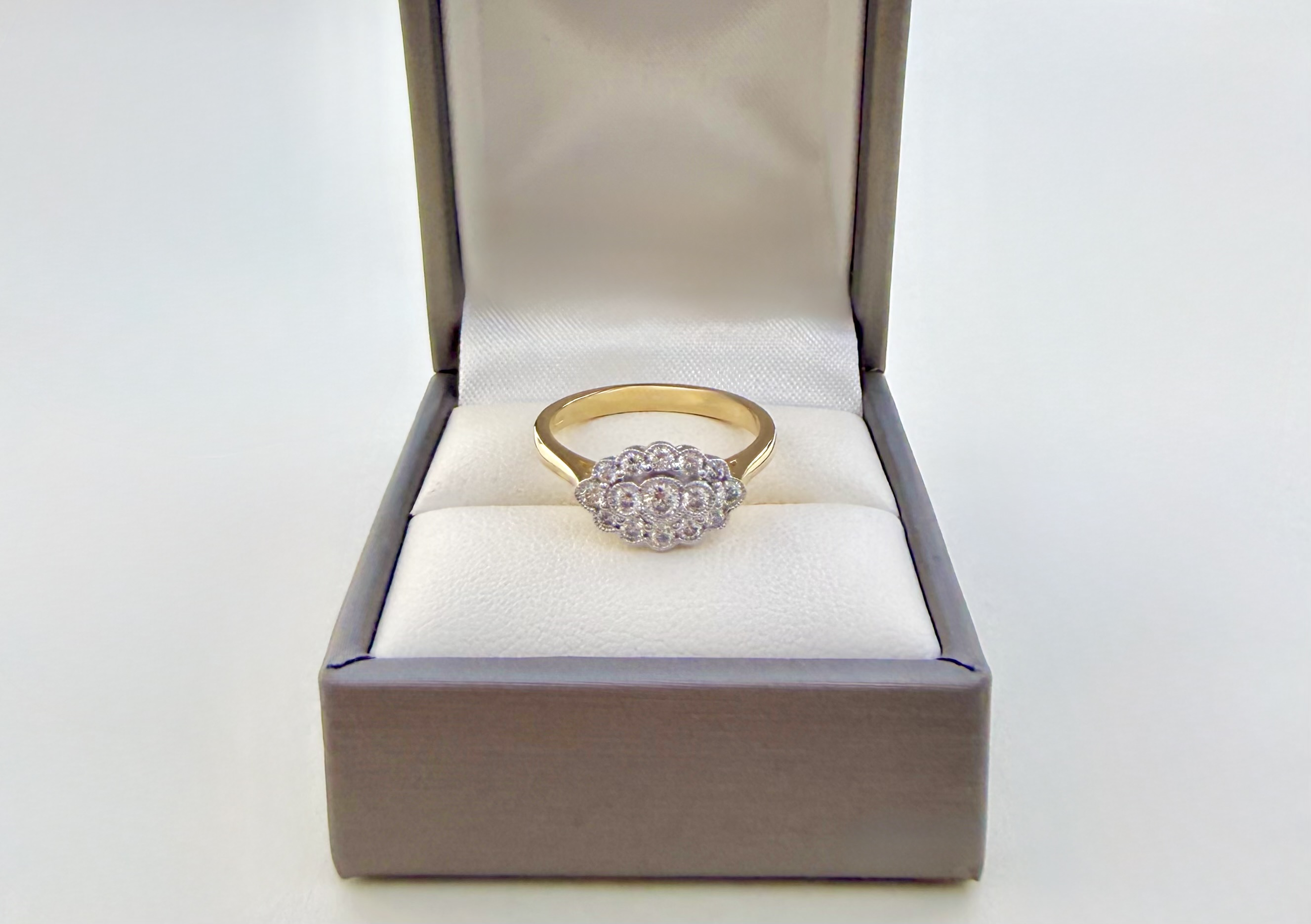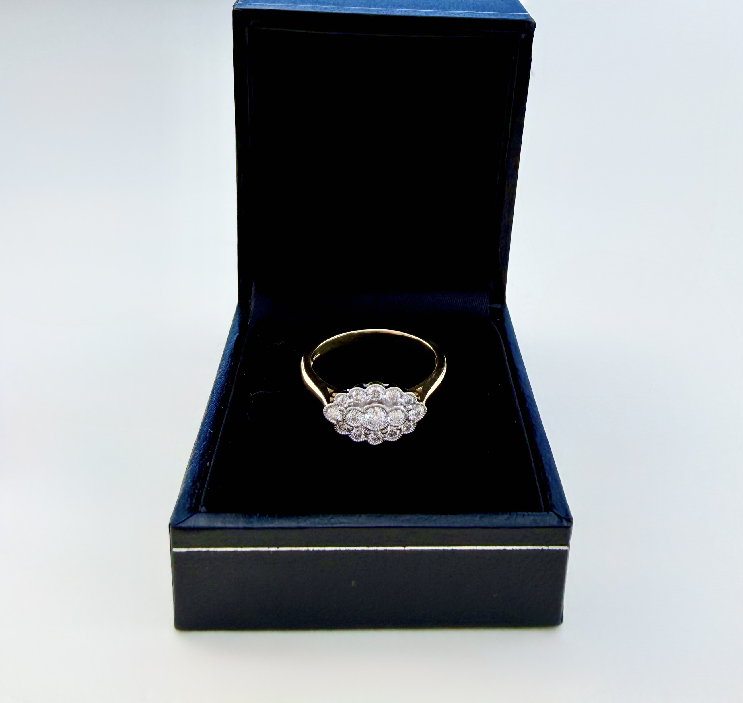 Elegant hallmarked 18ct. yellow gold ring showcasing a beautiful oval-shaped head, featuring three horizontally set diamonds at its centre. These are framed by a halo of twelve sparkling diamonds, enhancing the ring’s beauty and appeal. Hallmarked in Sheffield, Sponsor: FEU, the ring reflects quality craftsmanship and authenticity. The oval head measures approximately 8.3mm x 12.95mm, offering a refined, yet eye-catching presence on the finger. Ring size is N, with a total weight of 3.73 grams.