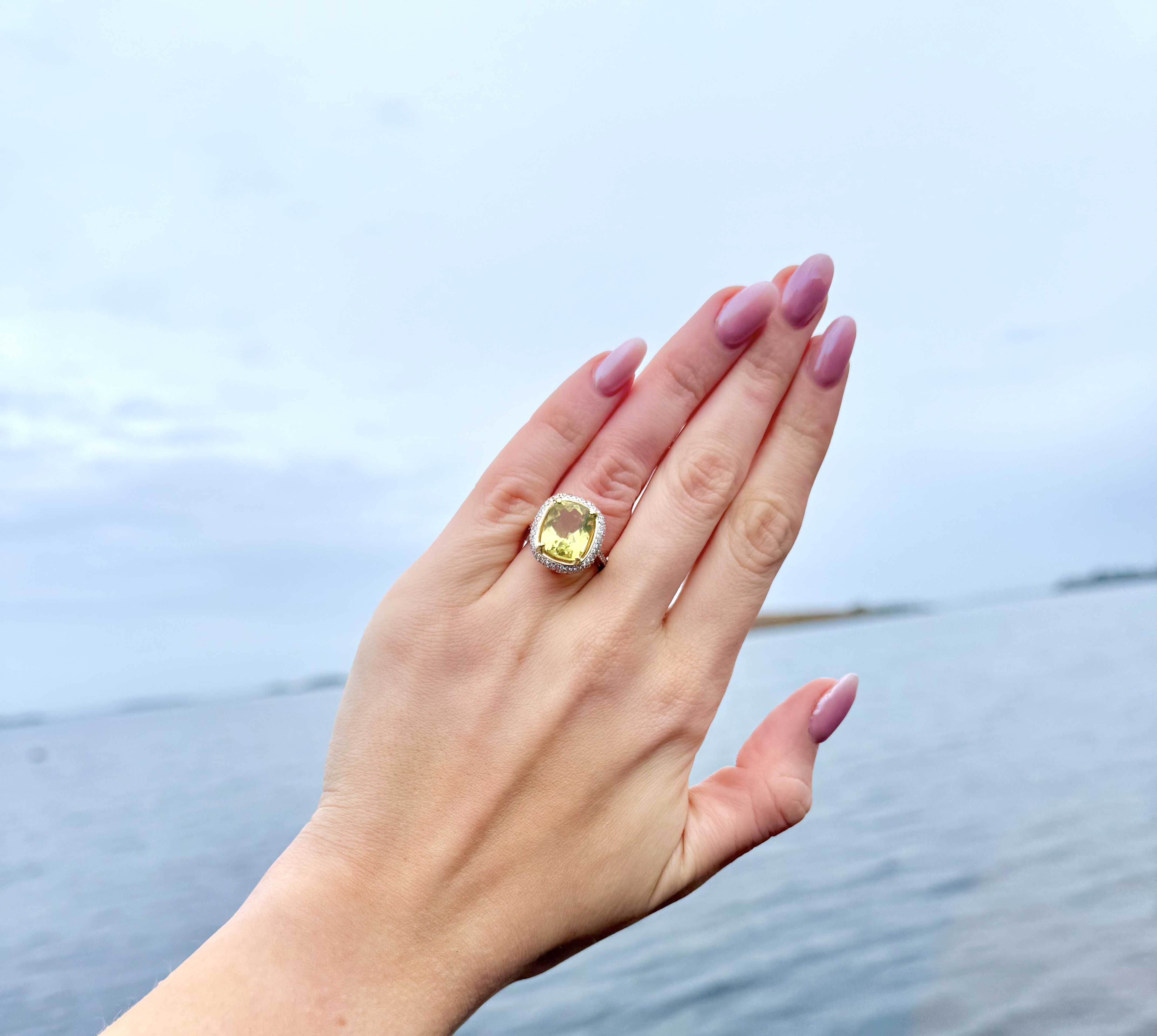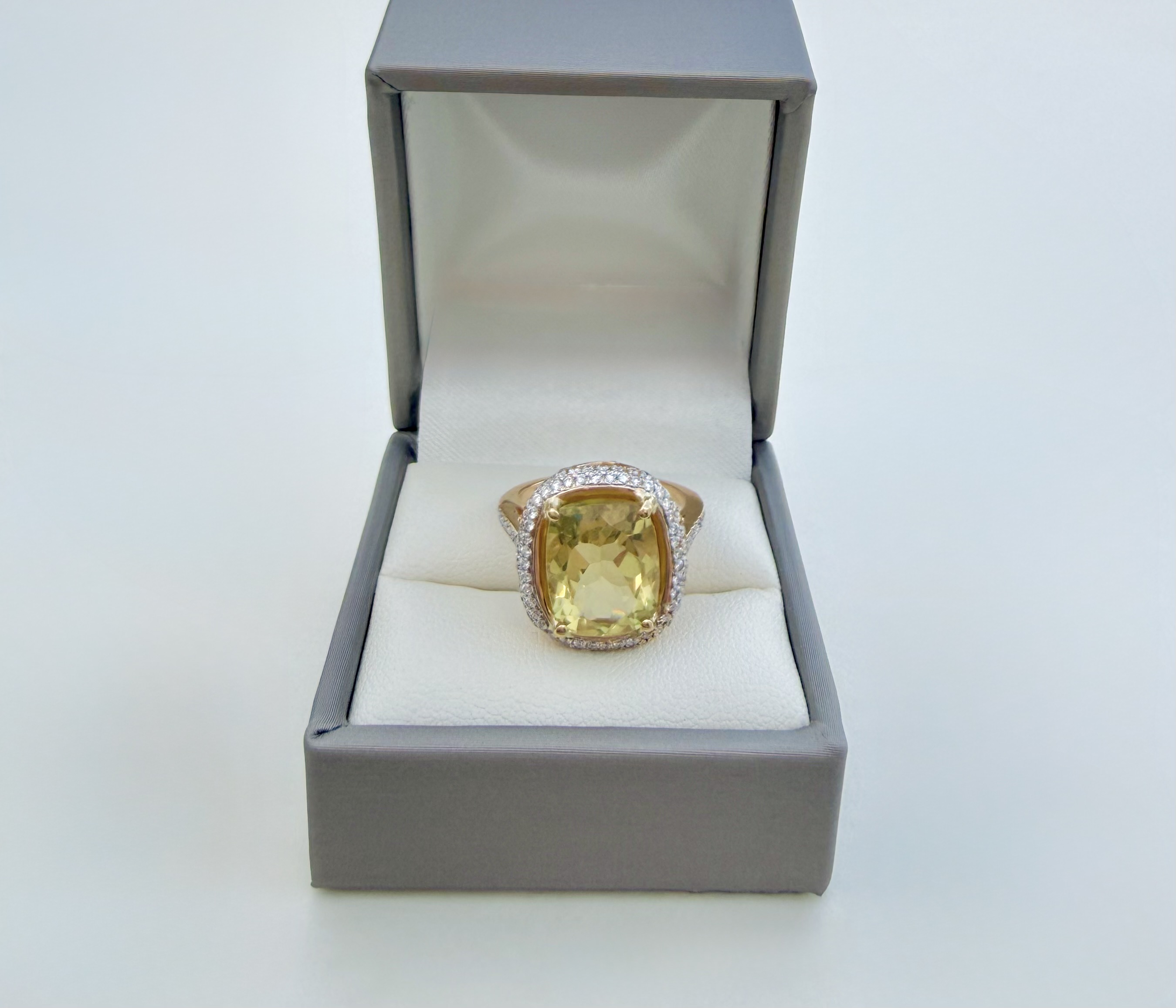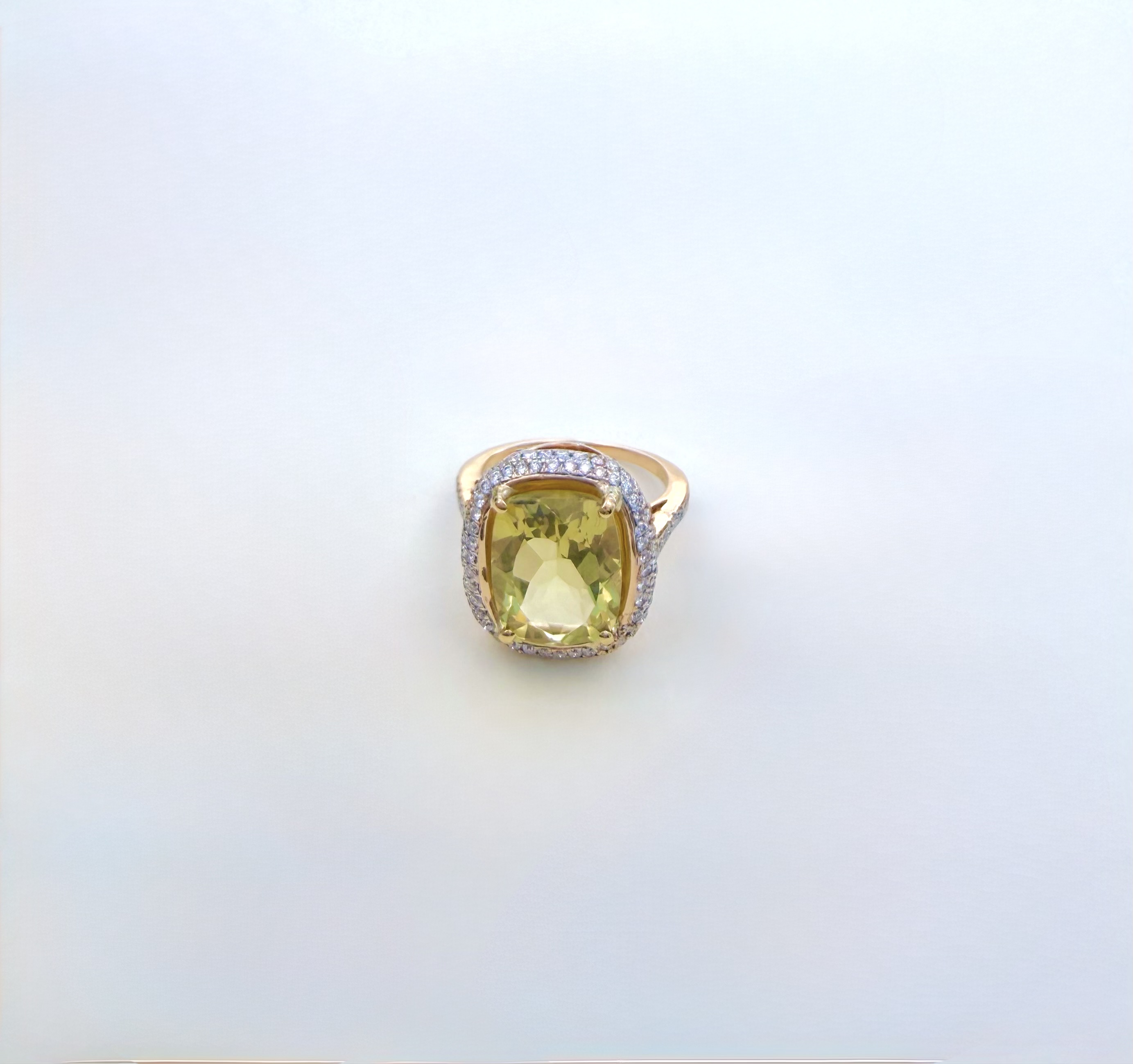 This exquisite hallmarked 18ct. yellow gold ring features a captivating lemon quartz centre stone of excellent quality, expertly set in a classic four-claw setting. Measuring 12.10mm x 10.10mm with a depth of 6.78mm, this vibrant gemstone radiates a sunny, luminous glow.