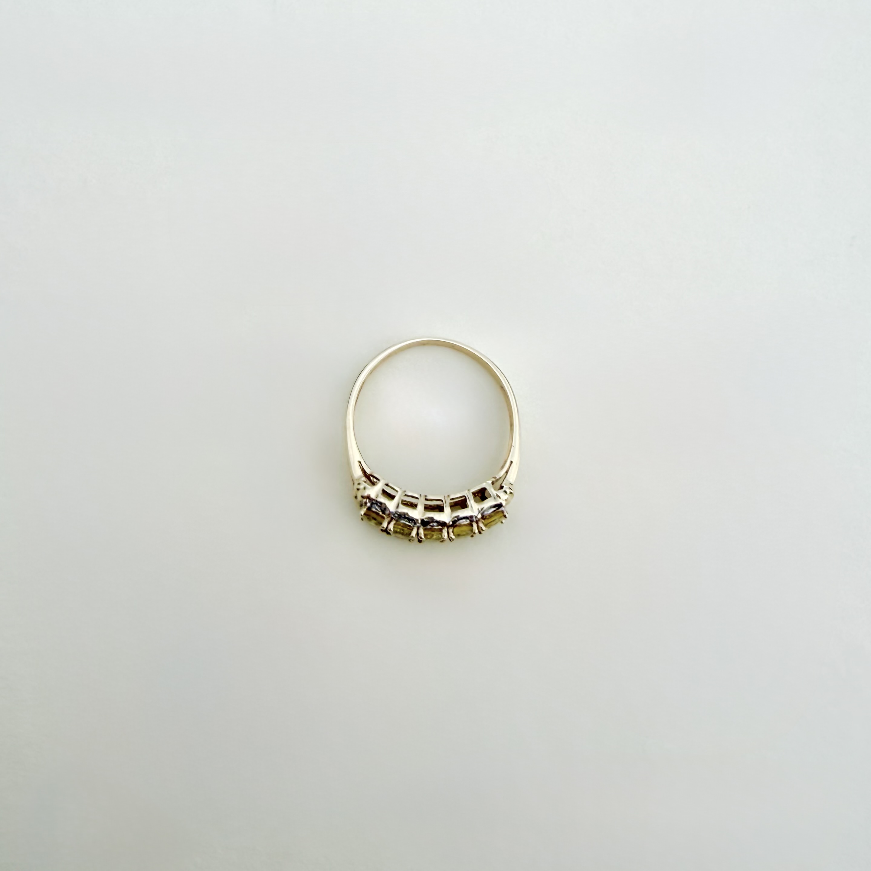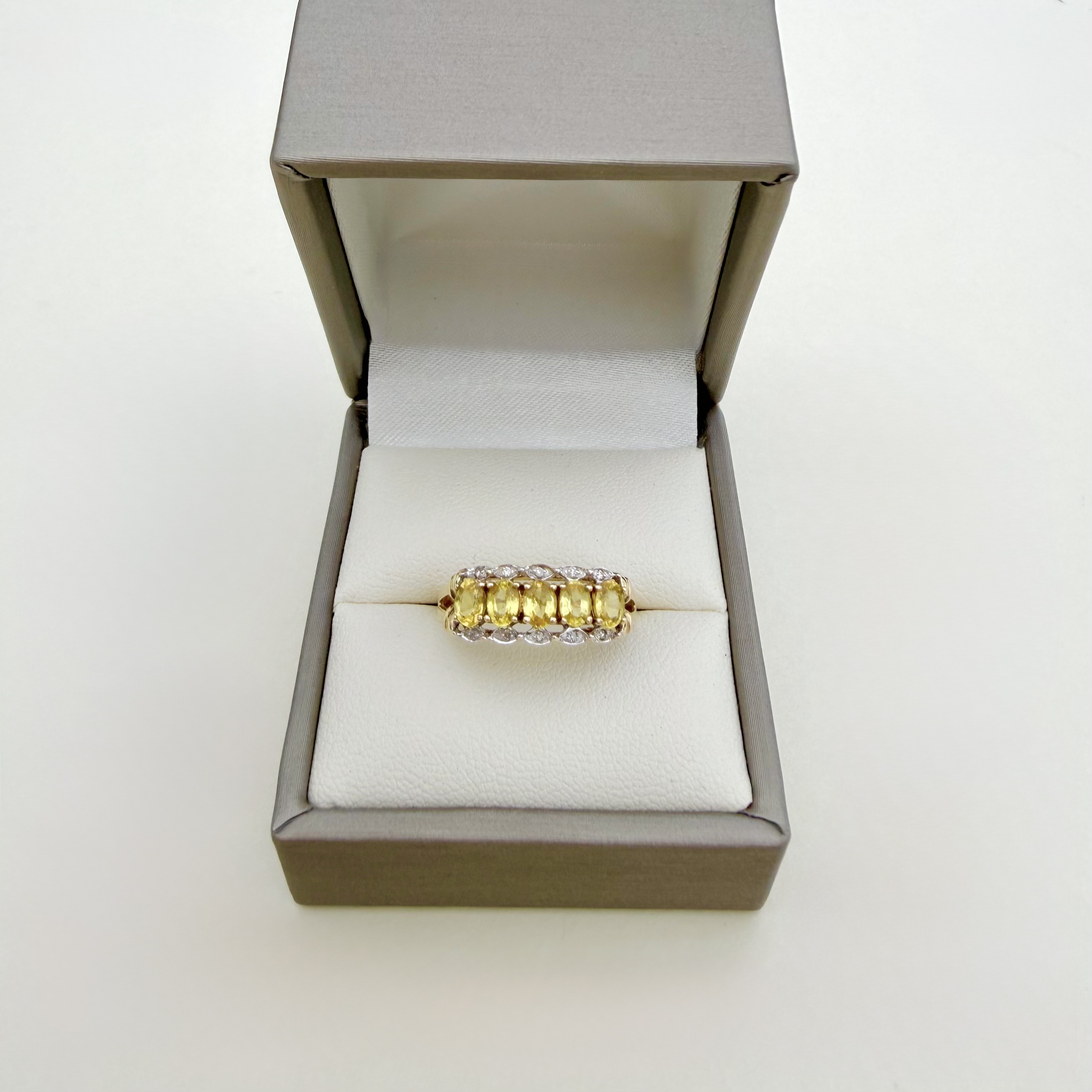 Hallmarked 9ct. yellow gold five-stone ring, exquisitely set with five perfectly matched oval-cut yellow sapphires of exceptional, vibrant colour. Each sapphire is secured in a classic four-claw setting and elegantly framed by a total of ten sparkling diamonds - five on either side - adding radiant brilliance and symmetry to the design.