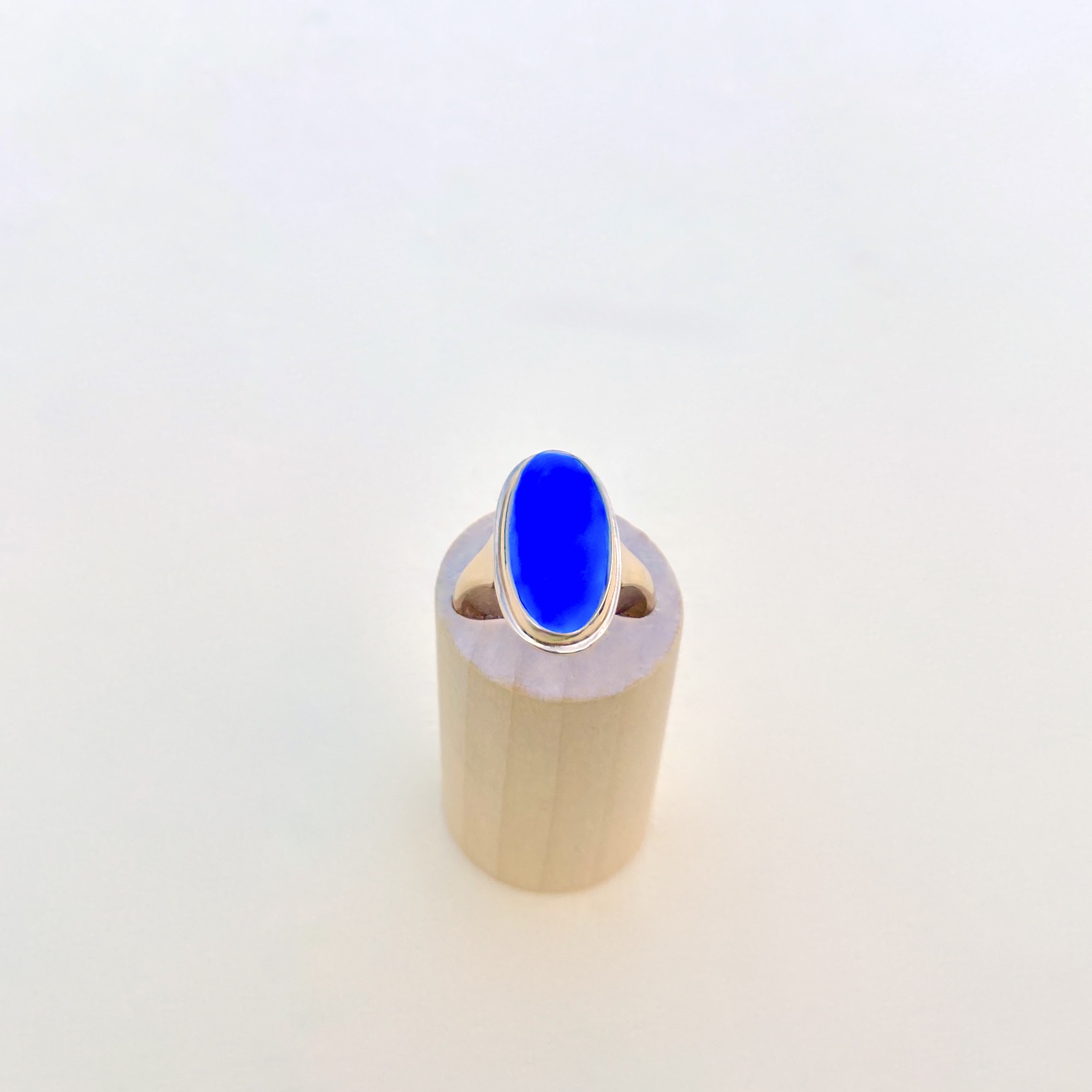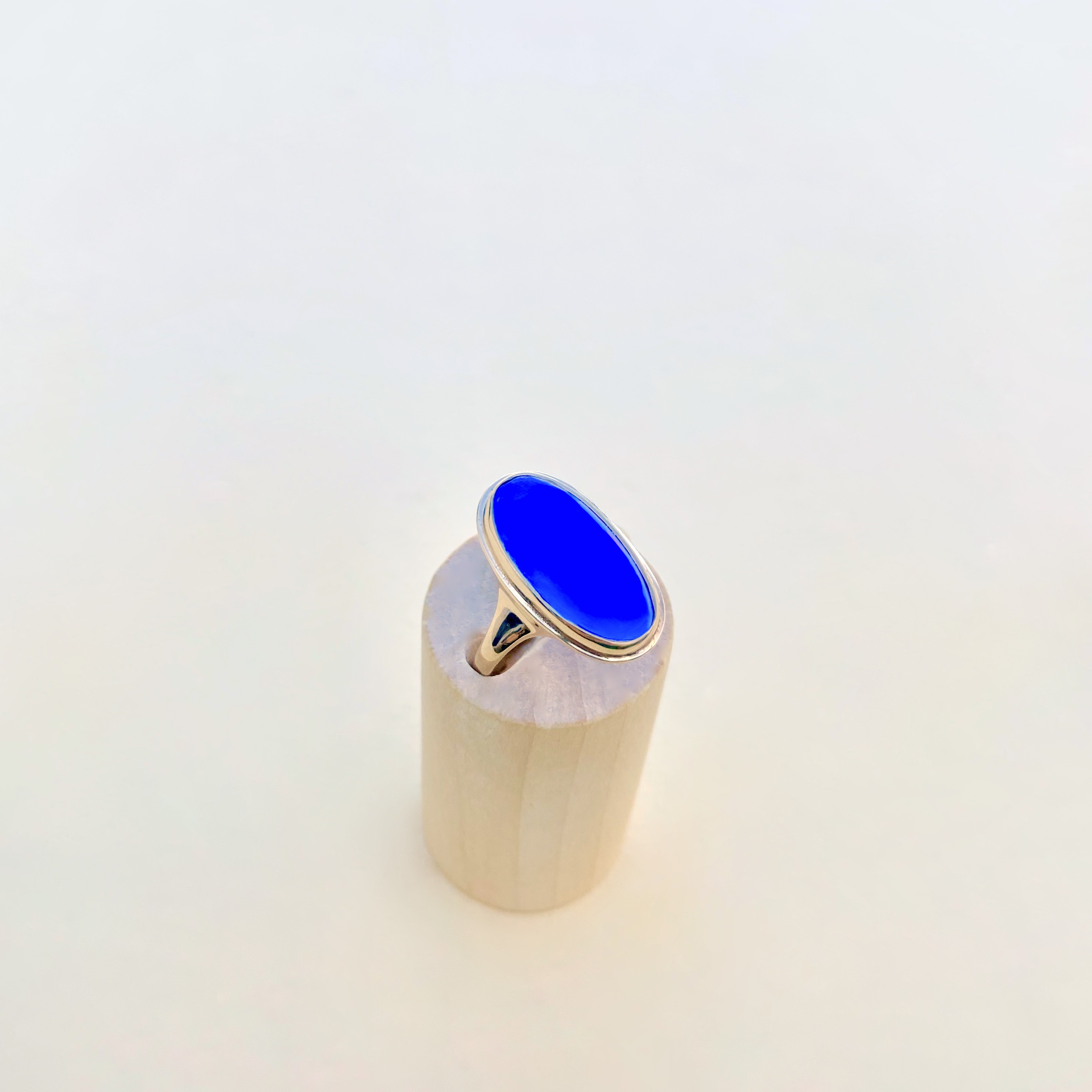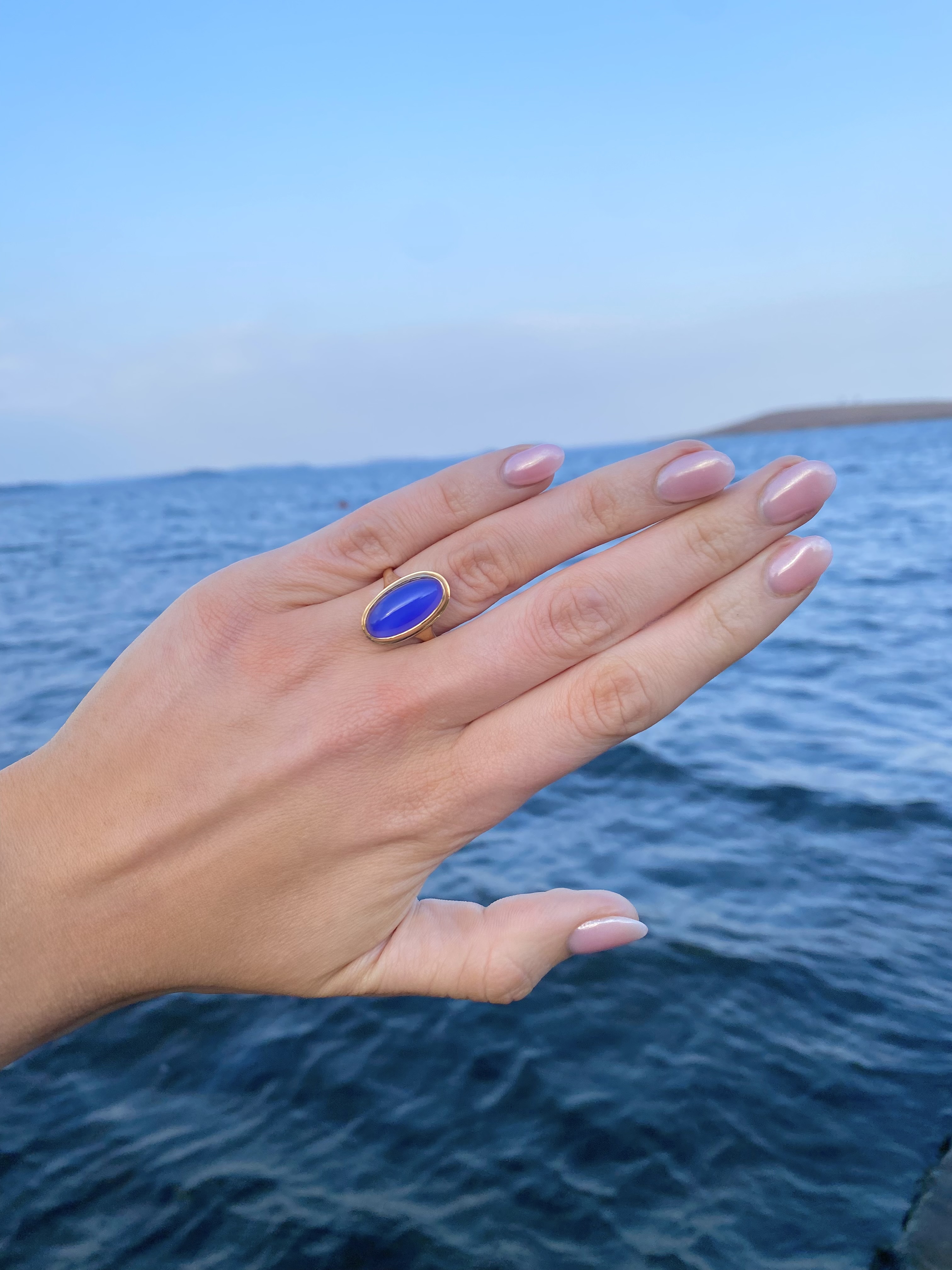 Distinctive vintage 9ct. solid gold ring, featuring a dreamy lavender-blue Chalcedony cabochon gemstone. The oval-cut stone exudes a soft, ethereal glow, perfectly complemented by the warm golden setting. Quality piece. Top of ring measures 19.9mm. (= 1.9 cms. / 0.78”) X 11.72mm. (= 1.17 cms. / 0.46”). Fully hallmarked. Weight: 4.27 gms. Size: M¼.