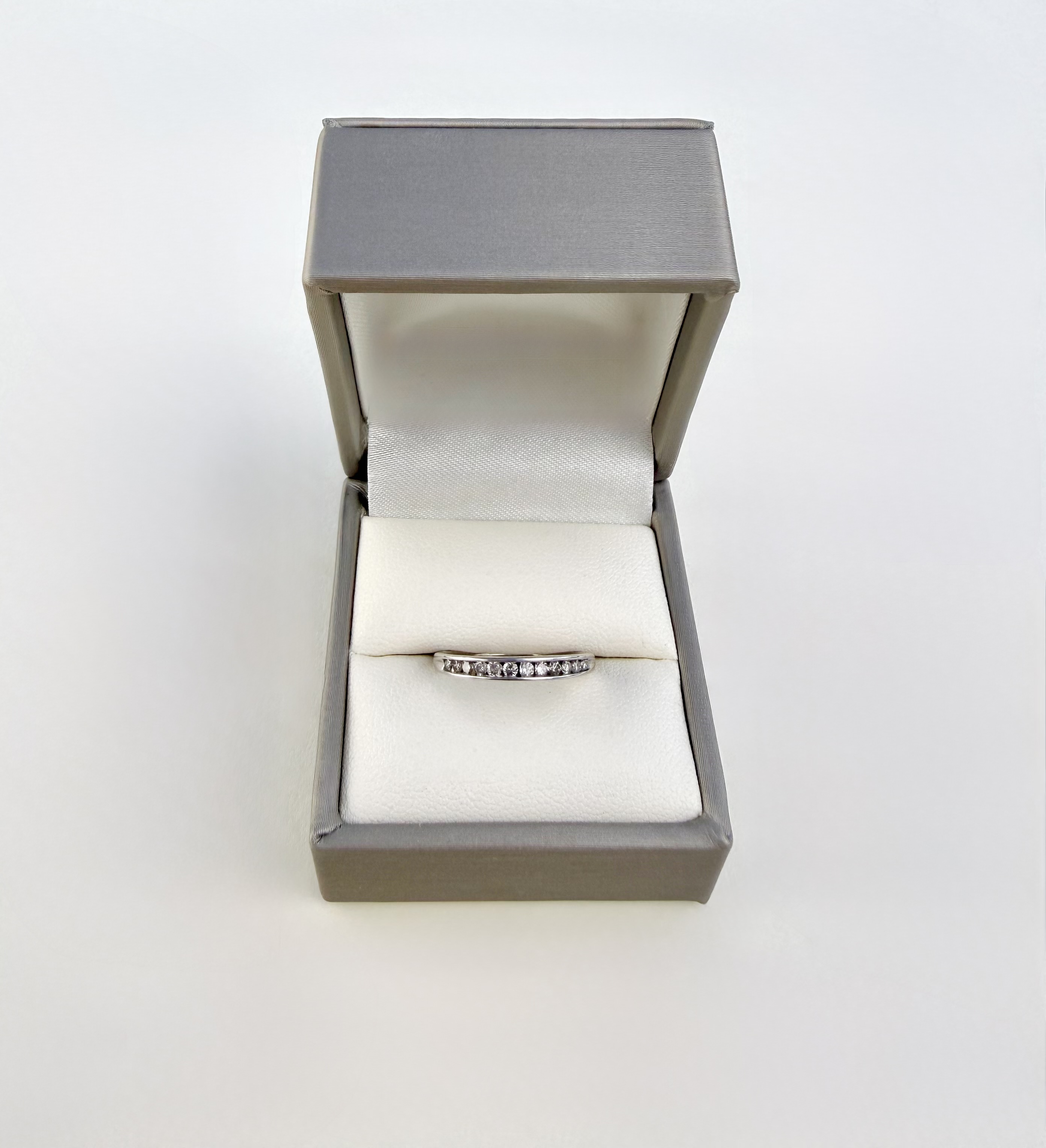 Elegant 9ct. white gold diamond channel-set half eternity ring. The sleek channel setting securely holds a row of sparkling diamonds, creating a smooth, refined finish that is both stylish and comfortable for everyday wear.