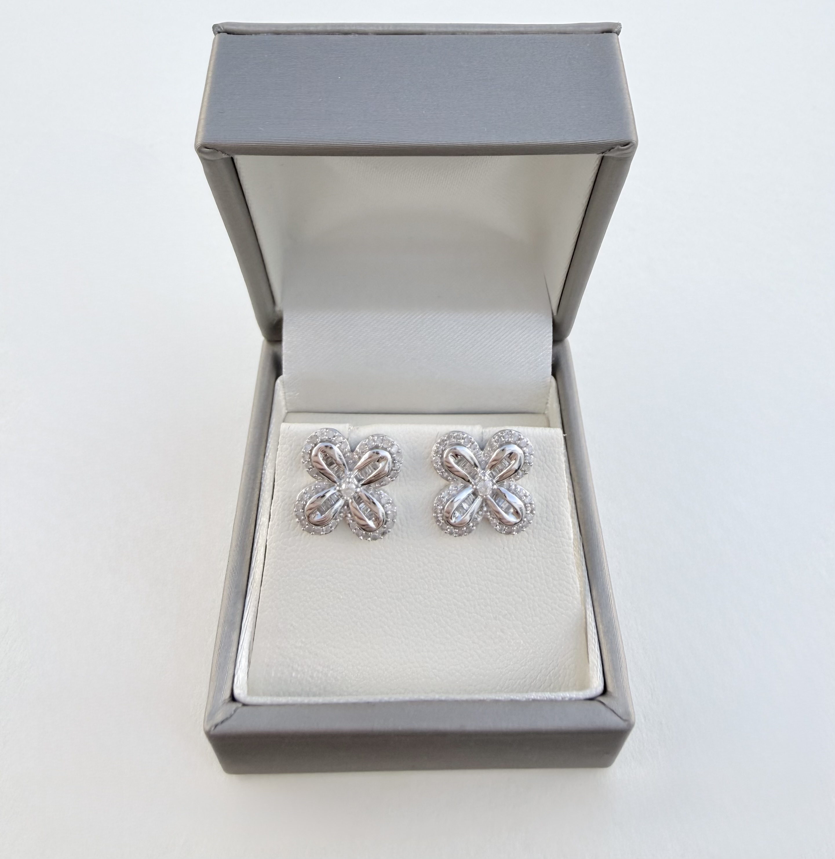 Exquisitely crafted pair of four-leaf floral Diamond cluster stud earrings, each featuring a central round brilliant-cut natural diamond. The centre stone is beautifully framed by twenty tapering baguette-cut diamonds, which are further encircled by thirty-six 8 cut diamonds, creating exceptional sparkle and depth. All diamonds are 100% natural, with a total diamond weight of 0.60 carat. The earrings are expertly set in hallmarked 9ct. white gold, assayed in Birmingham in 2015, with sponsor’s mark CR. For pierced ears with butterfly backs. Each measures approx: 12.25mm. X 12.25mm. (= 1.22 cms. / 0.48"). V: 890. Weight: 3.61 gms.
