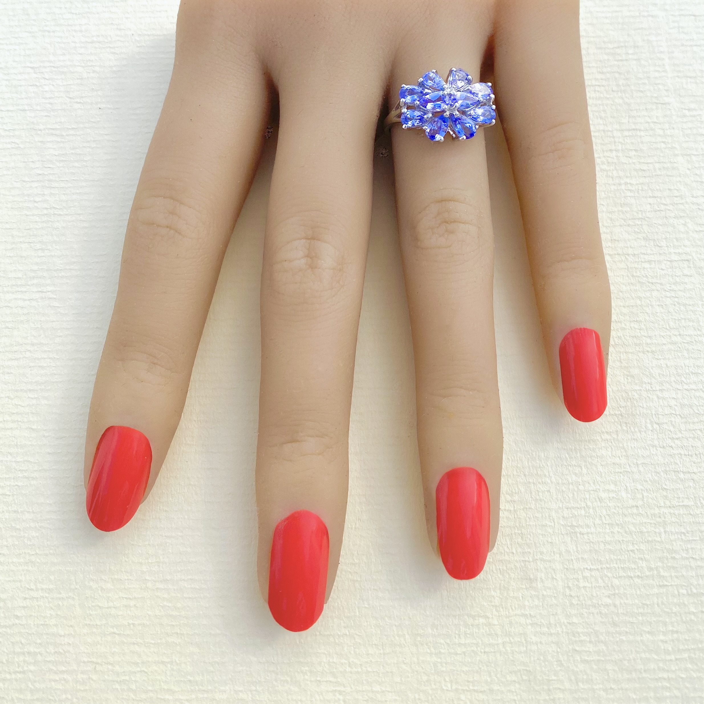 High-quality 9ct white gold Tanzanite cluster ring, designed to captivate. Showcasing 10 exquisite pear-cut Tanzanites - two at the center, encircled by eight in a stunning floral-inspired design - this ring radiates elegance and charm. The vibrant purple-lavender blue hues of the Tanzanites shimmer beautifully against the sleek white gold setting. A perfect gift for any occasion! Weighs: 3gms. Size: N (= USA: 7. EU: 53½) .