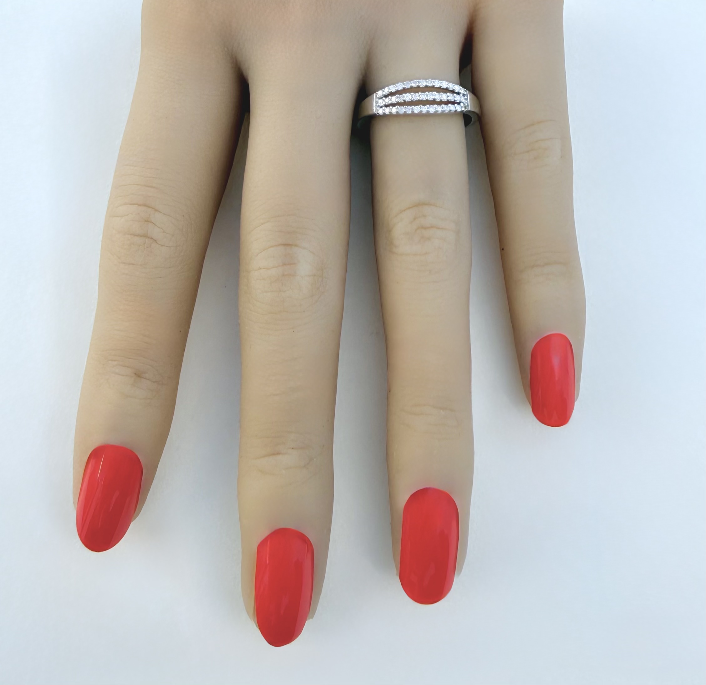 Hallmarked 9ct. white gold three-row half eternity ring, featuring a stunning arrangement of approximately 40 brilliant-cut diamonds. The diamonds are set horizontally - in an elongated oval design - across three distinct rows, creating an eye-catching sparkle that reflects the light beautifully.