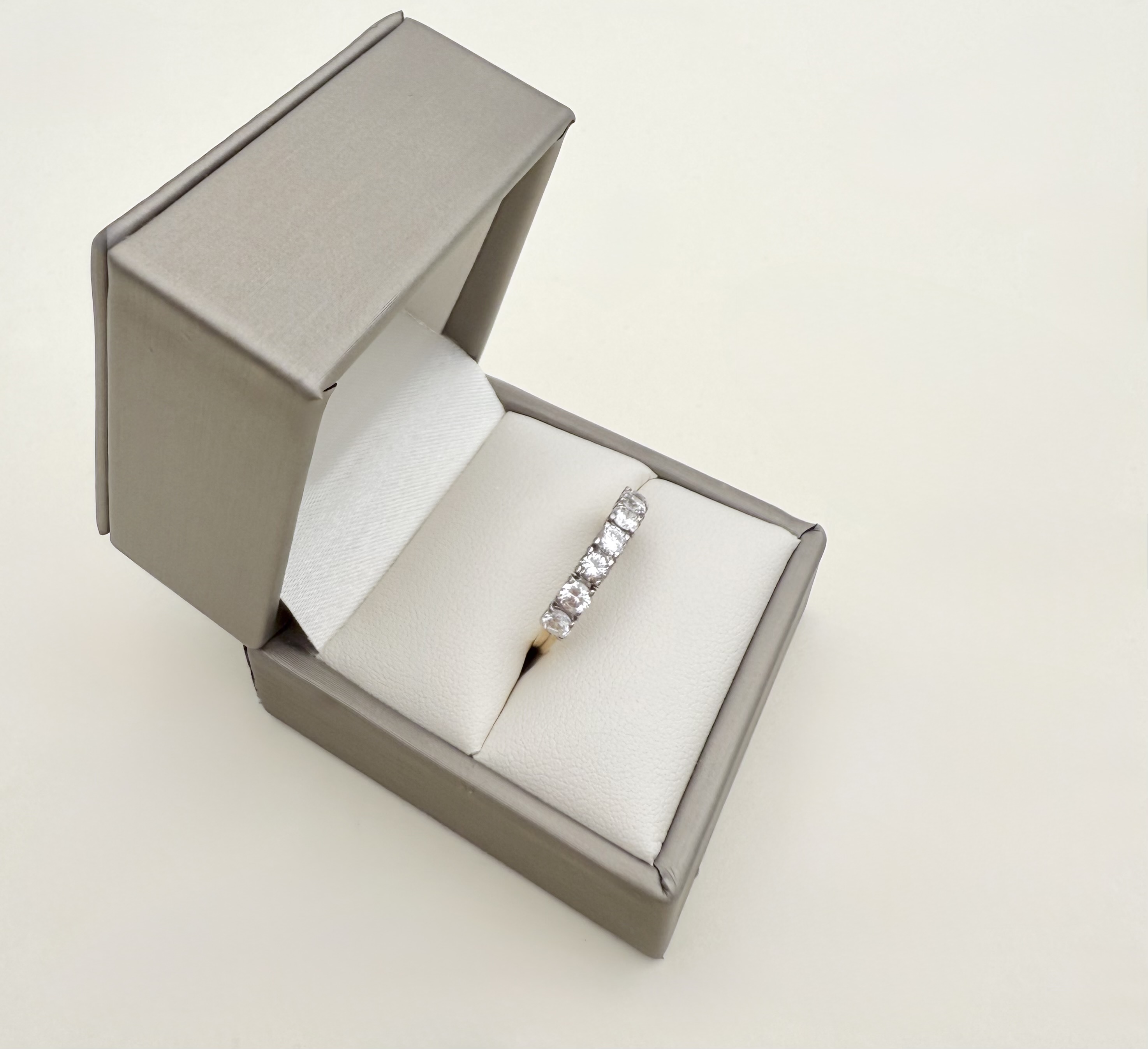 Hallmarked 9ct. yellow gold half eternity ring, beautifully set with five sparkling cubic zirconia. Perfect as a stacking ring or a standalone piece, it adds effortless shine to any jewellery collection. Crafted for everyday wear, this versatile ring would make an ideal gift. Size: N¼. Depth of ring head: 3.59mm.