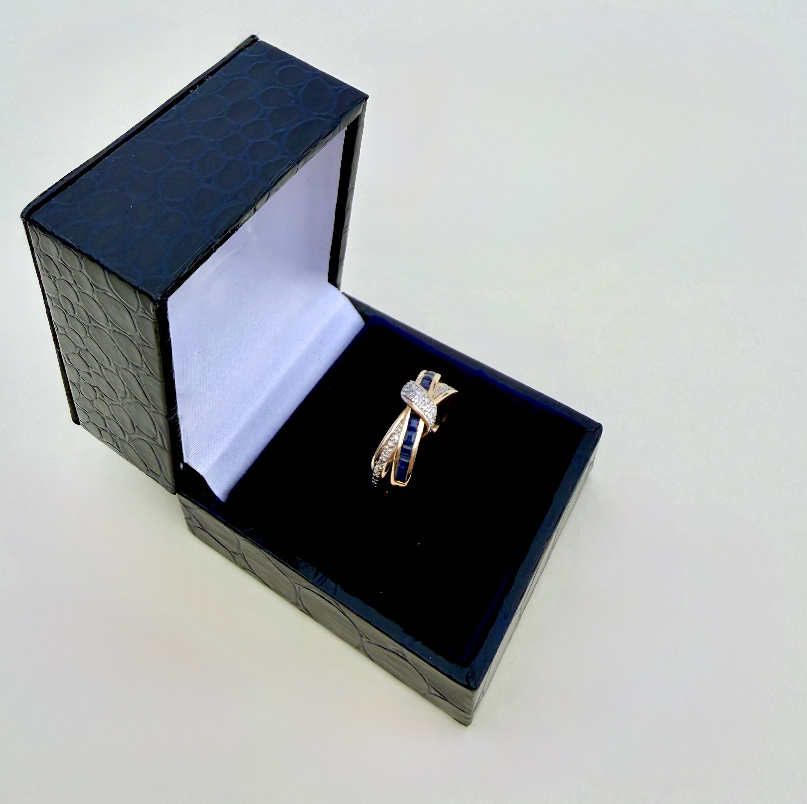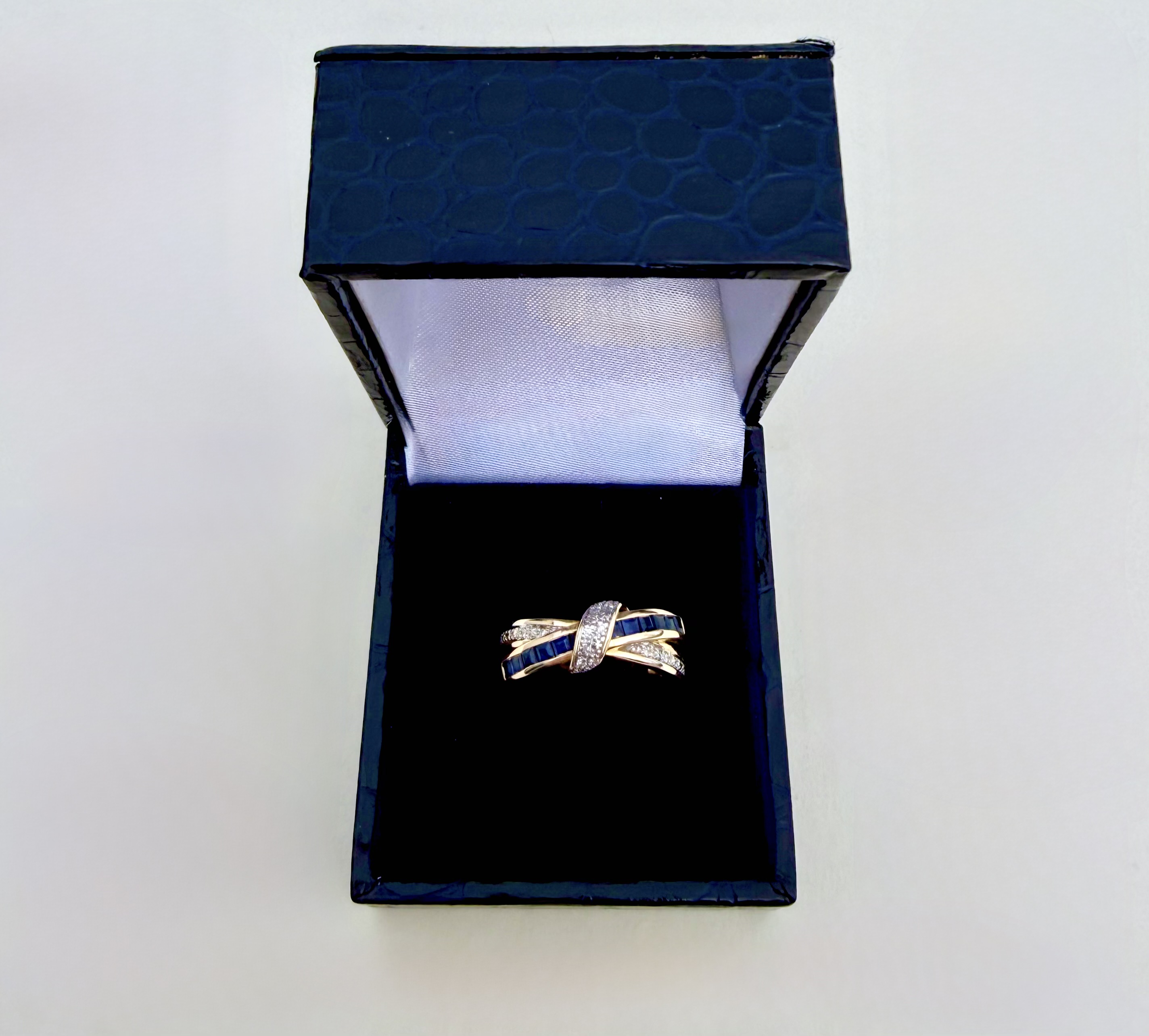 Elegant and eye-catching, this 9ct. gold double band ring features a striking interplay of colour and sparkle. A channel of 12 square-cut mid-blue sapphires runs seamlessly across one band, intersected by a shimmering diamond accent band and finished with a graceful crossover diamond detail at the centre crown.