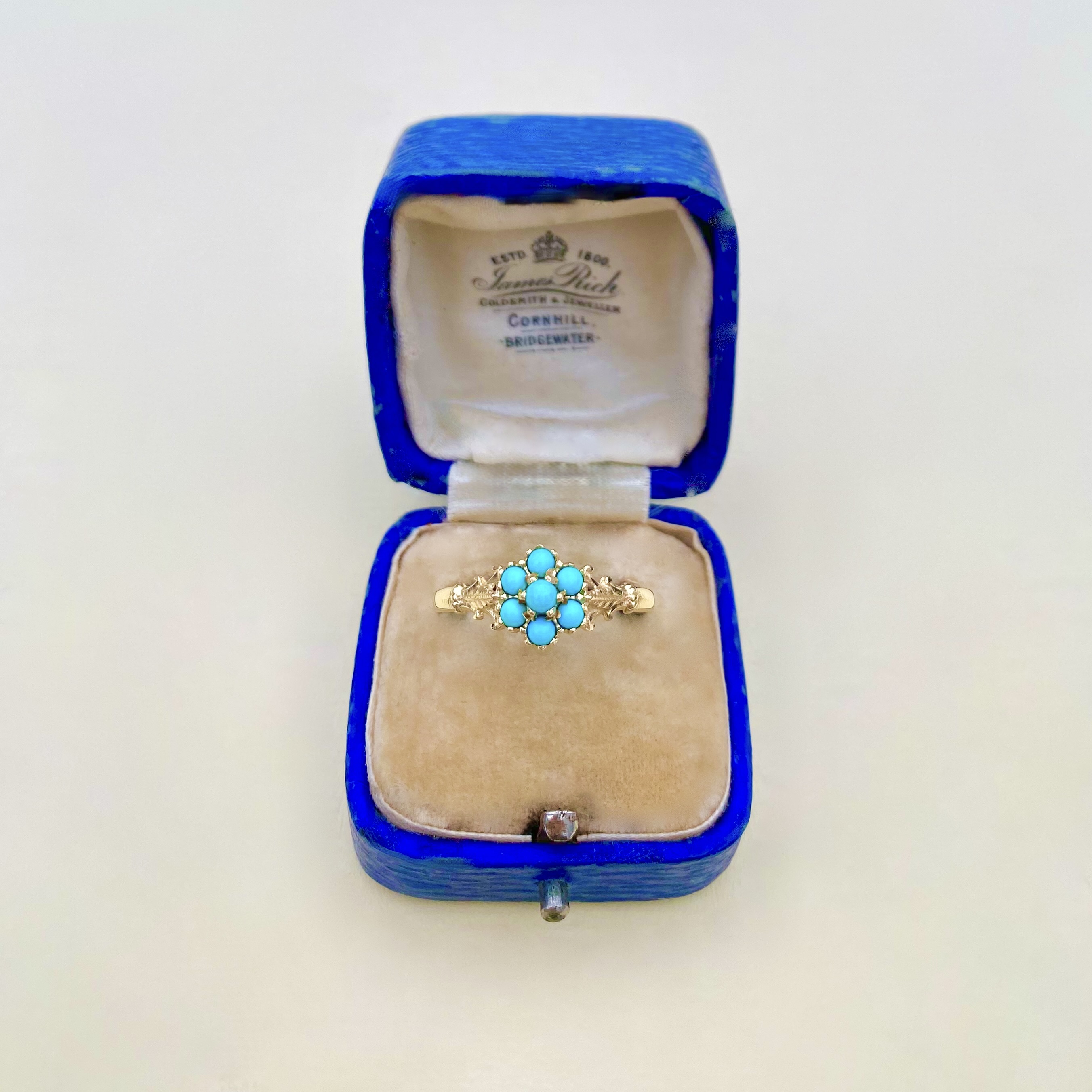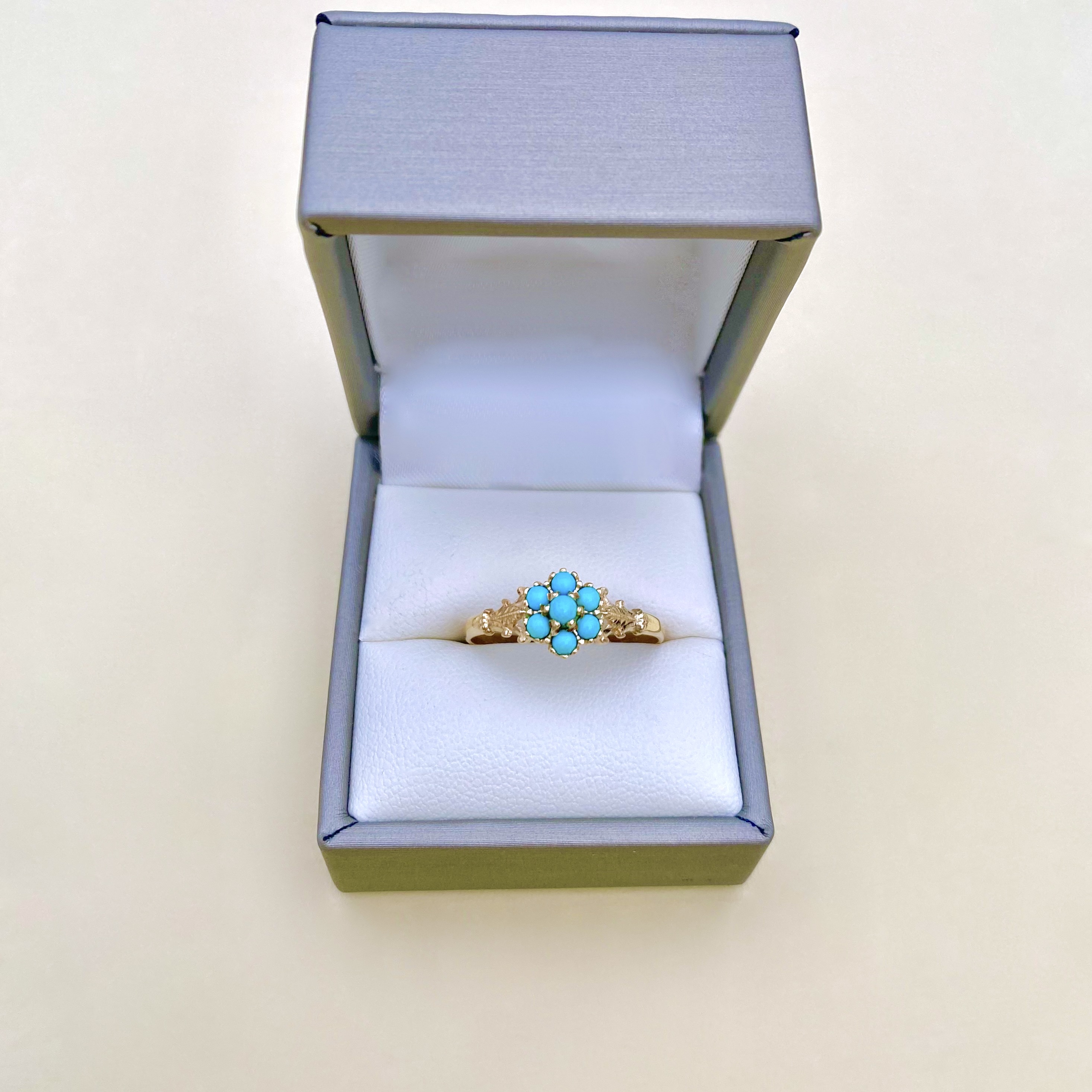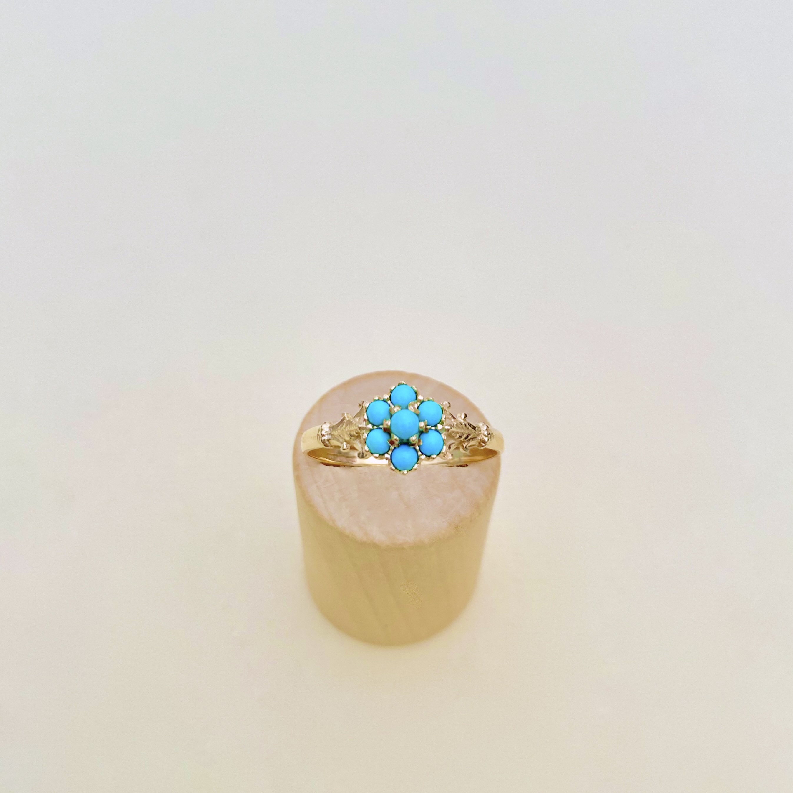 This charming Antique 9ct yellow gold ring, features a stunning cluster of seven circular turquoise cabochons, beautifully framed by intricate acanthus leaf detailing on each shoulder. The simple, plain gold band enhances the overall elegance of the design. Hallmarked with a sponsor mark for CL&S? = Charles Lyster & Son, this piece is believed to date from the late 19th to early 20th century, potentially spanning the Victorian to Edwardian eras. Size: V¼. USA: 11. EU: 63 +. Head diameter measures: 8.57mm. (= 0.85cms. / 0.33”).