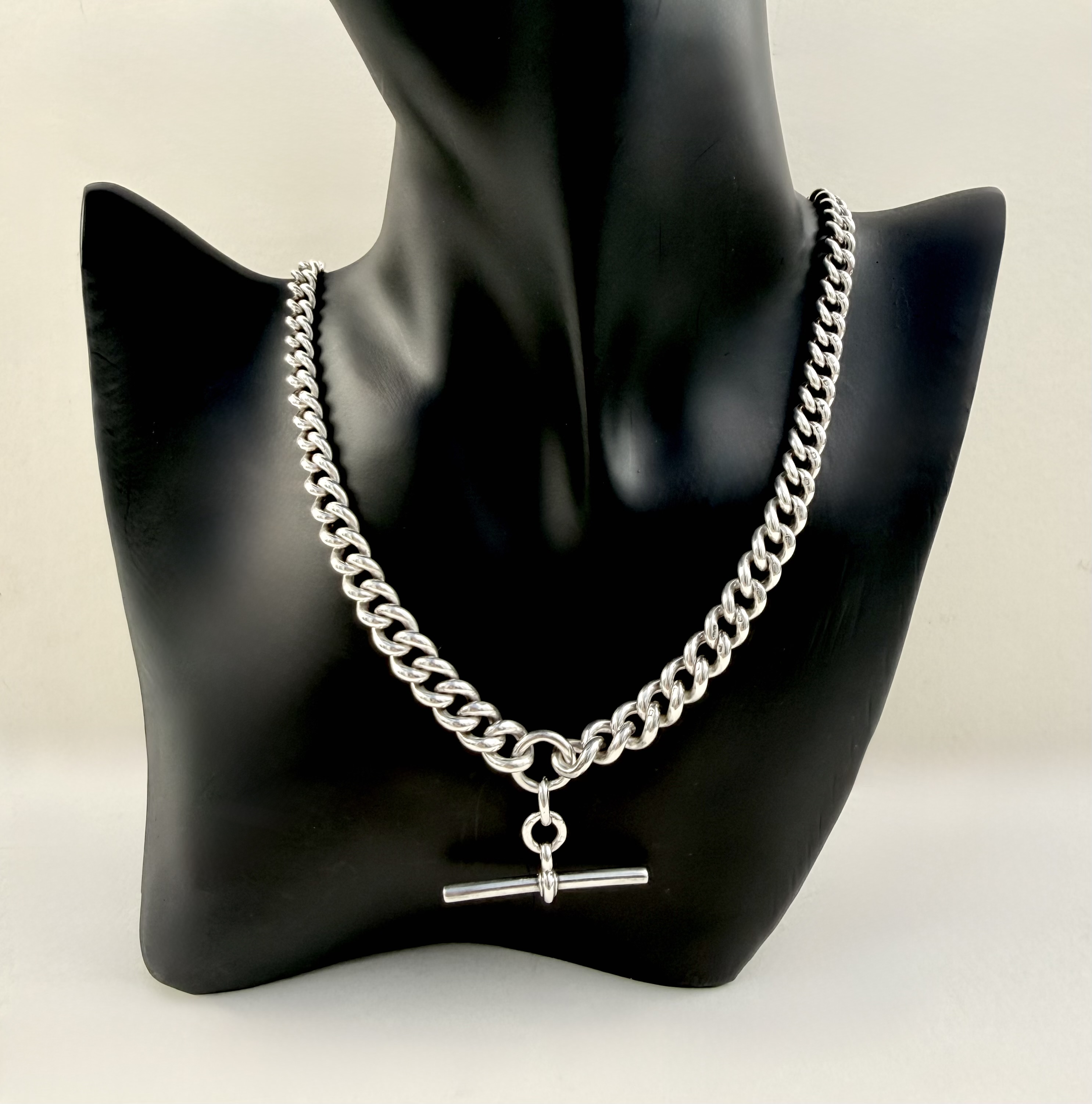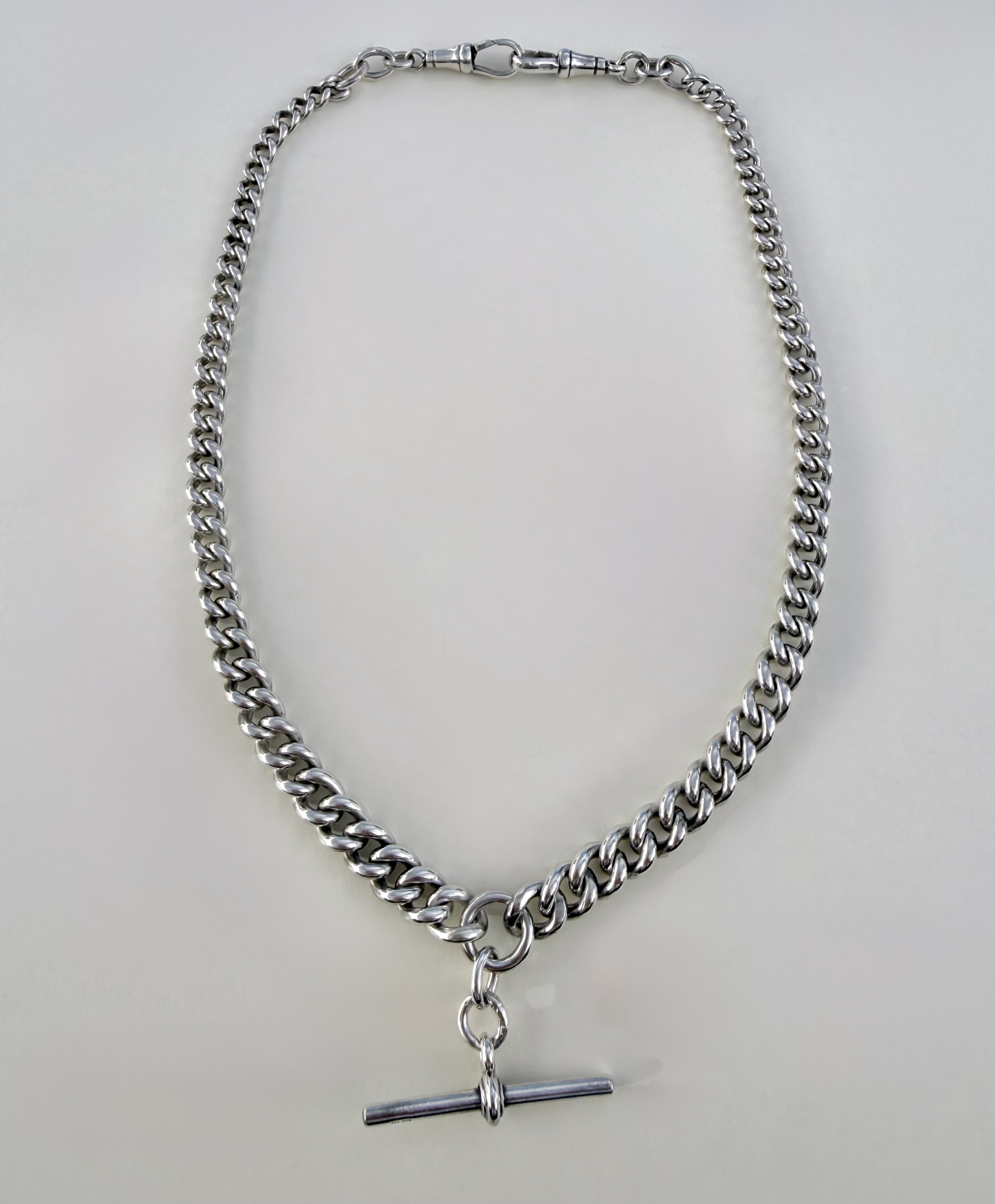 An exceptional Antique graduated sterling silver Albert chain, featuring a classic central T-bar and secured with two original dog clips. Elegantly proportioned and beautifully weighted, this fine example is fully hallmarked throughout with the lion passant and the Sponsor’s mark H B&S, likely to be attributed to Herbert Bushell & Son Ltd. and assayed in Birmingham.