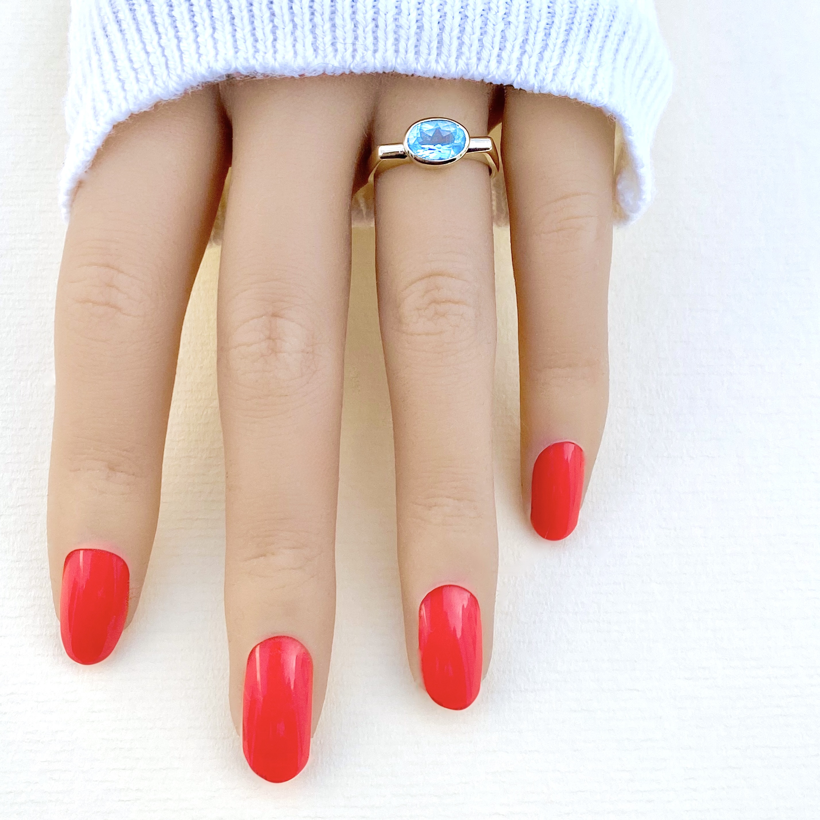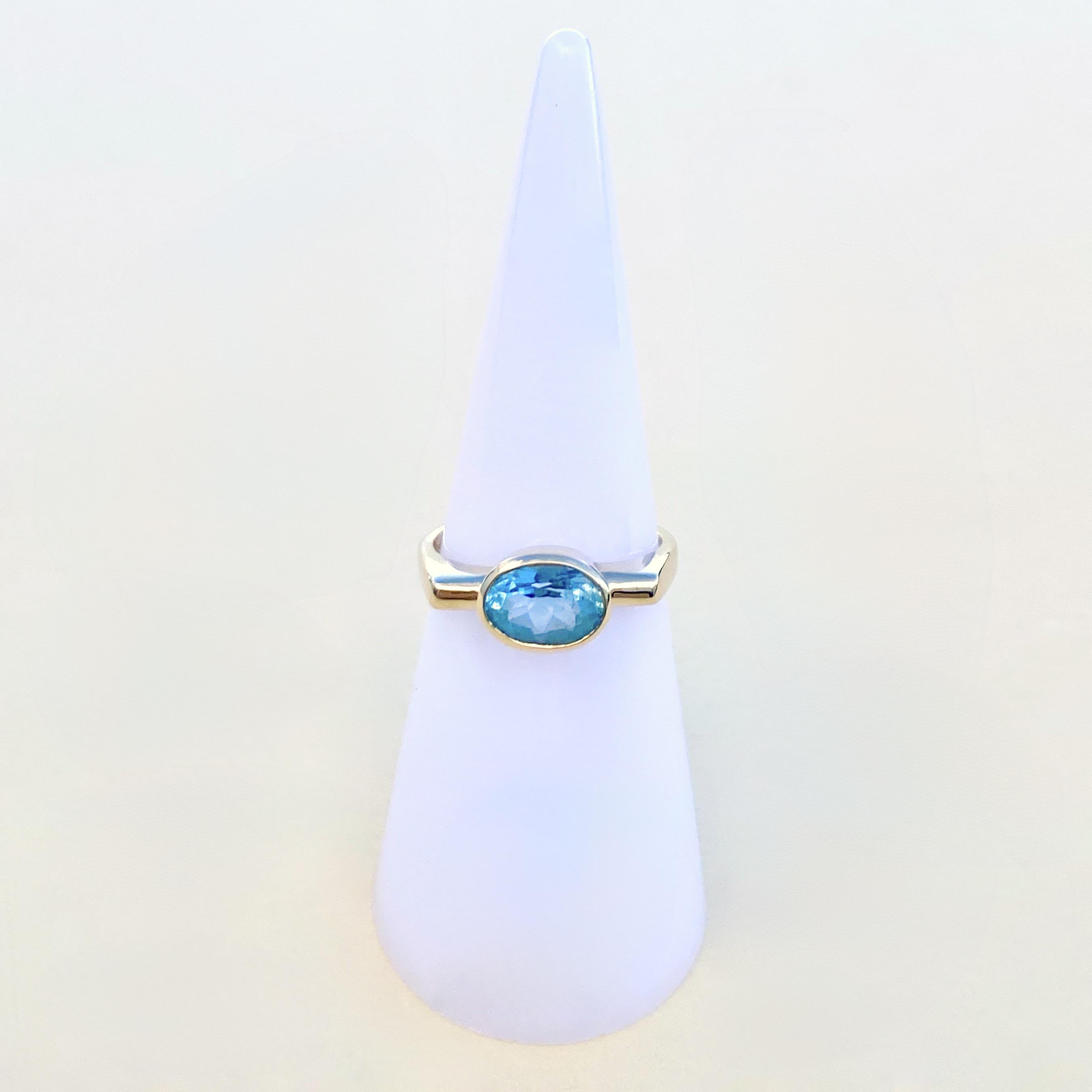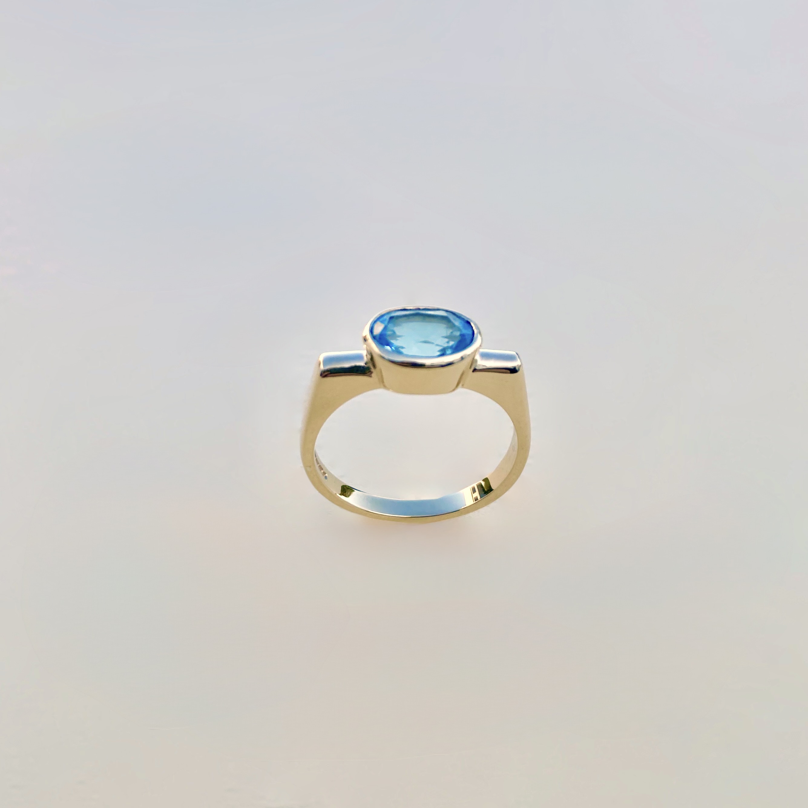Hallmarked 9ct. Solid Gold Ring, crafted in a contemporary design that exudes sophistication. With squared, sturdy shoulders that enhance its modern design, it’s a piece that radiates contemporary elegance. At its heart, a stunning  oval faceted Sky Blue Topaz sits securely in a sleek 'rubover' setting, ensuring both security and brilliance. A timeless treasure, crafted to perfection and offered at an exceptional price! Size: L¼. Weight: 2.91gms.