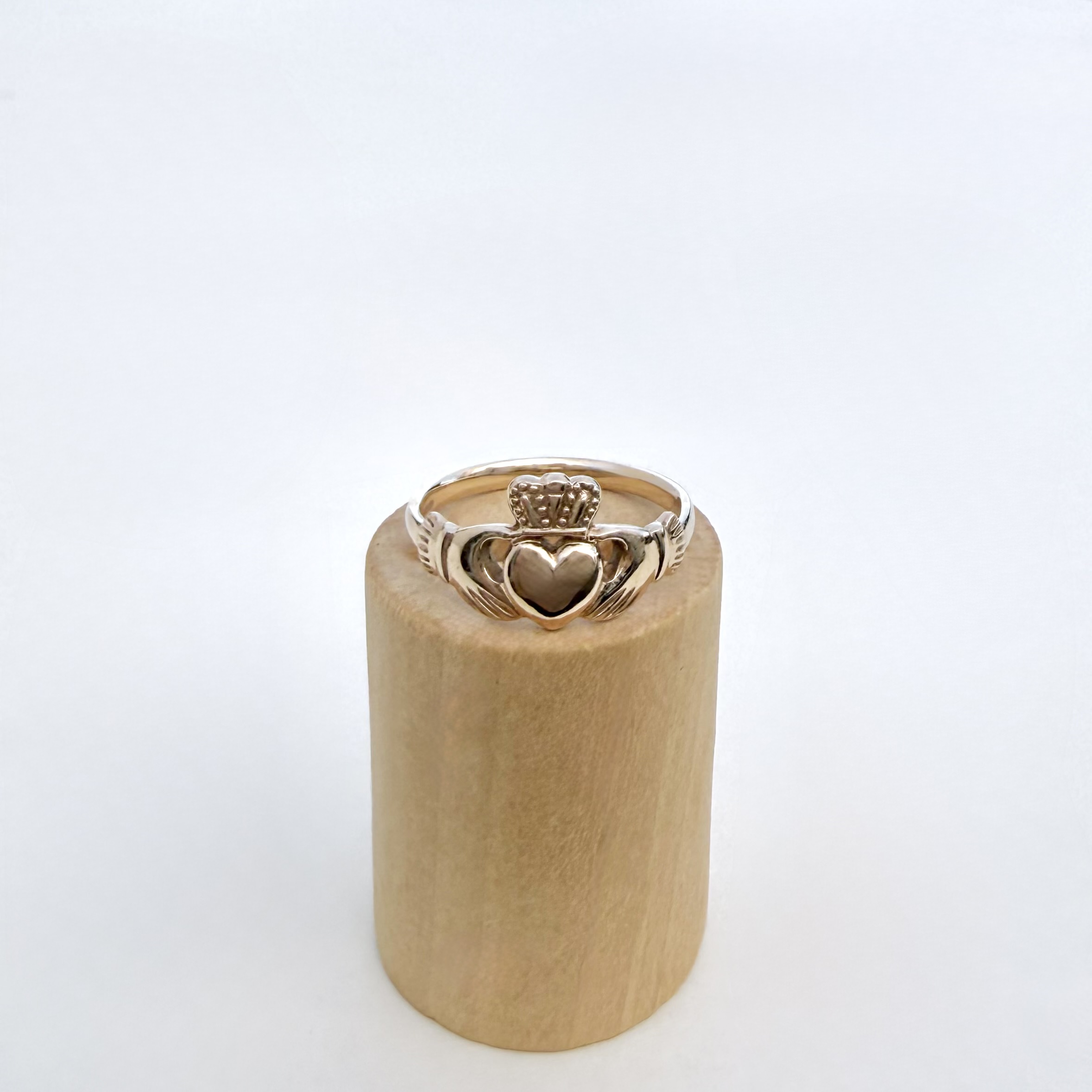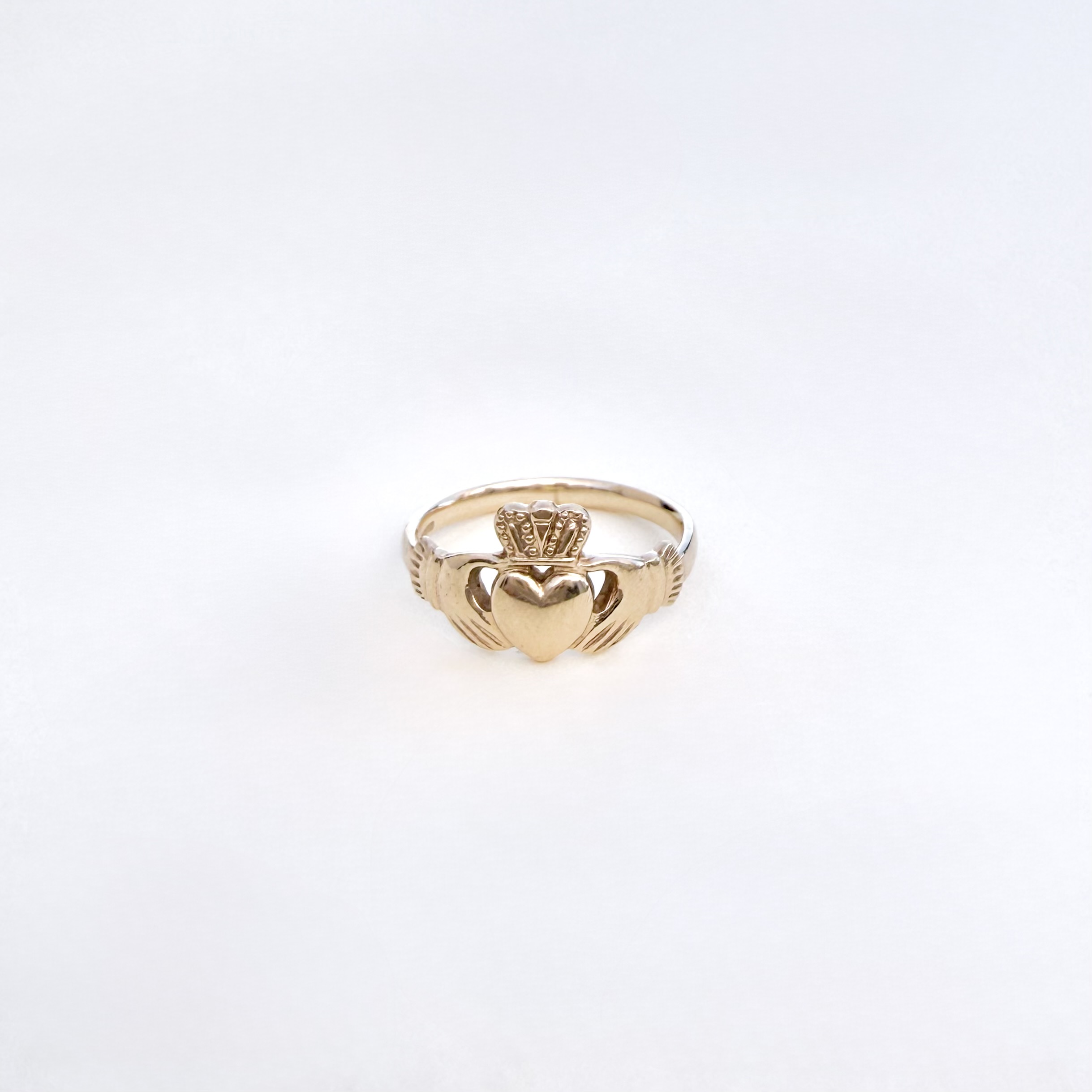 Rooted in romance and tradition, the Claddagh ring originated in 17th. century Galway on the west coast of Ireland. Its iconic design - two hands holding a heart crowned with loyalty - symbolises friendship, love and fidelity. Traditionally crafted in yellow gold, the Claddagh became a cherished token of devotion, worn to express everything from openness to love to lifelong commitment.