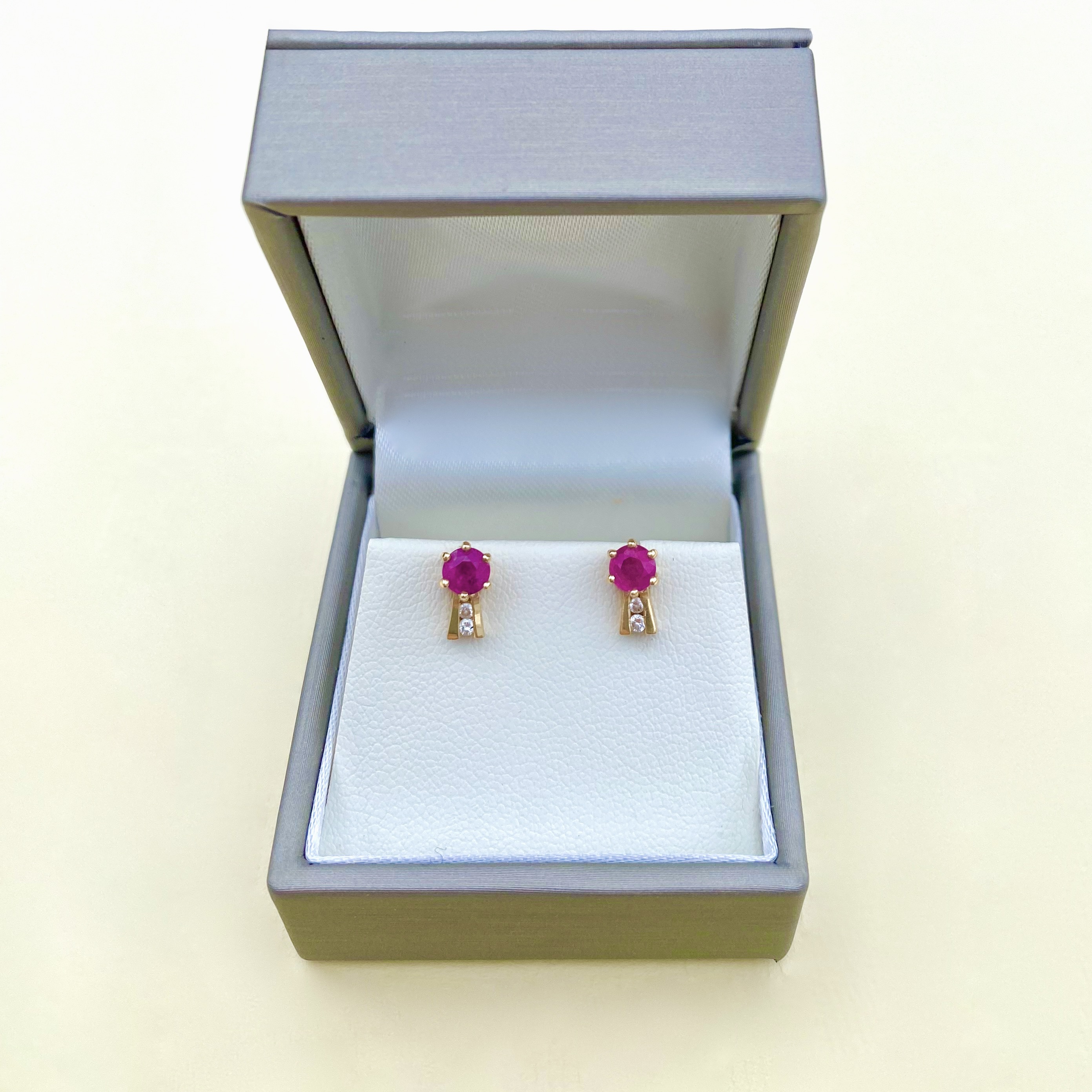 Distinctive pair gold Ruby & Diamond set small stud earrings featuring an exquisite pinkish-red ruby at their centre, elegantly 6-claw set with 2 fan-shaped gold bars to base, set to centre with 2 bright, white and sparkly diamonds (total 4 diamonds combined). Secured with butterfly backs for pierced ears, these earrings combine classic elegance with a modern twist. Earrings are 13ct. gold (tested).
