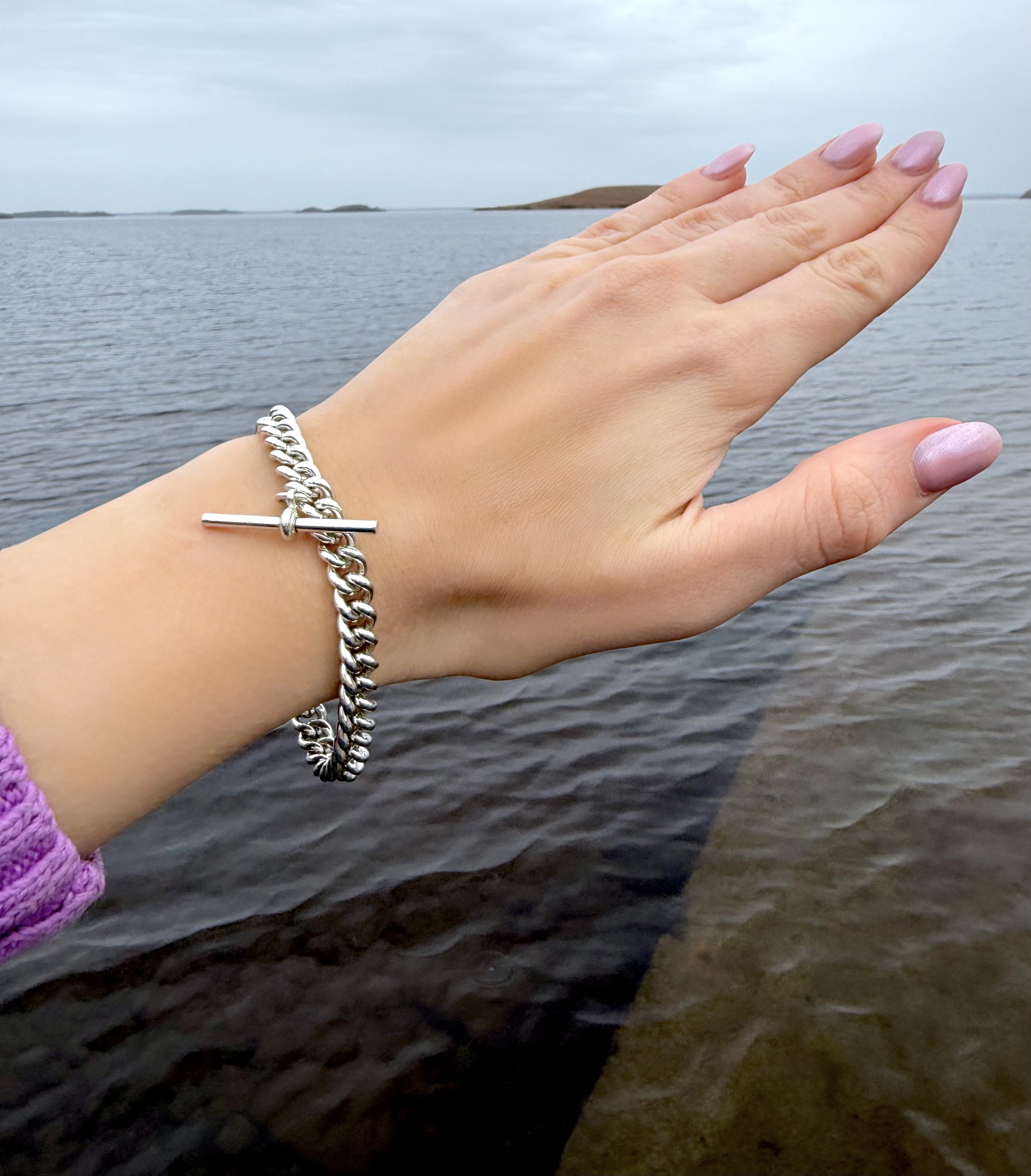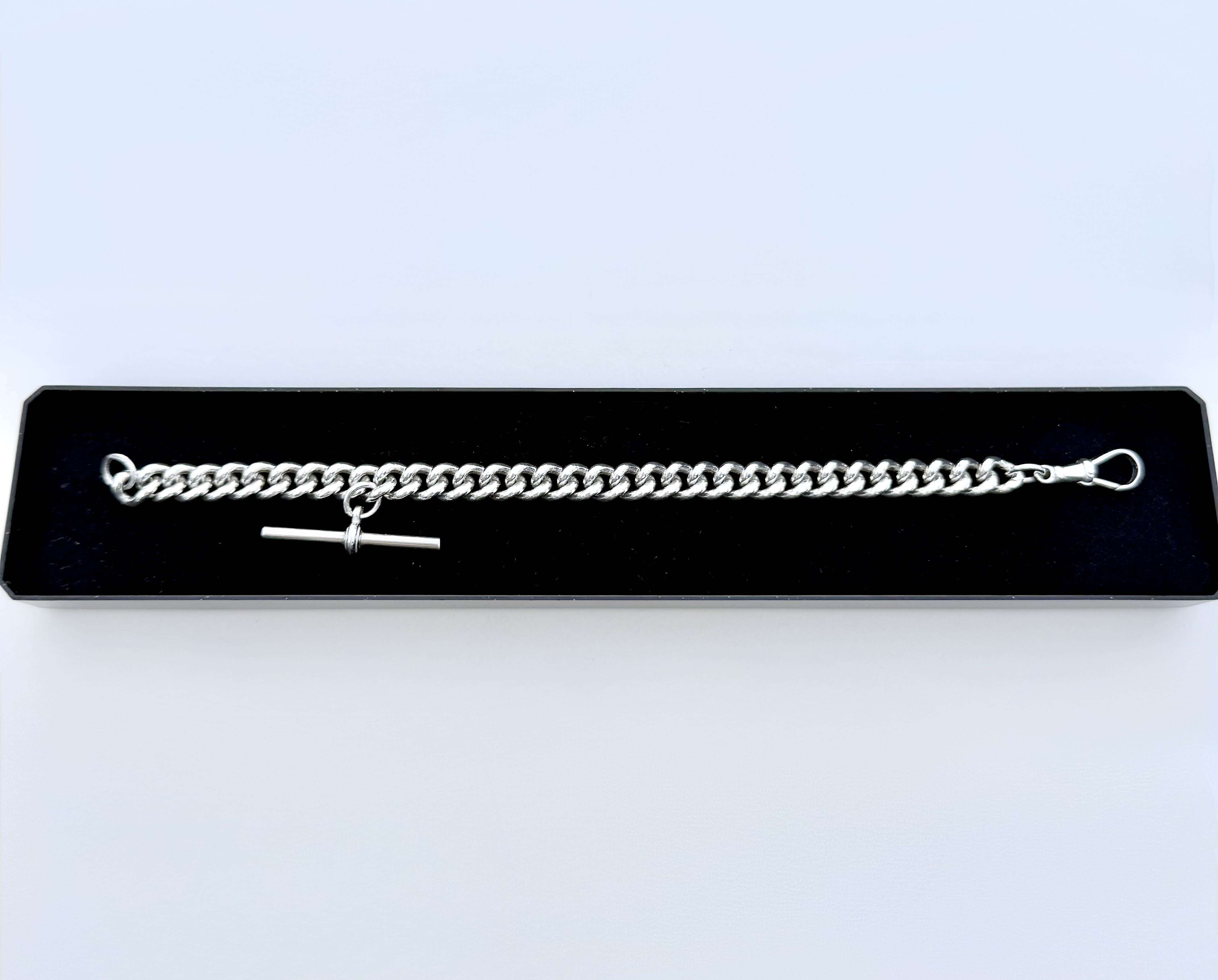 Premium sterling silver Albert watch chain bracelet. Featuring classic interlocking links and a distinctive T-bar detail suspended from the chain, it delivers a heritage-inspired look. The polished links reflect the light beautifully, creating a rich, luxurious shine that enhances its appeal. A secure lobster clasp ensures a comfortable and reliable fit for everyday wear. A quality statement piece that pairs effortlessly with both formal and casual outfits.