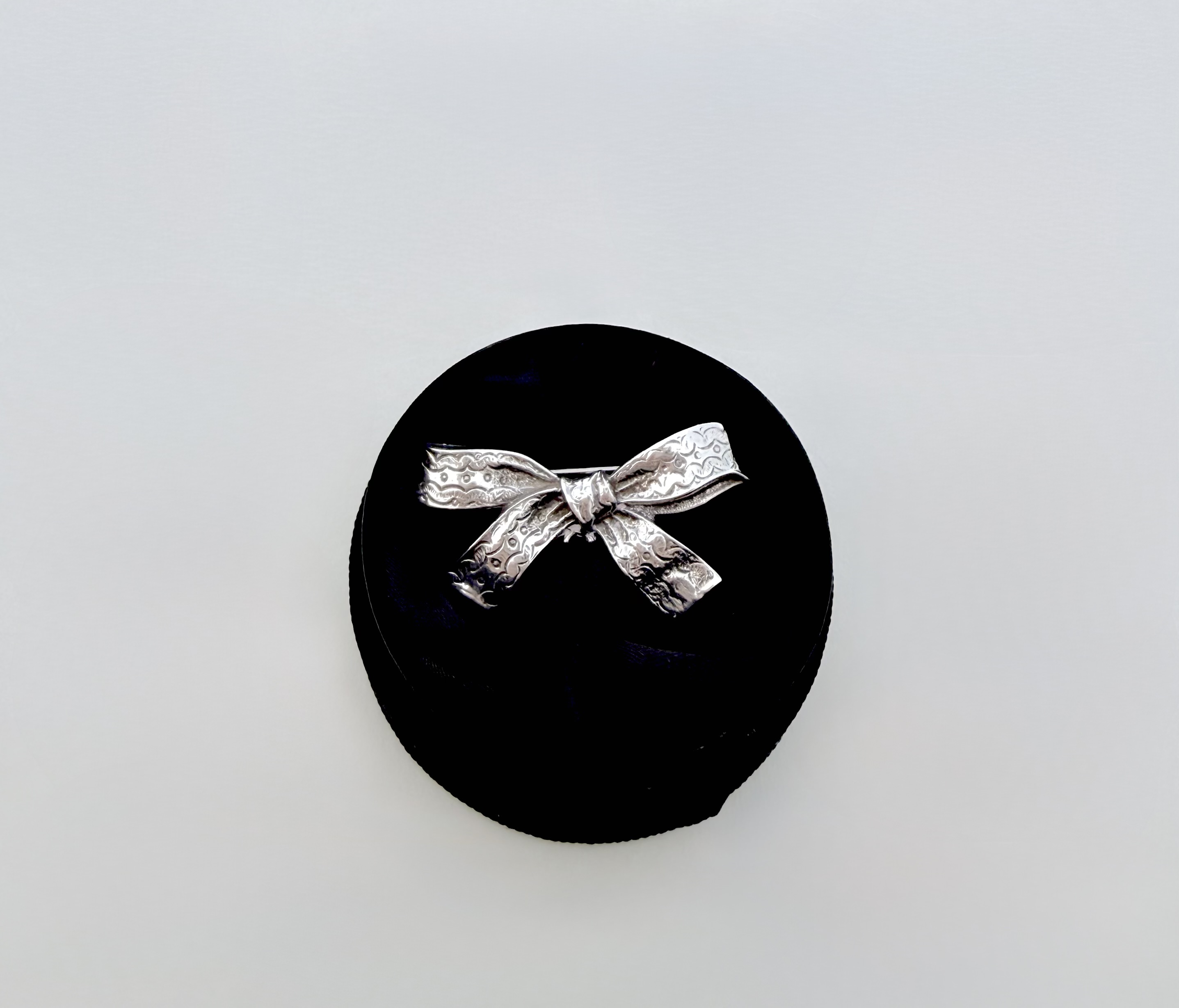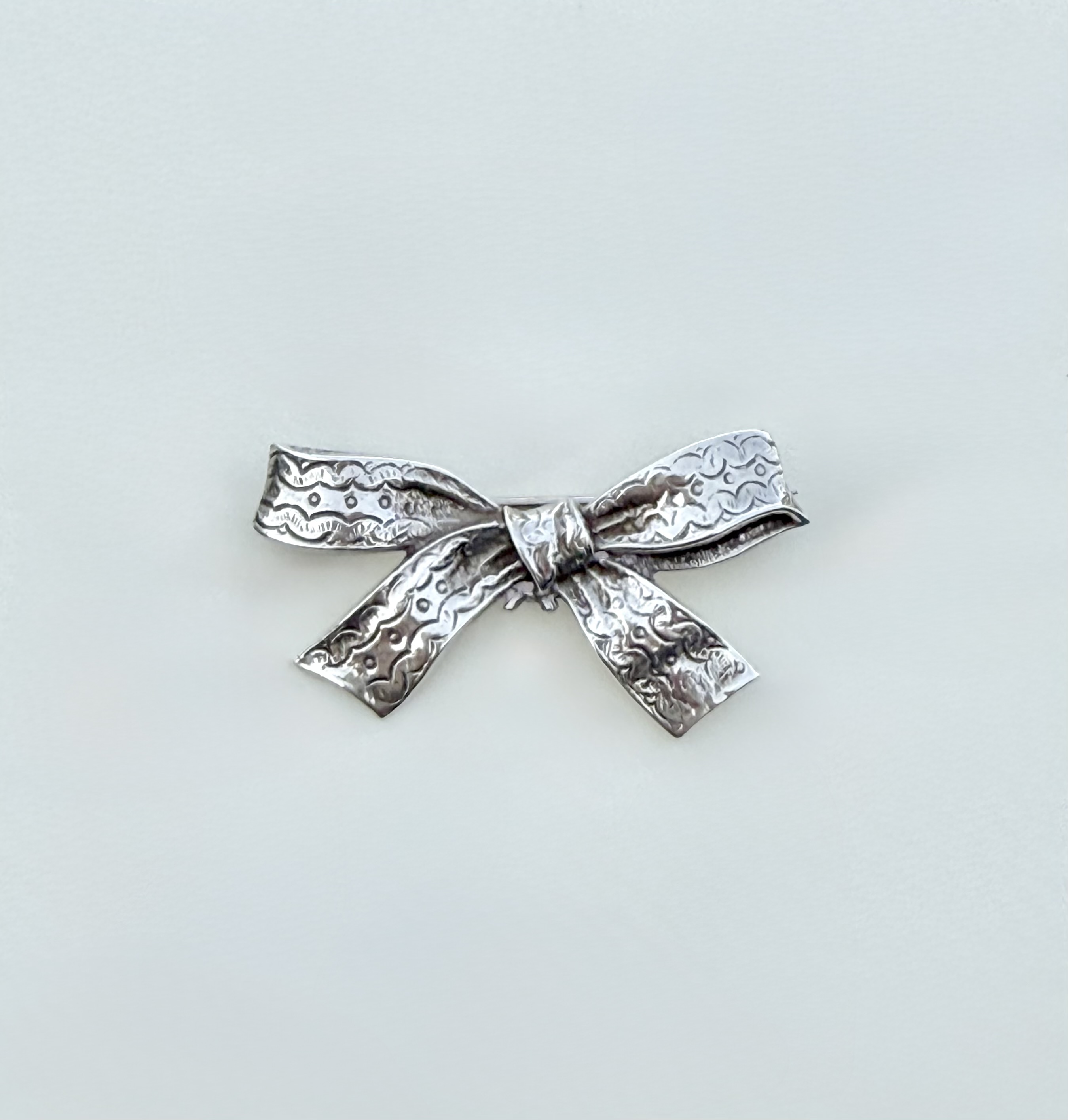 An elegant sterling silver bow Brooch, beautifully crafted with intricate scrollwork detailing across the surface for a refined, timeless look. Designed with versatility in mind, it could also be worn as a pendant - thanks to a discreet ring attachment at the top reverse.