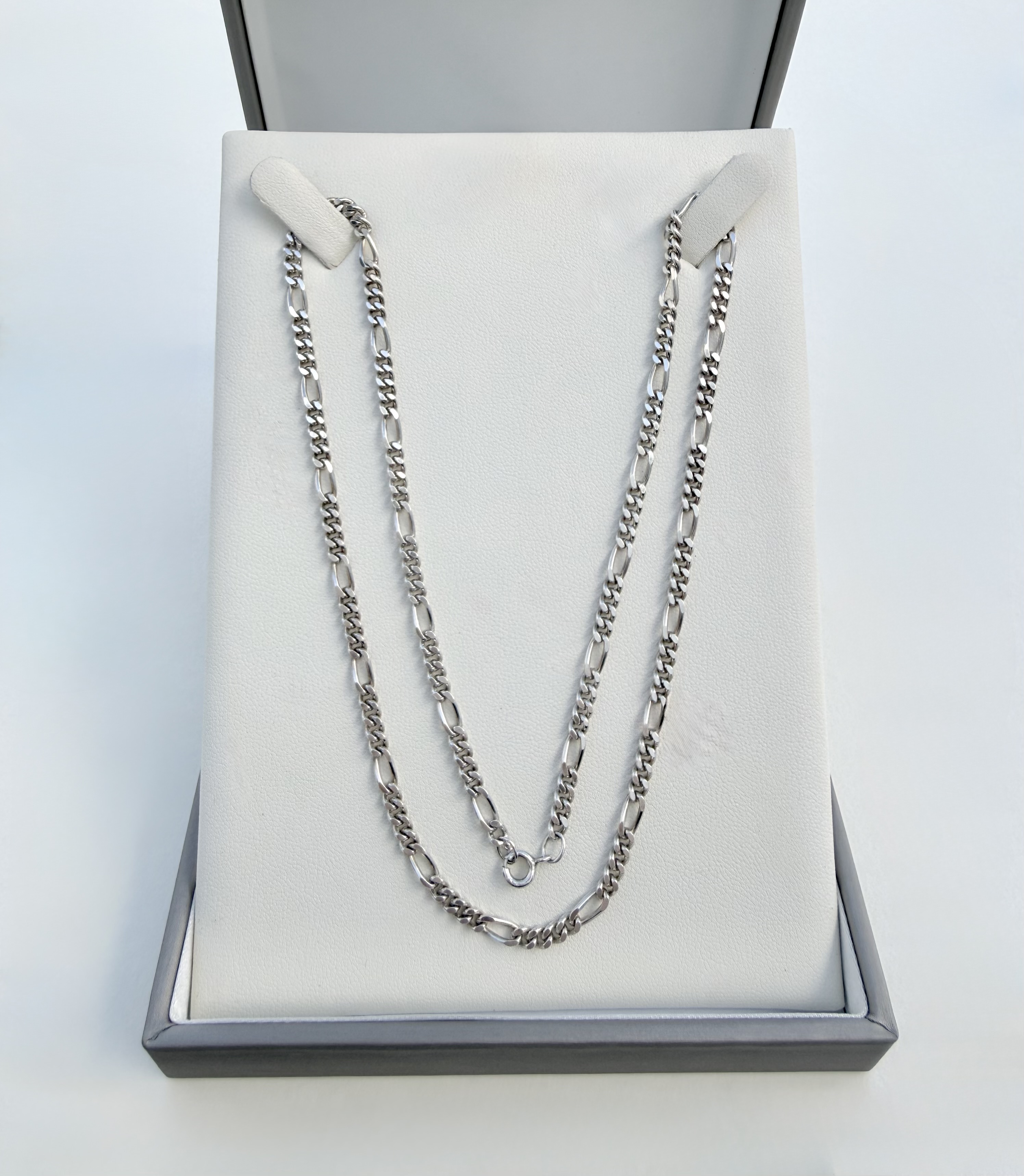 Attractive sterling silver Figaro chain. Measuring 51 cms. (= 20”) in length, it features beautifully crafted links approximately 3.5 mm wide, offering the perfect balance of subtlety and presence. It is secured with a bolt ring clasp. This necklace combines durability with a luxurious feel, making it a versatile addition to your jewellery collection - your go-to necklace for any occasion.