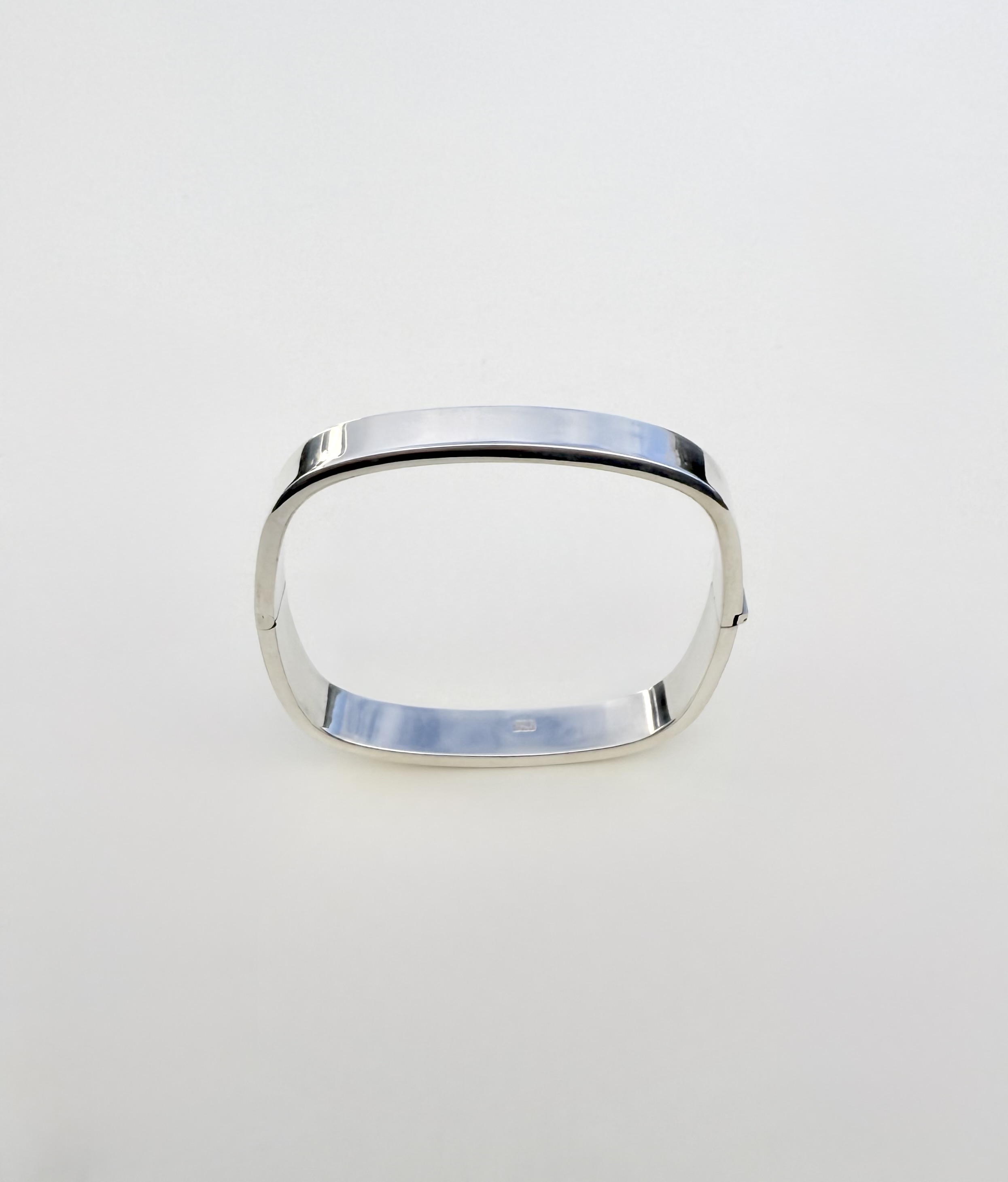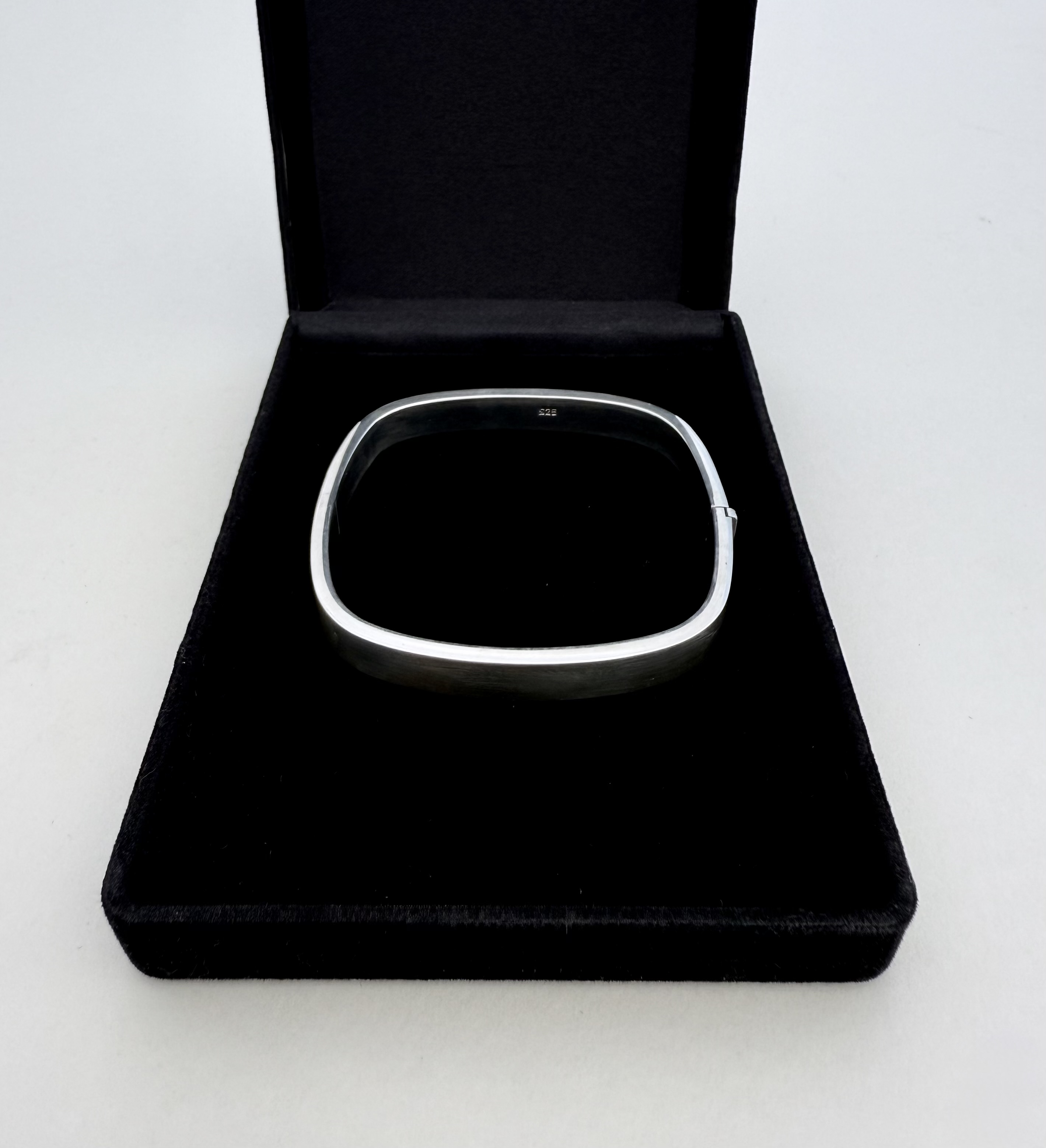 Sterling Silver Square Bangle in .925 sterling silver, this elegant piece features a sleek, contemporary design, which  is complemented by rounded inner corners for a smooth, comfortable fit against the wrist. A discreet push-in clasp ensures ease of wear and added security, making it both stylish and practical.