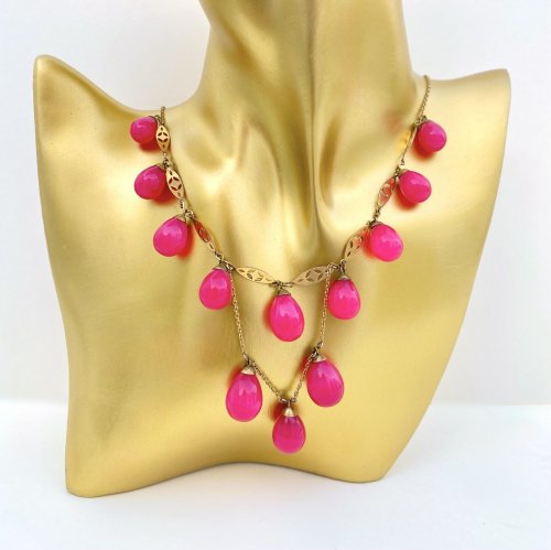 Vintage clip-on gold-tone earrings, designed in an elegant propeller shape. Part of a set of two matching items [necklace listed separately]. Each earring features three vibrant, pear-shaped stones in a luscious raspberry red hue, perfectly complementing the distinctive design. These earrings offer bold style with effortless clip-on comfort - a stunning match to the coordinating necklace. Diameter: 30mm. (= 3 cms. / 1.18”).