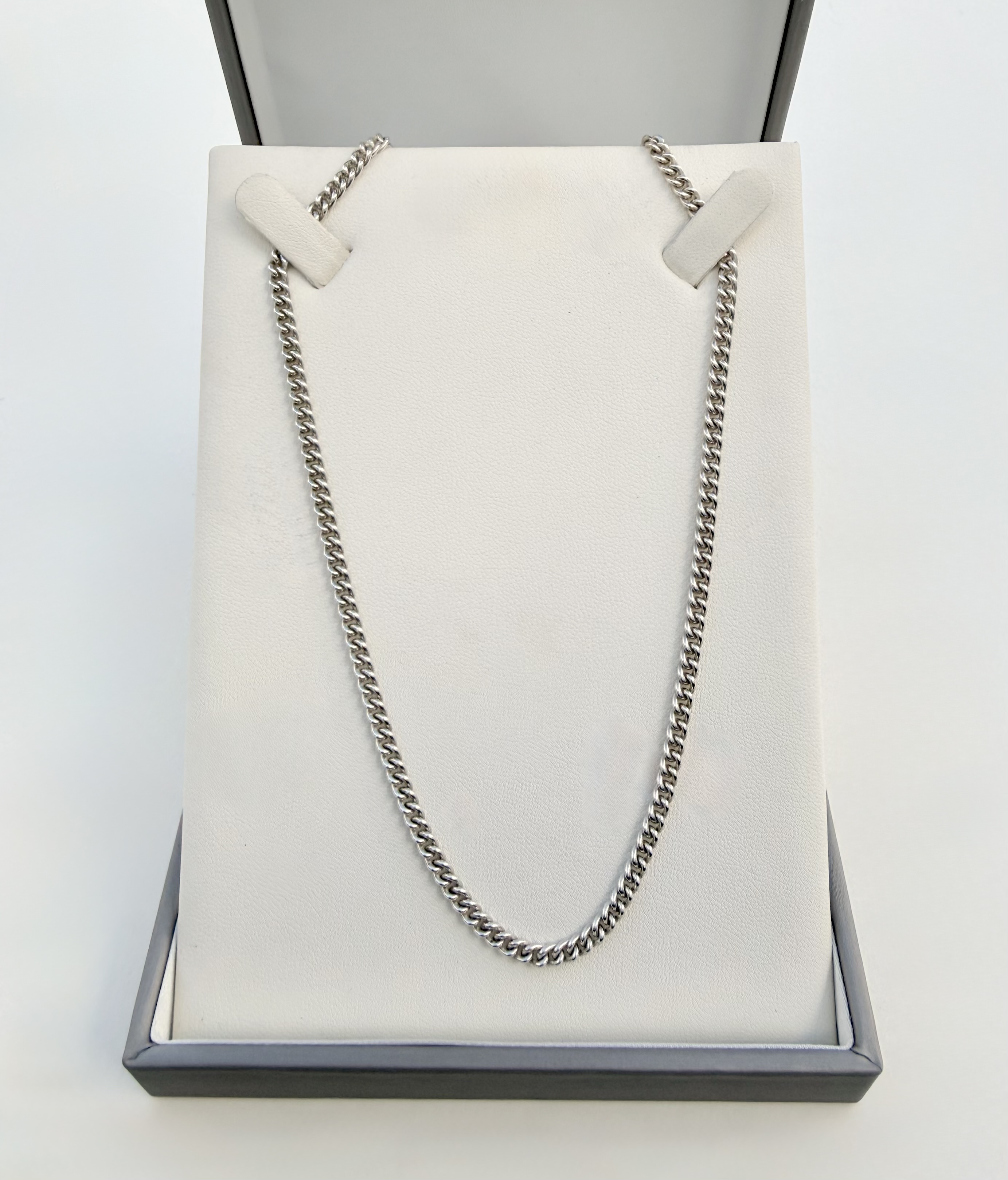 The chain features a classic bolt ring clasp for secure and comfortable wear. Each link is finely proportioned, measuring approximately 3.4 mm in width, giving the chain a refined yet noticeable presence.