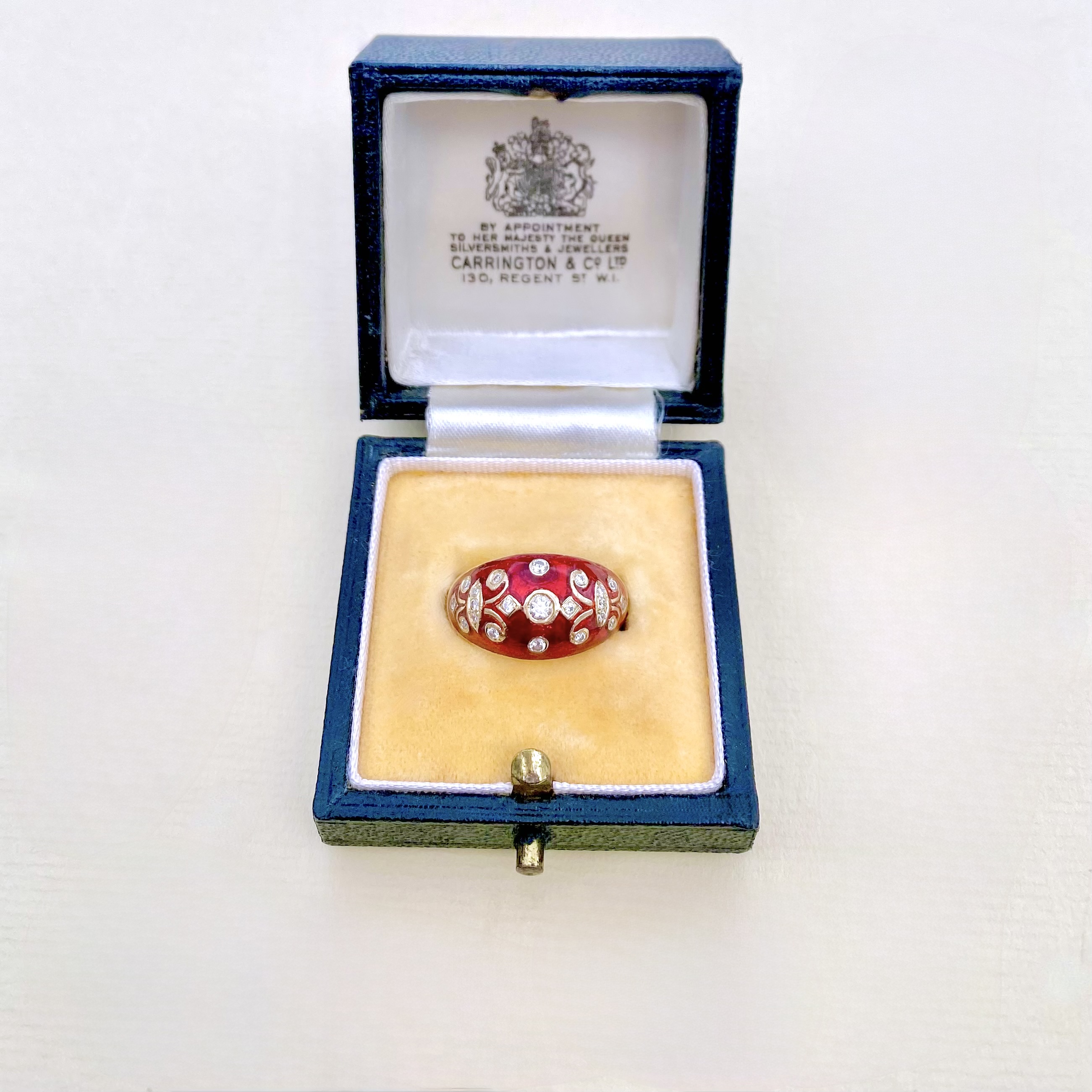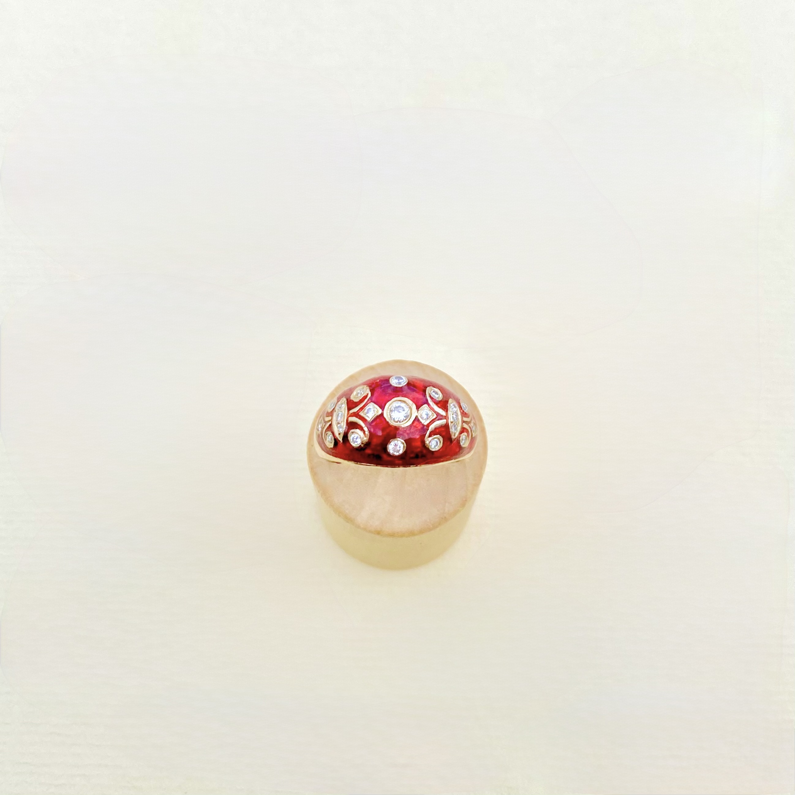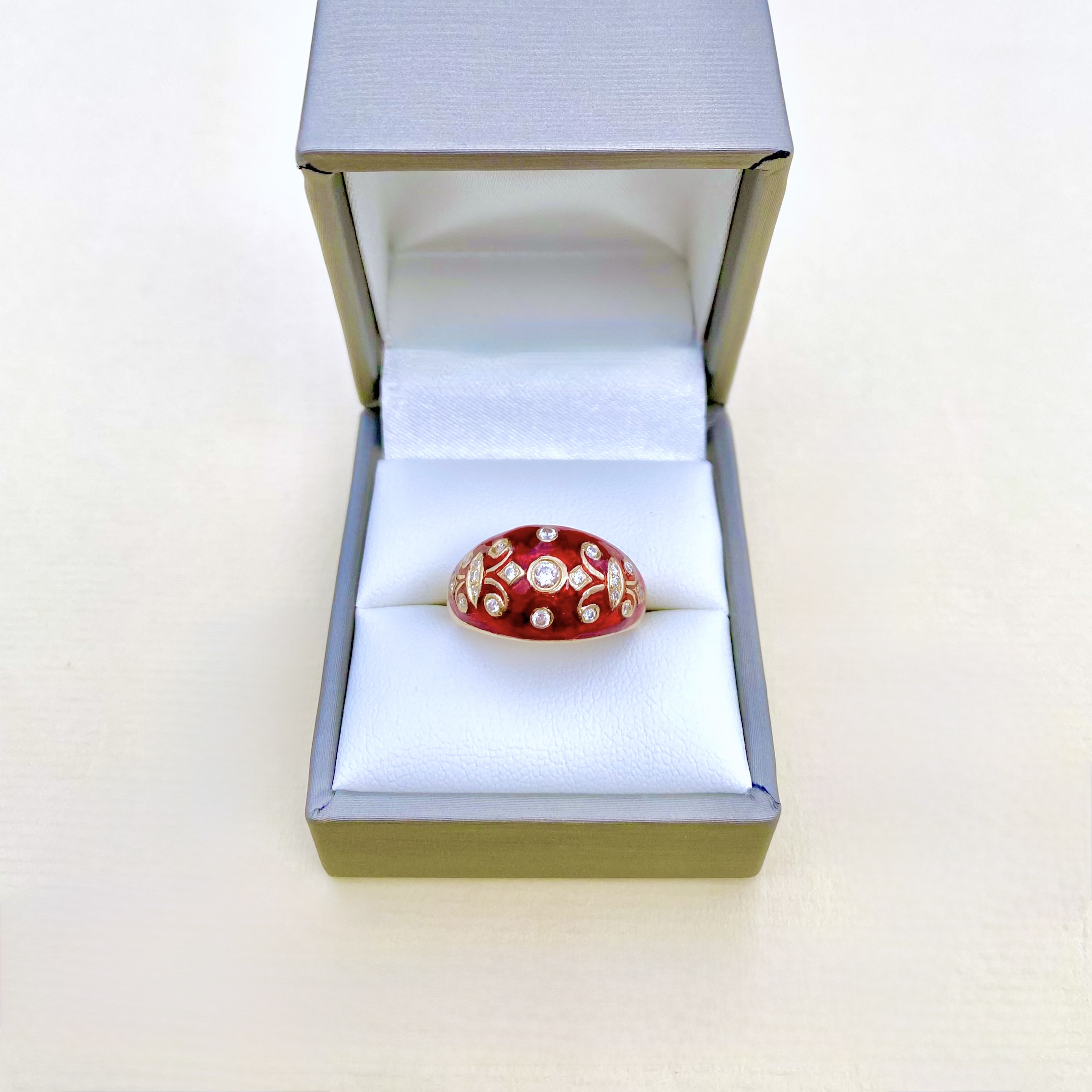 Exquisite 14ct. gold bombé ring, showcasing vibrant red enamel, which is adorned by intricate scrolling details. Featuring 21 round-cut diamonds, this ring sparkles with  elegance and refined craftsmanship. Stamped with a 14ct. authenticity mark, it’s the perfect fusion of sophistication and artistry - a statement piece that commands attention wherever you go. This ring comes alive when worn, simply stunning on! Size: P¼ . Weight: 5.47g.