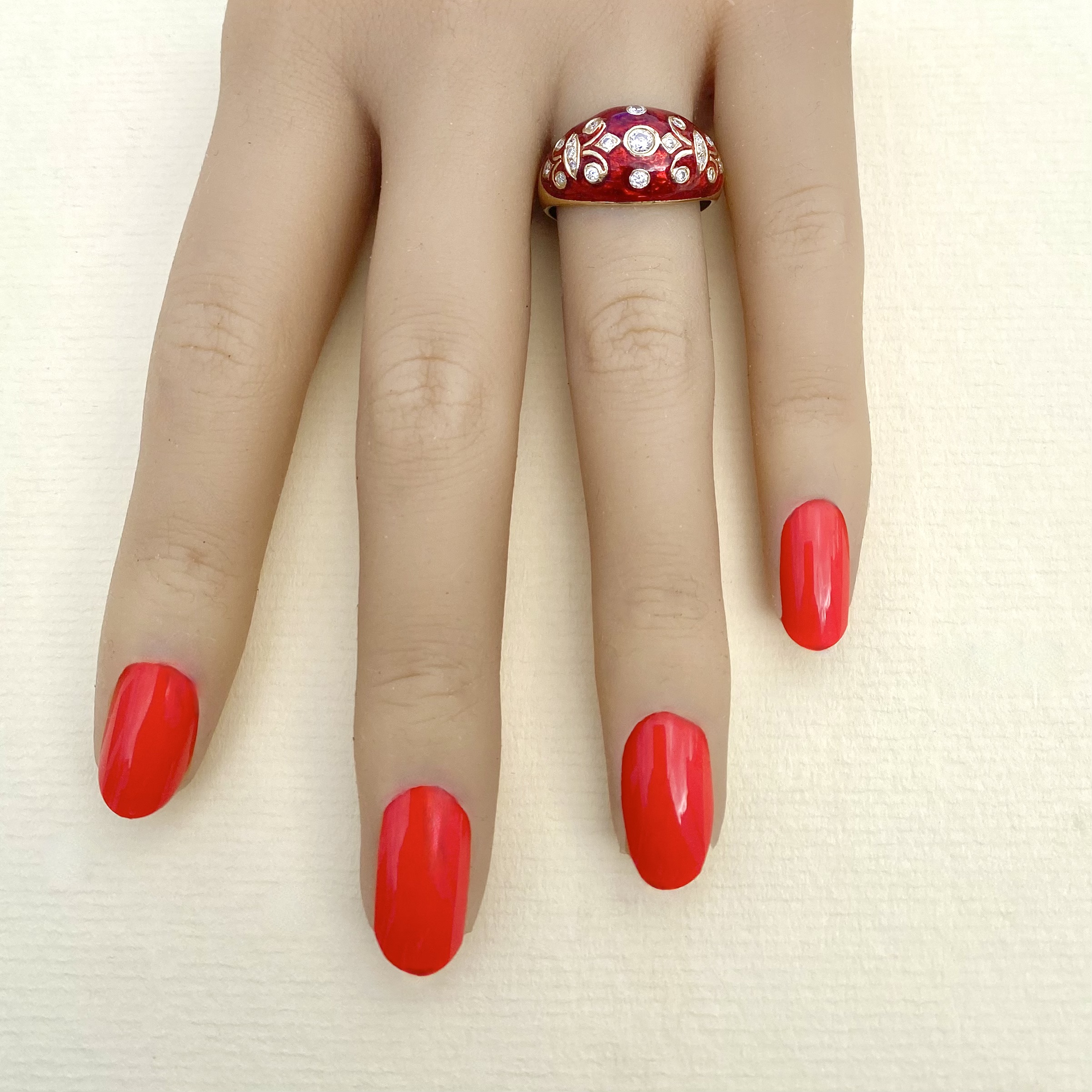 Exquisite 14ct. gold bombé ring, showcasing vibrant red enamel, which is adorned by intricate scrolling details. Featuring 21 round-cut diamonds, this ring sparkles with  elegance and refined craftsmanship. Stamped with a 14ct. authenticity mark, it’s the perfect fusion of sophistication and artistry - a statement piece that commands attention wherever you go. This ring comes alive when worn, simply stunning on! Size: P¼ . Weight: 5.47g.