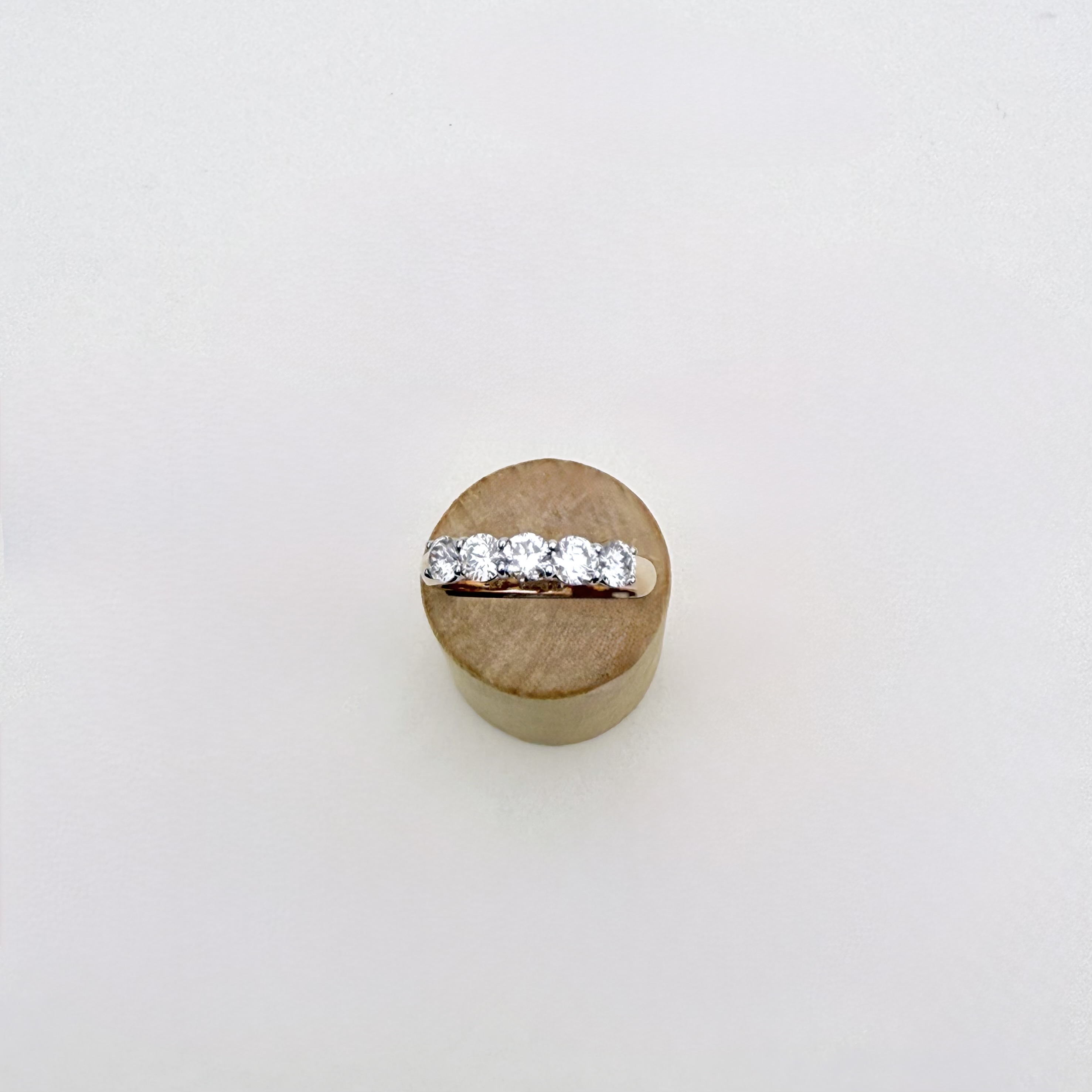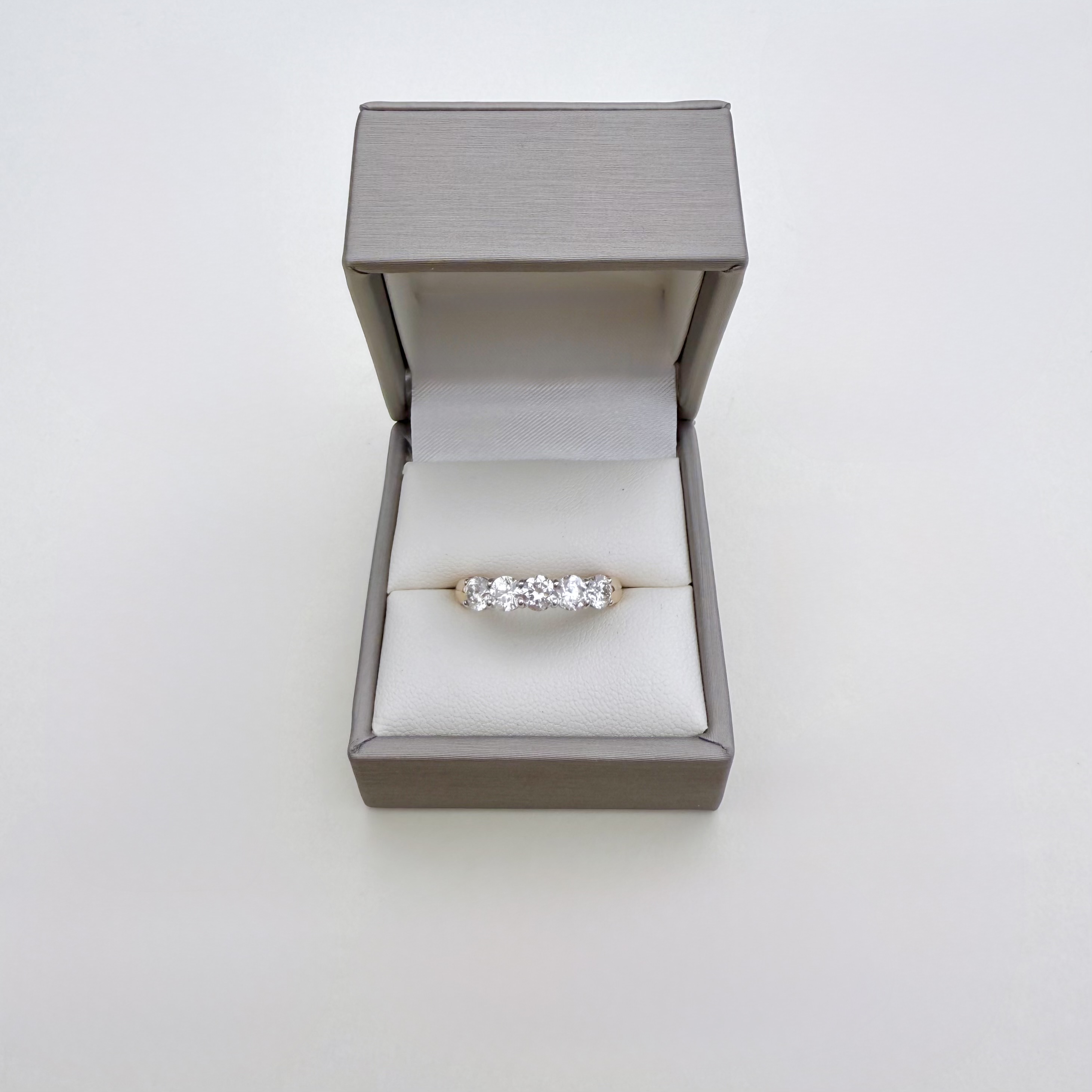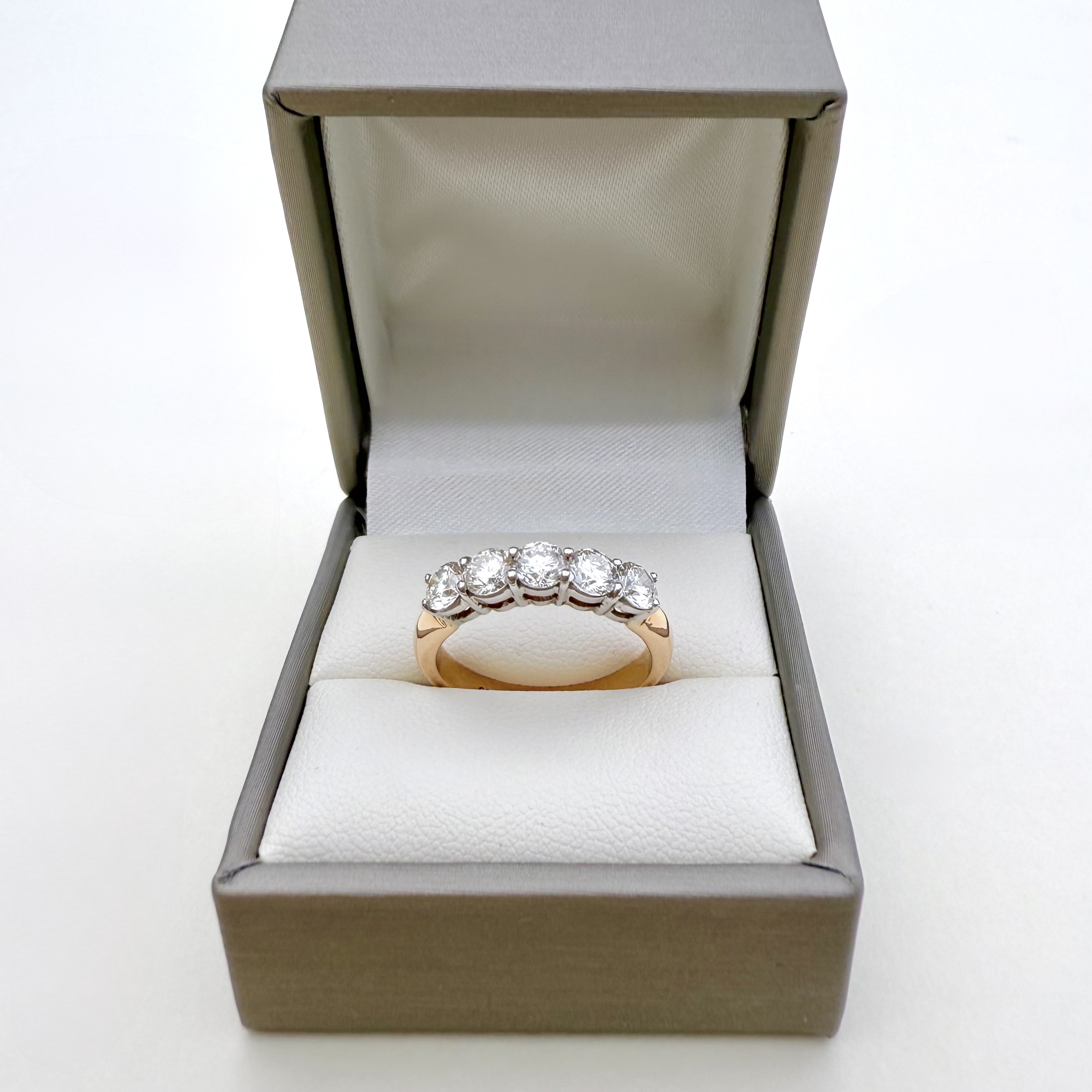 Hallmarked 18ct. yellow gold 5-stone diamond set ring. Five round brilliant cut diamonds of Total: 1.28 carat and good colour. Diamonds are bright, white, sparkly and well matched. Weighs: 3.02 gms. V. 4,247. Size: L¾ (just under an “M”). Independent valuation certificate provided√