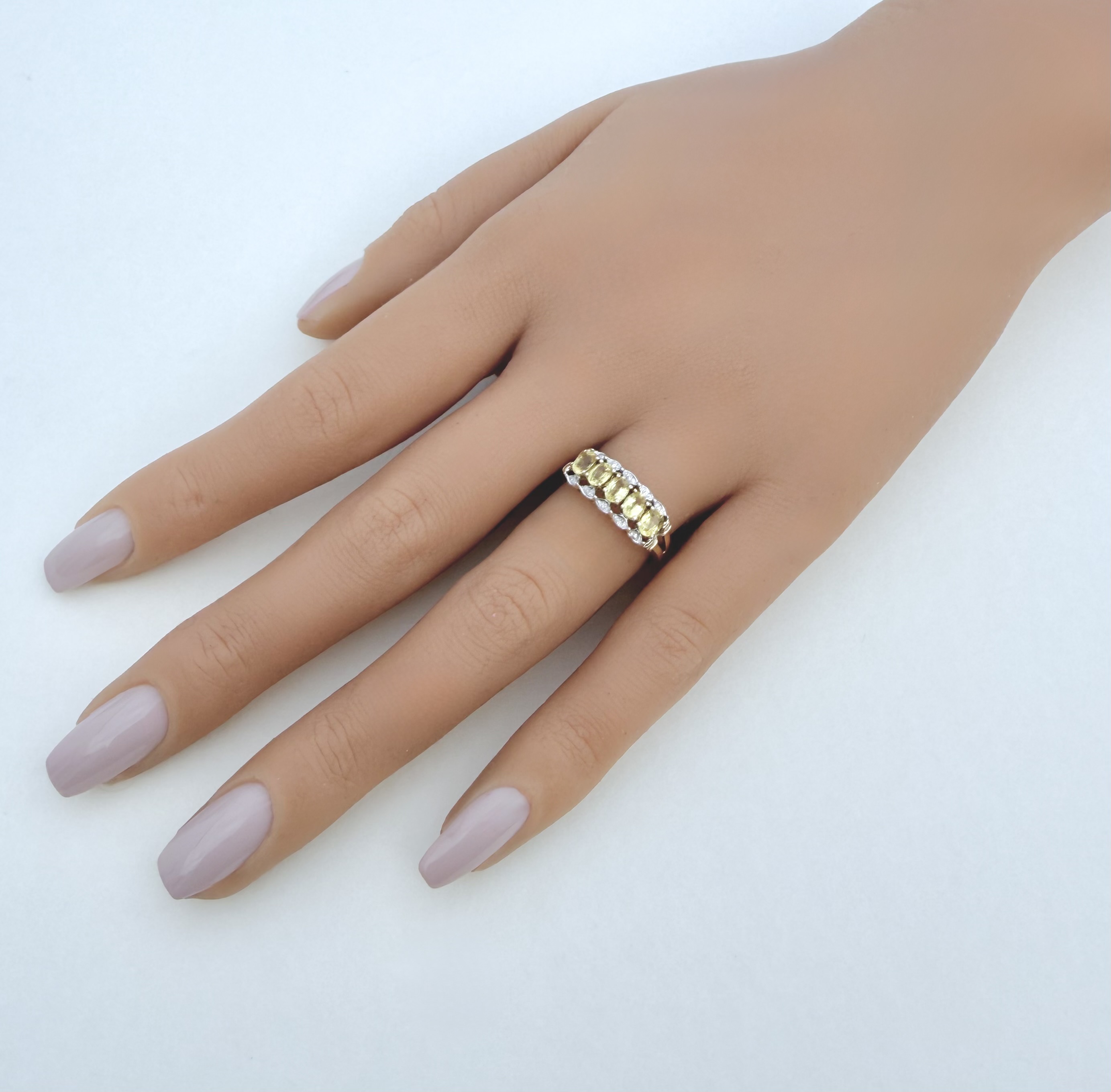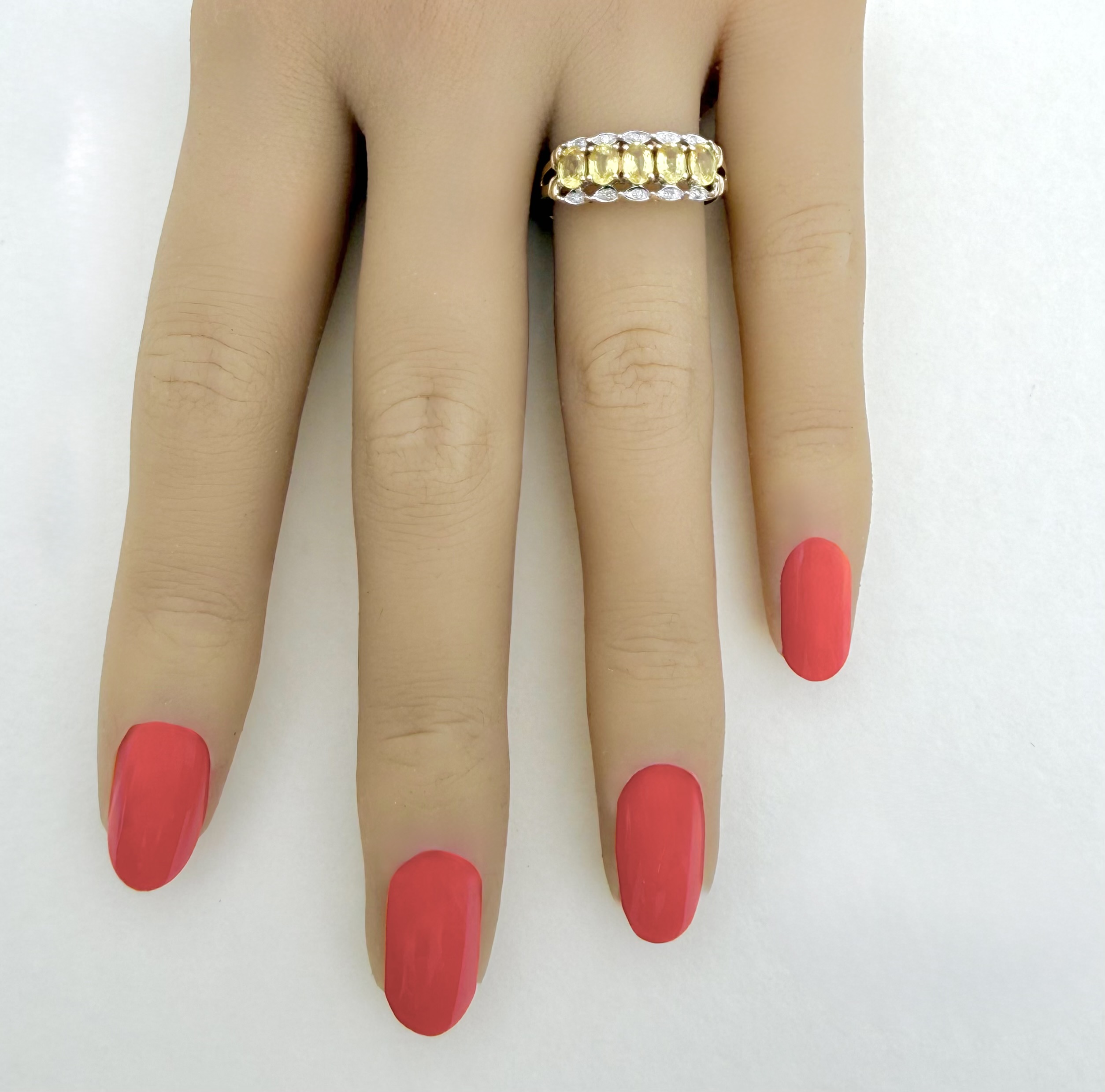 Hallmarked 9ct. yellow gold five-stone ring, exquisitely set with five perfectly matched oval-cut yellow sapphires of exceptional, vibrant colour. Each sapphire is secured in a classic four-claw setting and elegantly framed by a total of ten sparkling diamonds - five on either side - adding radiant brilliance and symmetry to the design.