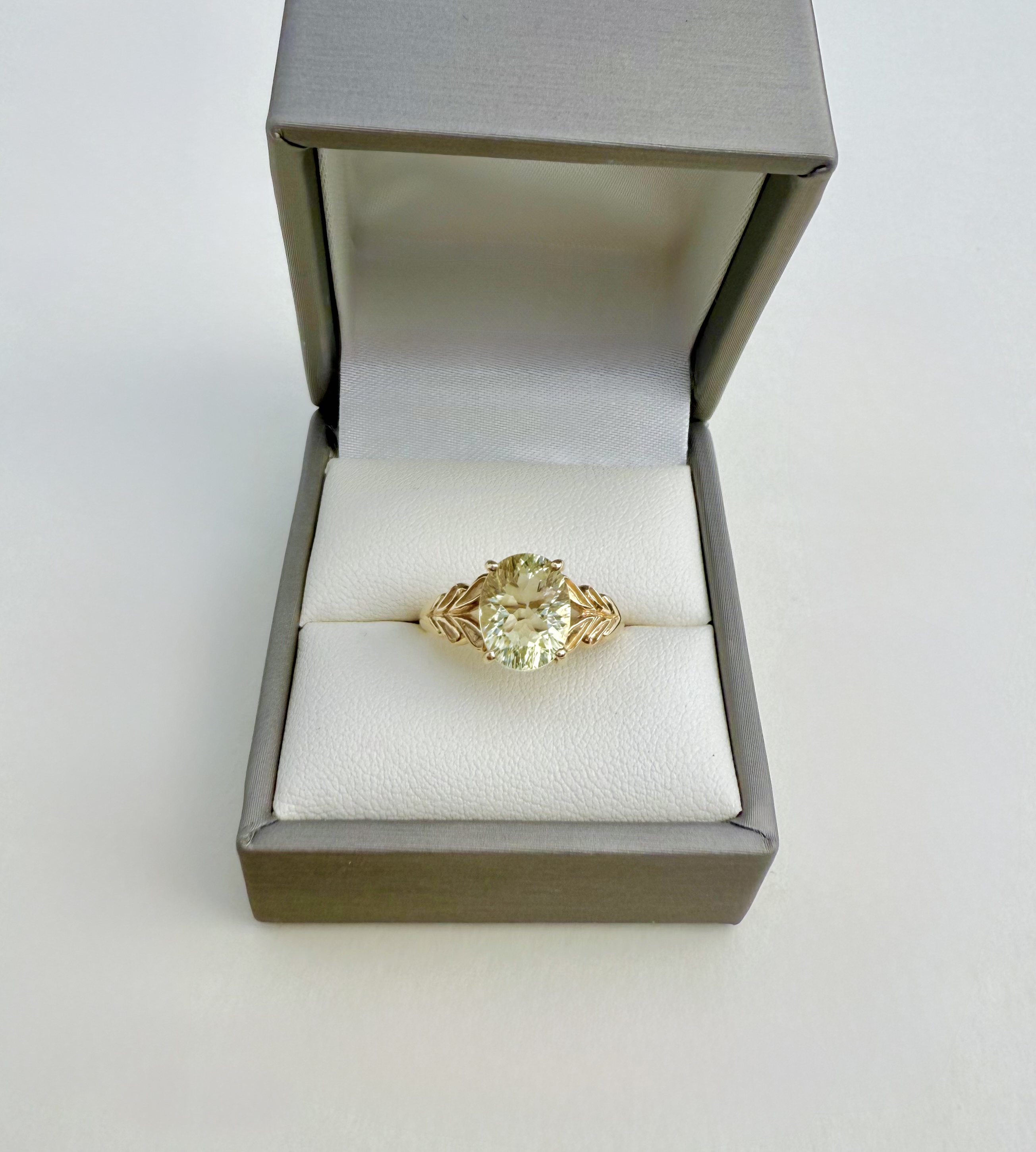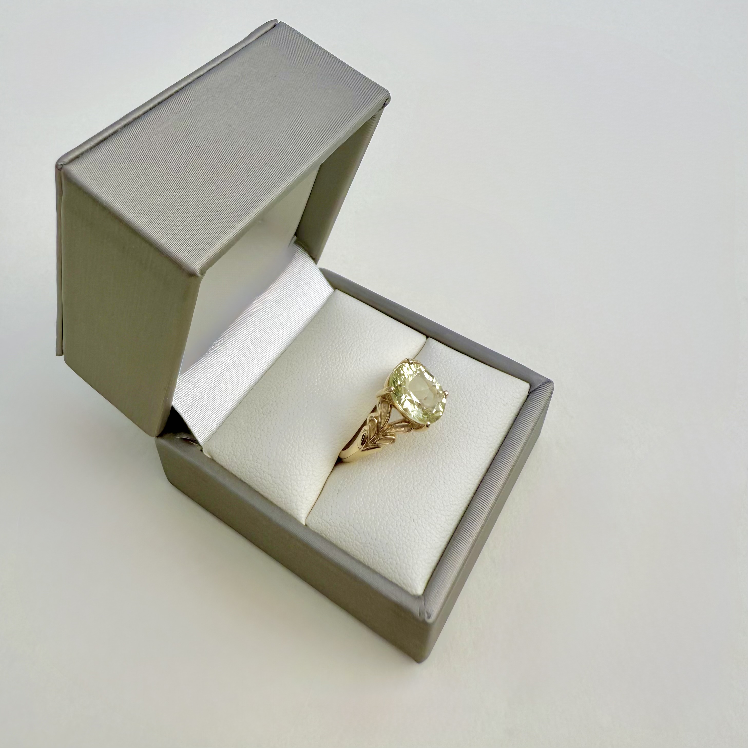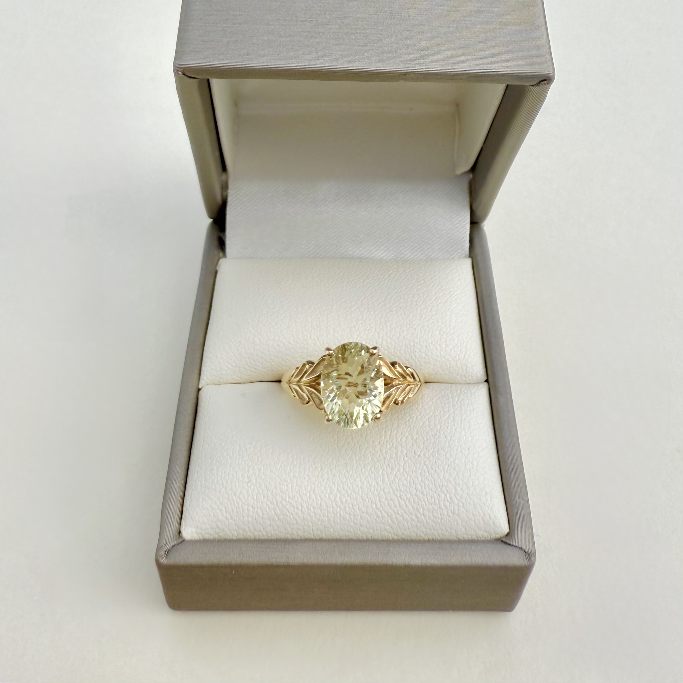 Crafted in hallmarked 9ct solid gold, this eye-catching ring features a vibrant oval-cut lemon citrine, securely 4 claw-set to showcase its brilliant golden lemony hue. Measuring 10mm x 7.92mm, the citrine is perfectly complemented by the ornately detailed acanthus foliage adorning each shoulder - a design that blends classic elegance with natural inspiration. A beautifully balanced ring that truly comes to life when worn. Size: N¼. Weight: 3.07 gms. Sponsors: GTV. Birmingham.