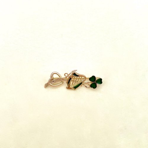 Unique vintage 9ct. solid gold Irish brooch set with gold heart, shamrock and a harp, the latter two of which are emblems of Ireland. Exquisite twist detail to harp strings and both the harp and the shamrock are embellished with green enamelling, the colour which is synonomous with Ireland’s green landscape and the reason why Ireland is identified as the Emerald Isle. This is quite special. Length: 44.5 mm. (= 4.45 cms. / 1¾”).
