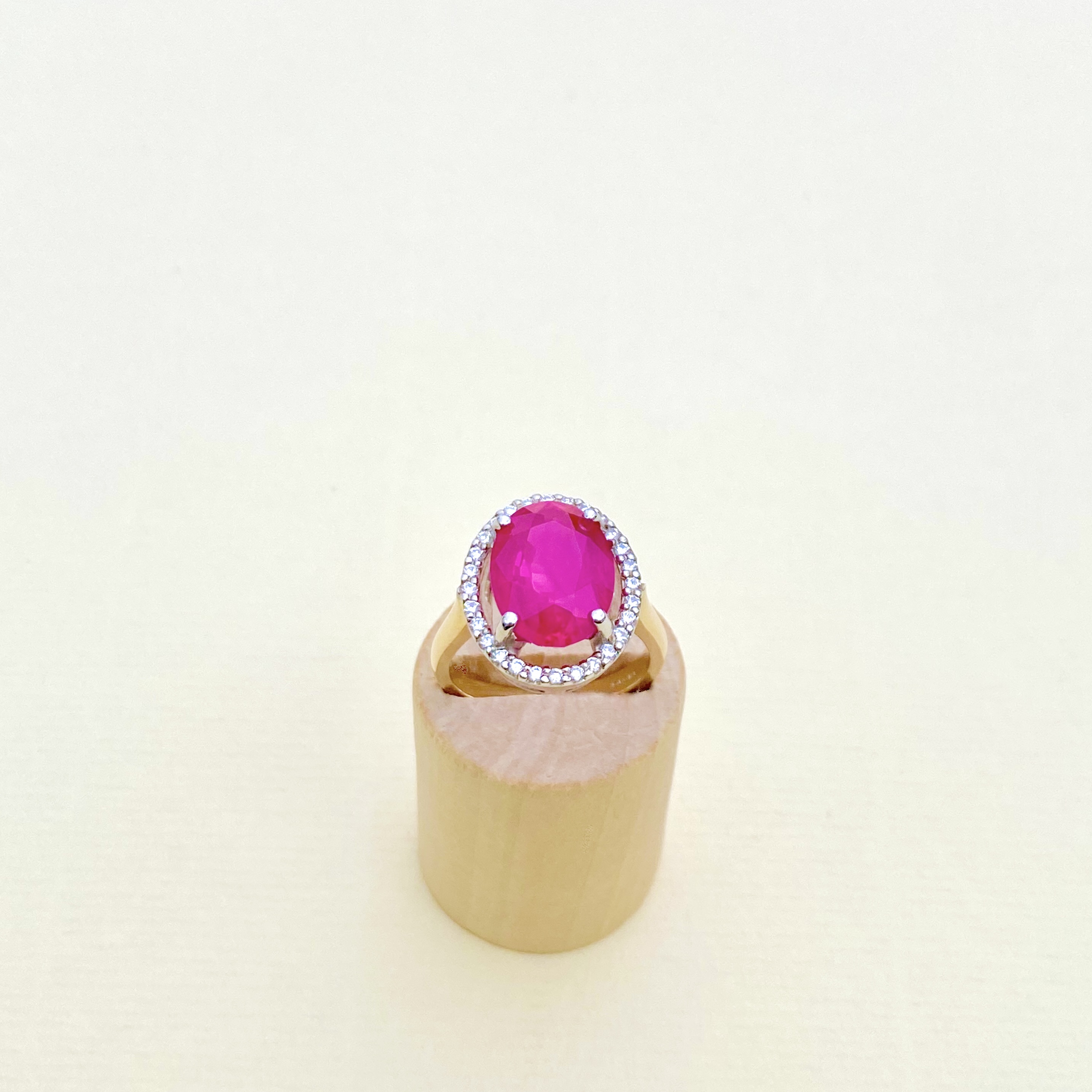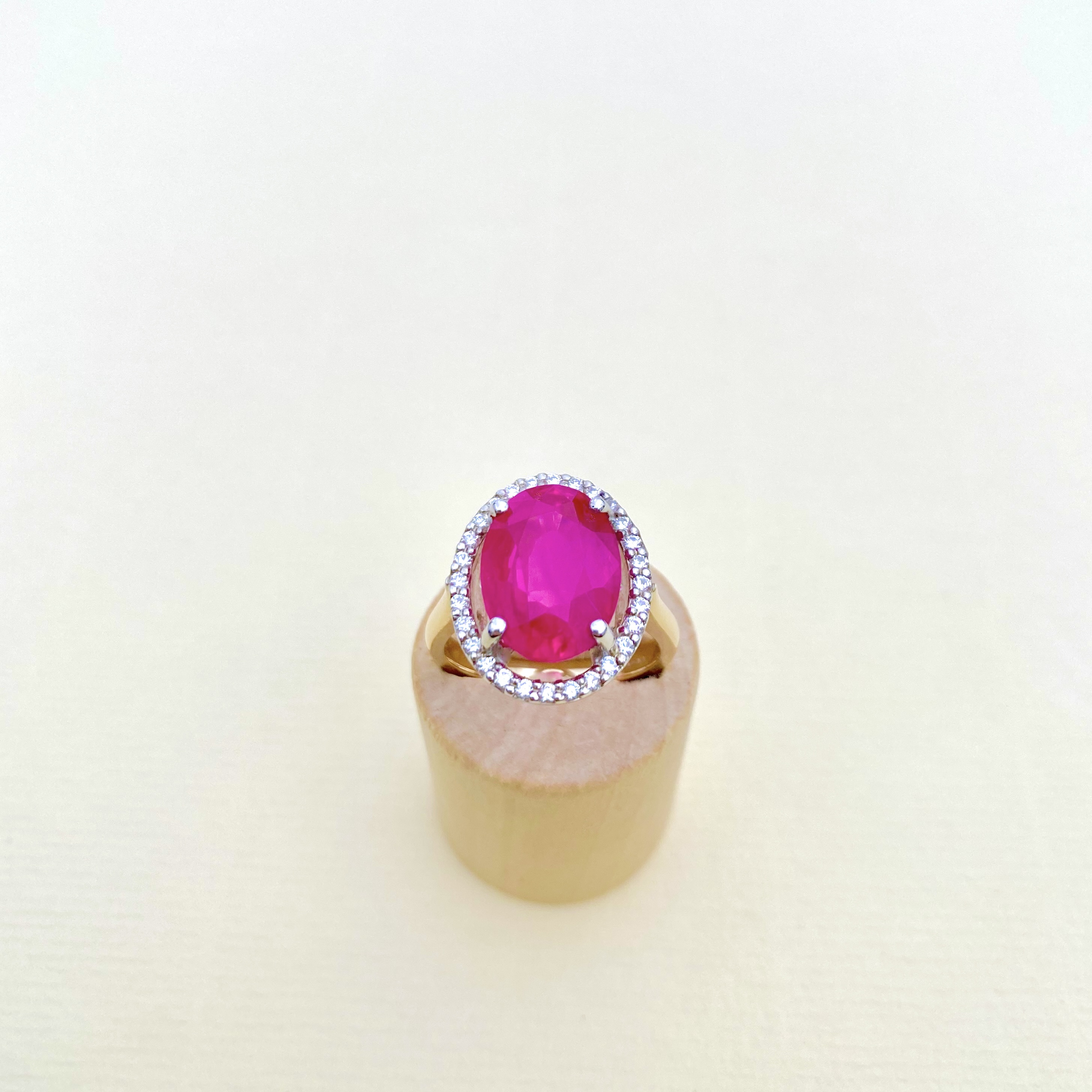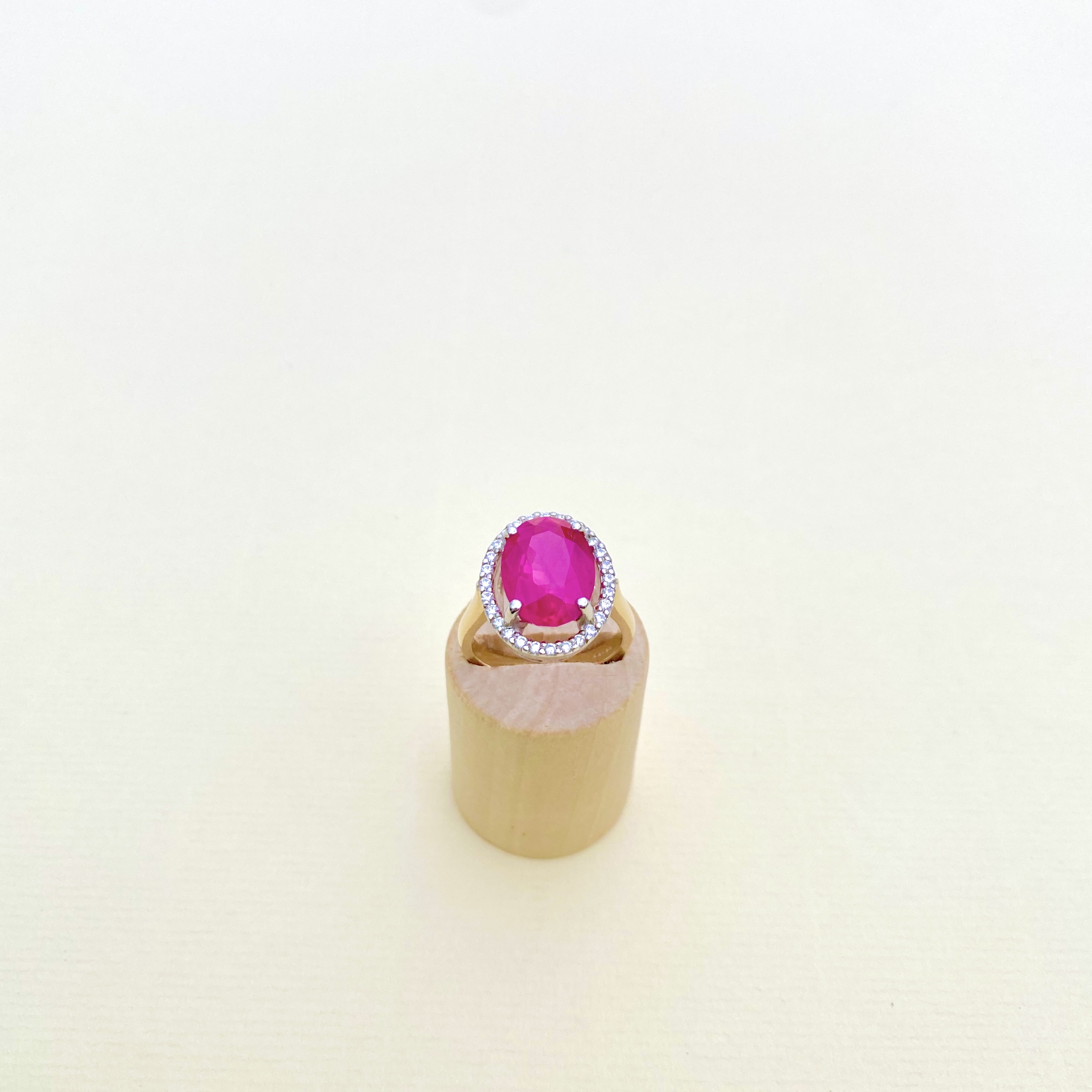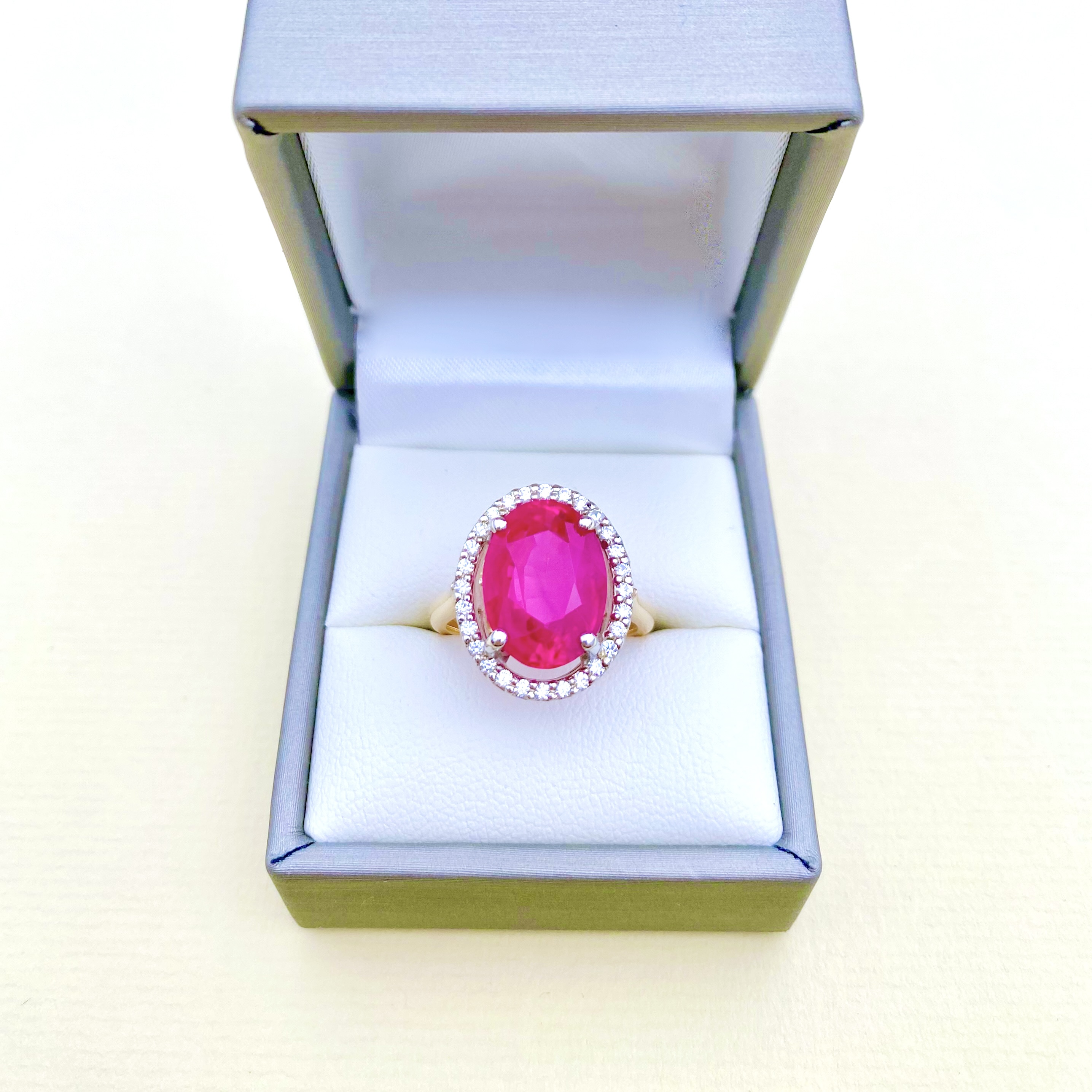 This exquisite bespoke ring is a true showstopper. Contemporary and crafted in hallmarked 9ct yellow gold, it features an 8-carat oval-shaped quality synthetic ruby, set with four secure claws. Surrounding the vibrant ruby is a dazzling halo of 28 round brilliant-cut natural diamonds, which are bright, white and sparkley. The ring’s stunning design sits beautifully on the finger, making it the ideal statement piece for any special occasion. This masterpiece combines timeless elegance with a modern flair. Weight: 6.50 gms. Size: M¾ (just under an N) = USA: 6¾. EU: 53.
