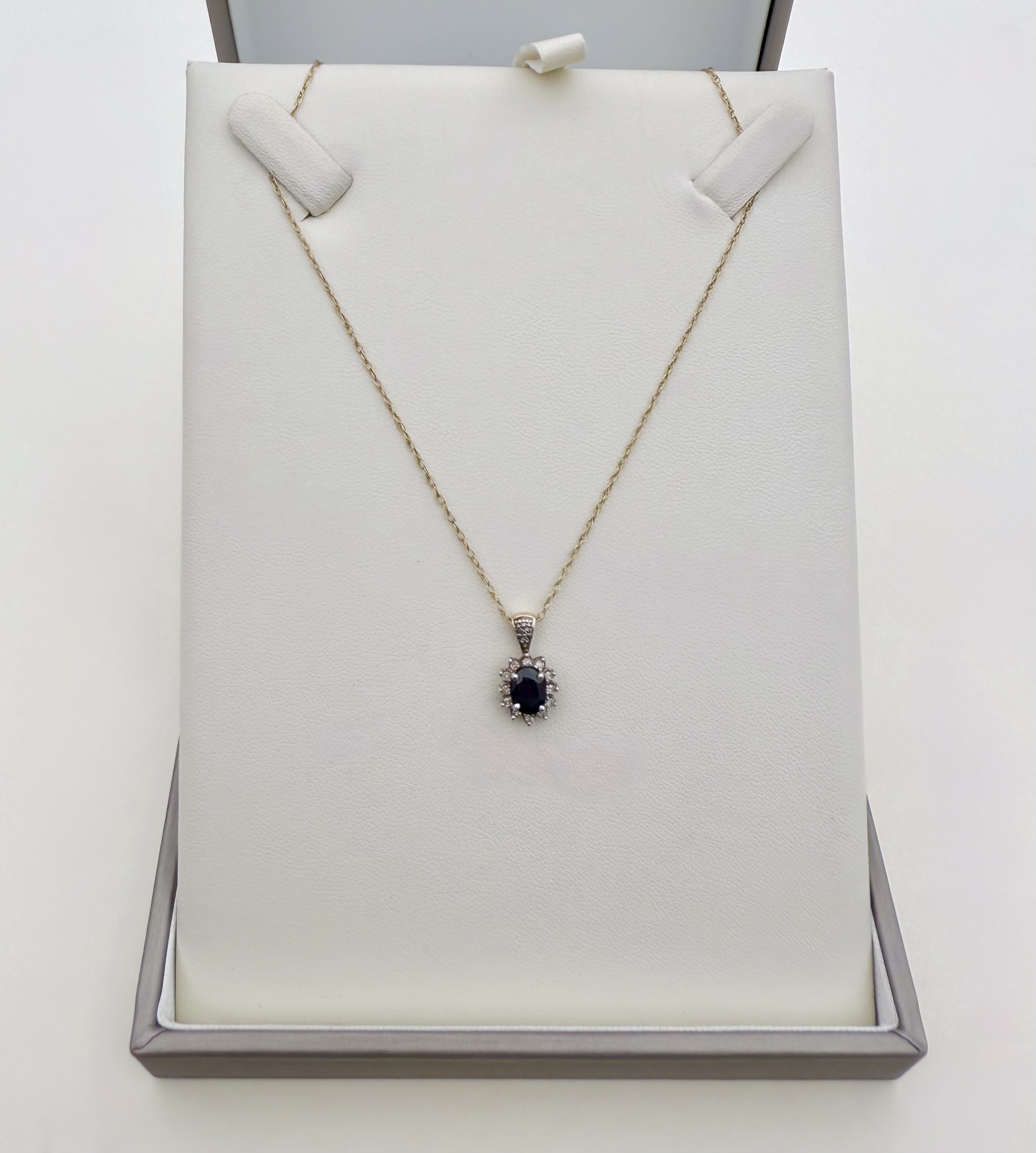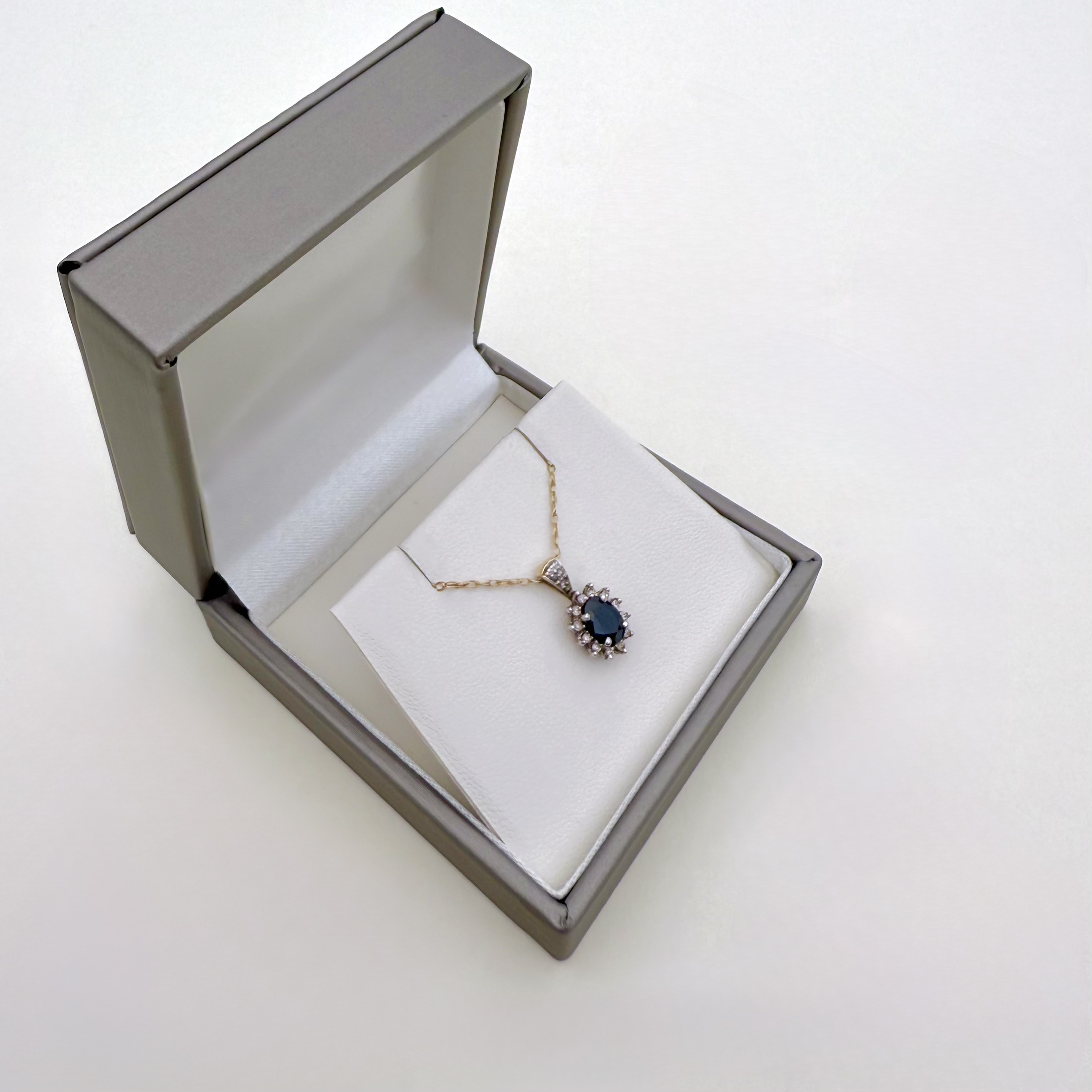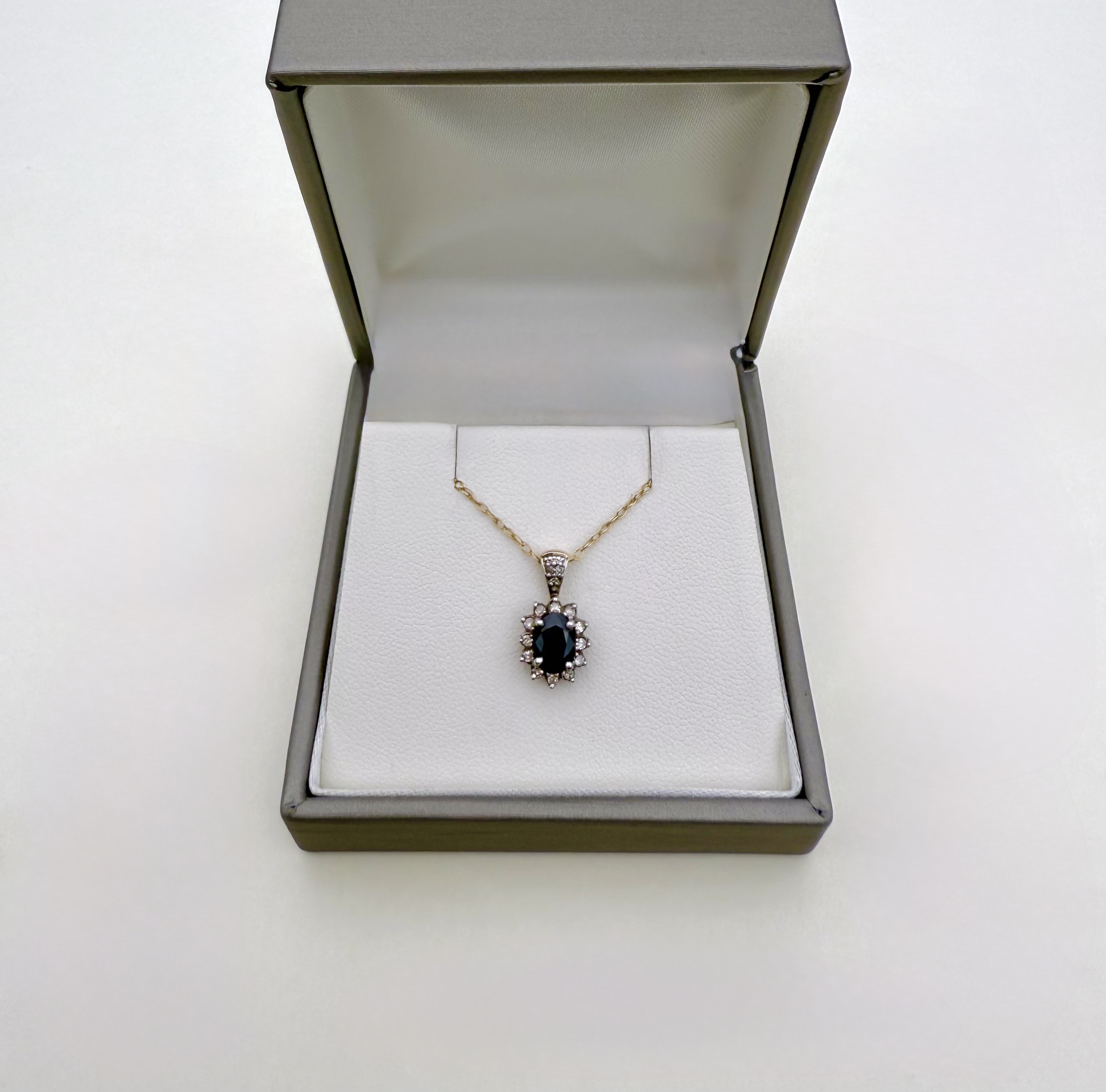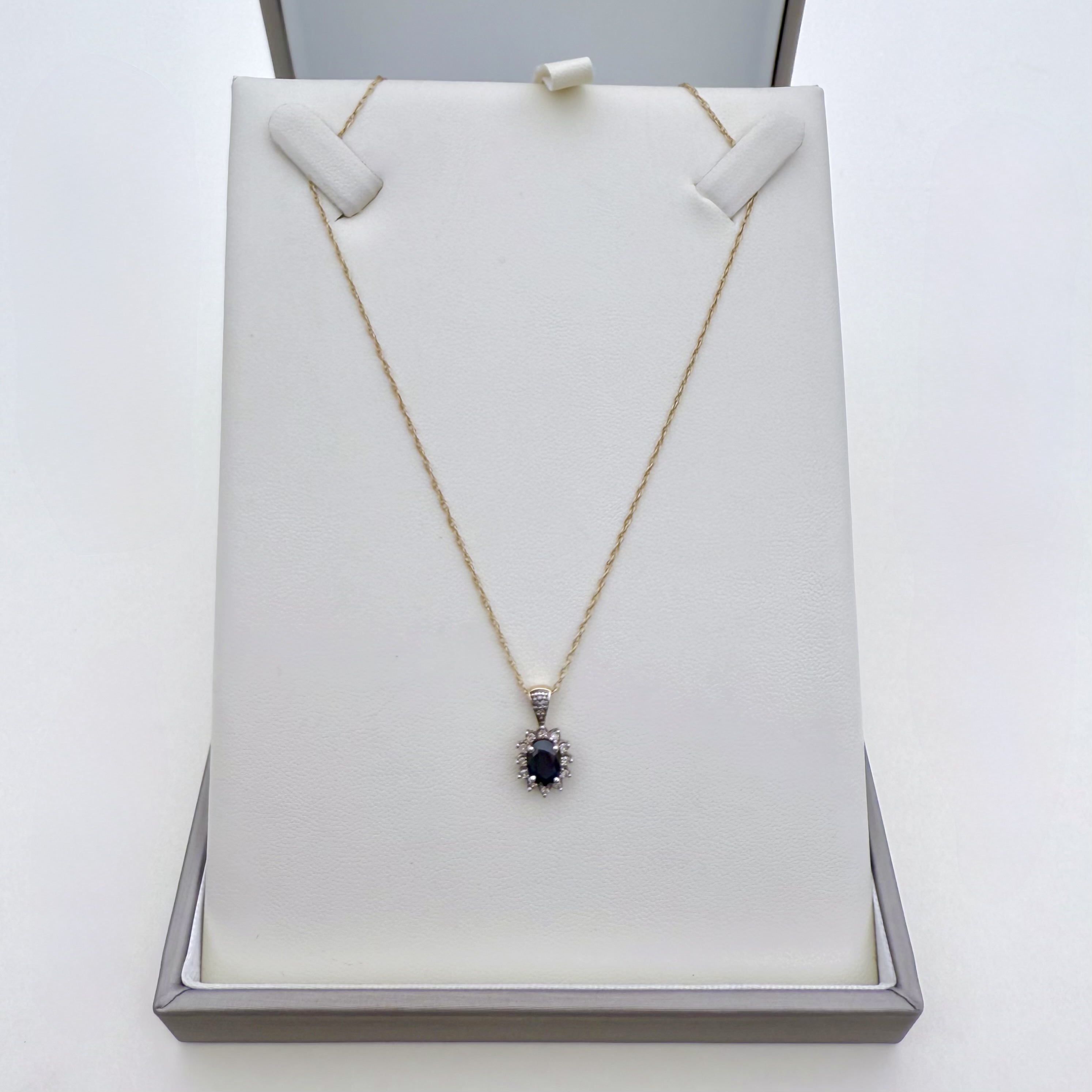 This exquisite 9ct. yellow gold Sapphire & Diamond cluster pendant necklace, features a deep blue faceted sapphire, oval in shape, which is encircled by 12 meticulously matched, brilliant white diamonds, creating a radiant halo that captures and reflects the light with every movement. The pendant is suspended from a trace link chain - stamped .375 = 9ct. gold. Chain length: 46 cms. (= 18”). Pendant stamped and tested as 9ct. gold. Pendant height: 16.48mm. (= 1.64cms. / 0.64”) Width: 8.4mm (= 0.84cms. / 0.33”).