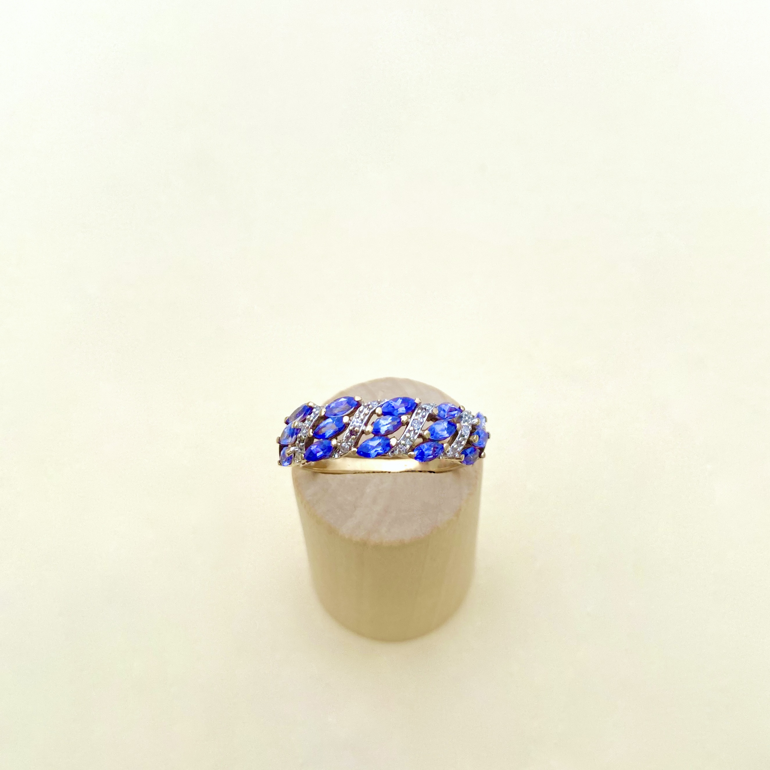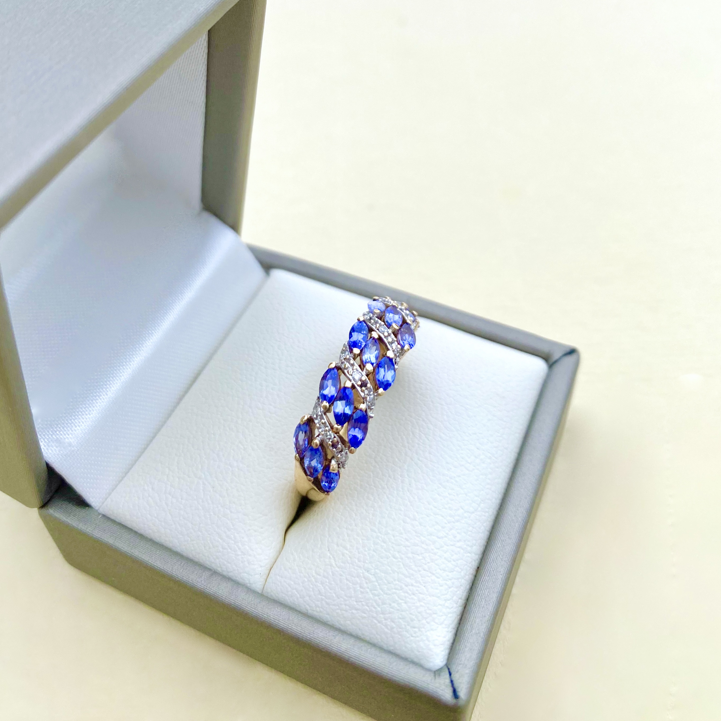 Hallmarked 9ct. yellow gold Tanzanite and Diamond ring,  features 15 marquise-cut Tanzanites, arranged in five striking rows of three. The vivid violet-blue tones of the Tanzanite catch the light beautifully, creating a mesmerizing display of colour. Each trio of gemstones is enhanced with sparkling diamond accents, adding brilliance, depth and refined sophistication.