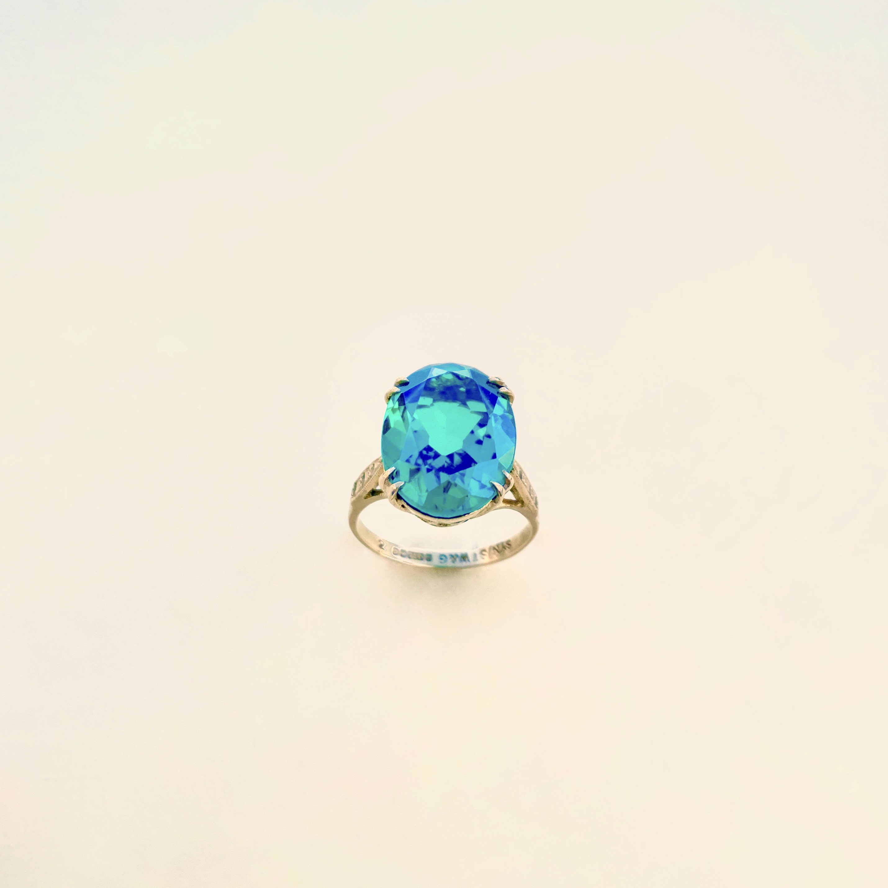 Hallmarked 9ct solid gold ring featuring a striking oval-cut vibrant green stone, securely set at the centre with four double claws at each corner. The gemstone measures approximately 15.52mm x 11.65mm. - an impressive focal point. Beneath the setting, an intricate basket-weave underbezel adds elegance and craftsmanship, complemented by embossed detailing along the shoulders for a refined finishing touch. Weight: 4.92 gms. Size: M¼ (= USA: 6½ EU: 52½) .