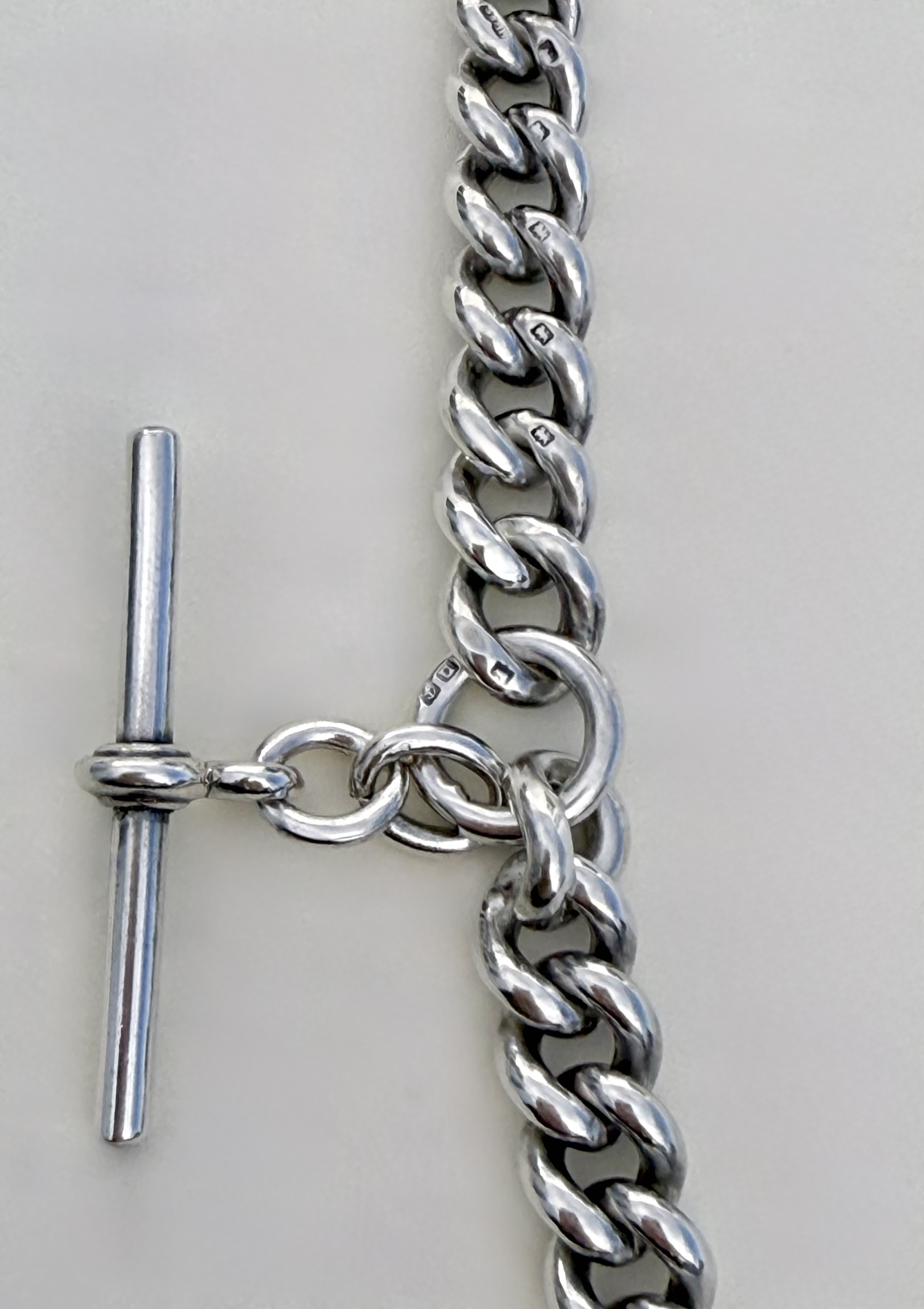 Dating to circa 1919 - 1920, the chain showcases outstanding craftsmanship. Each link is individually stamped with the lion passant - Britain’s enduring hallmark of sterling silver purity (minimum 92.5%). In continuous use since the 16th. century, this emblem stands as a trusted guarantee of quality, authenticity and English silversmithing heritage.