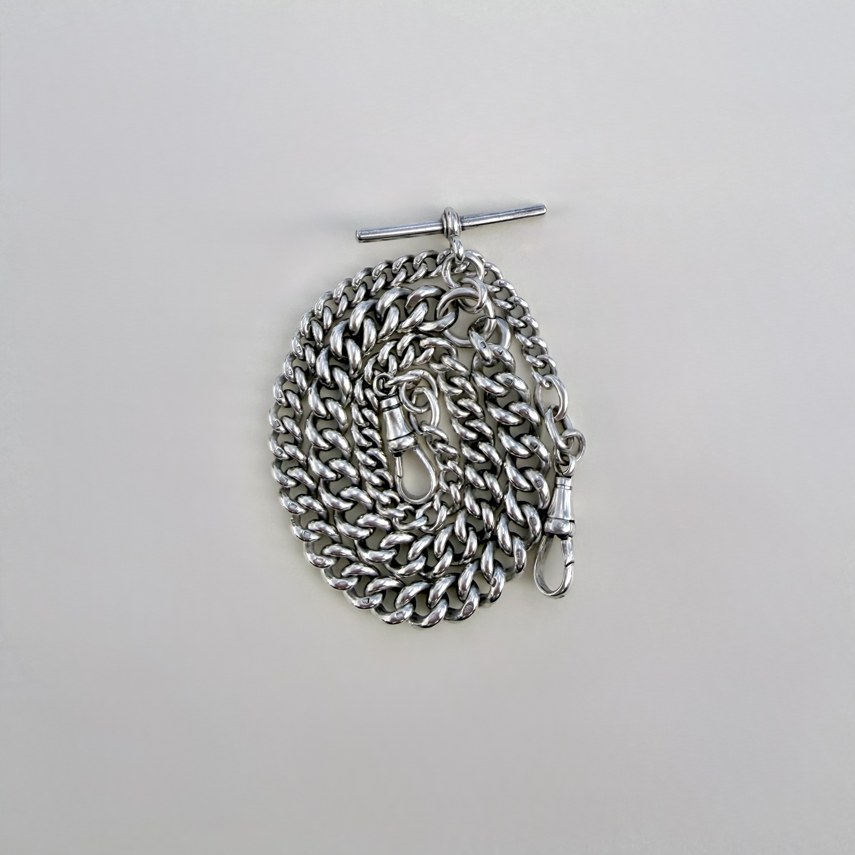 An exceptional Antique graduated sterling silver Albert chain, featuring a classic central T-bar and secured with two original dog clips. Elegantly proportioned and beautifully weighted, this fine example is fully hallmarked throughout with the lion passant and the Sponsor’s mark H B&S, likely to be attributed to Herbert Bushell & Son Ltd. and assayed in Birmingham.