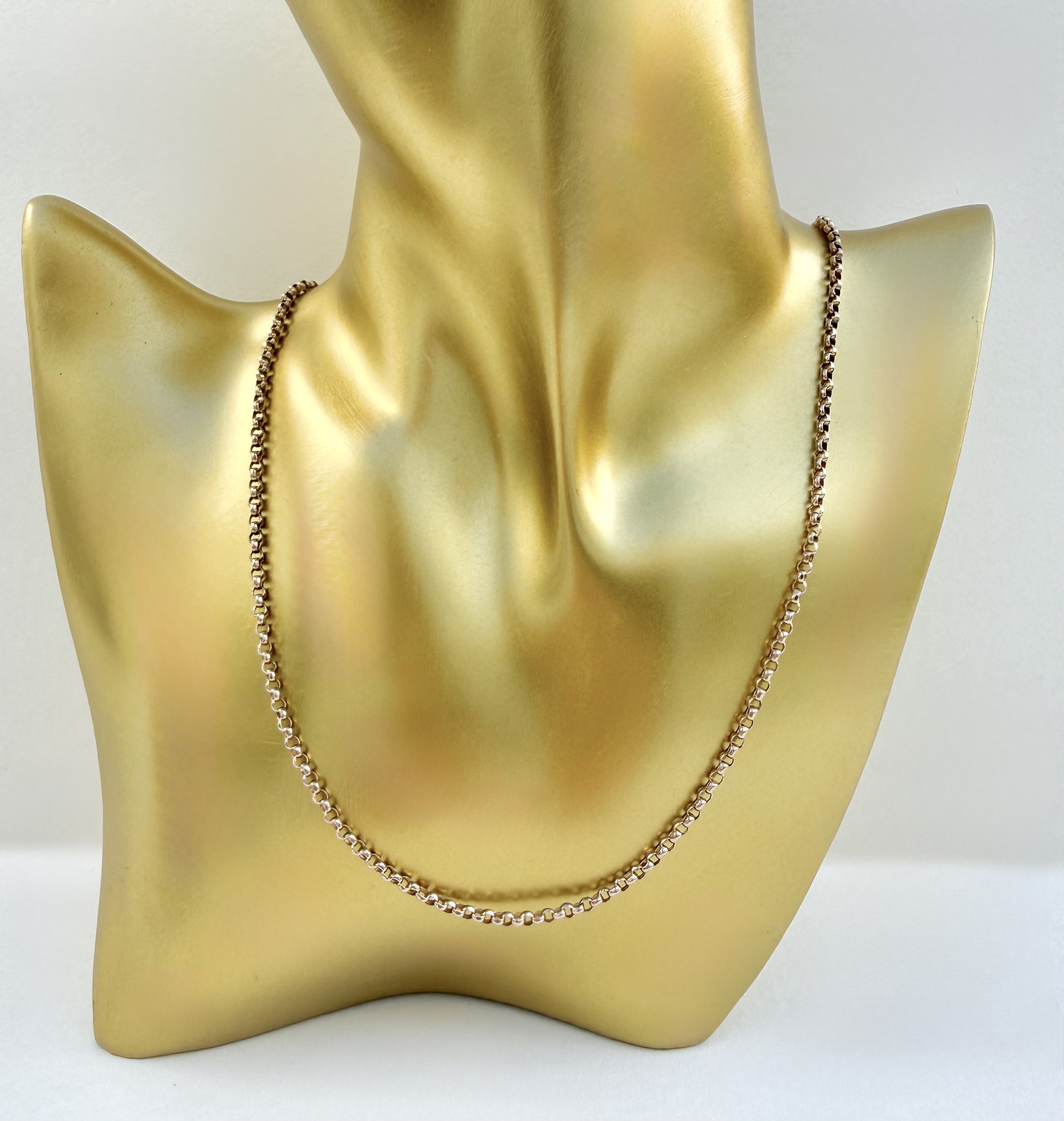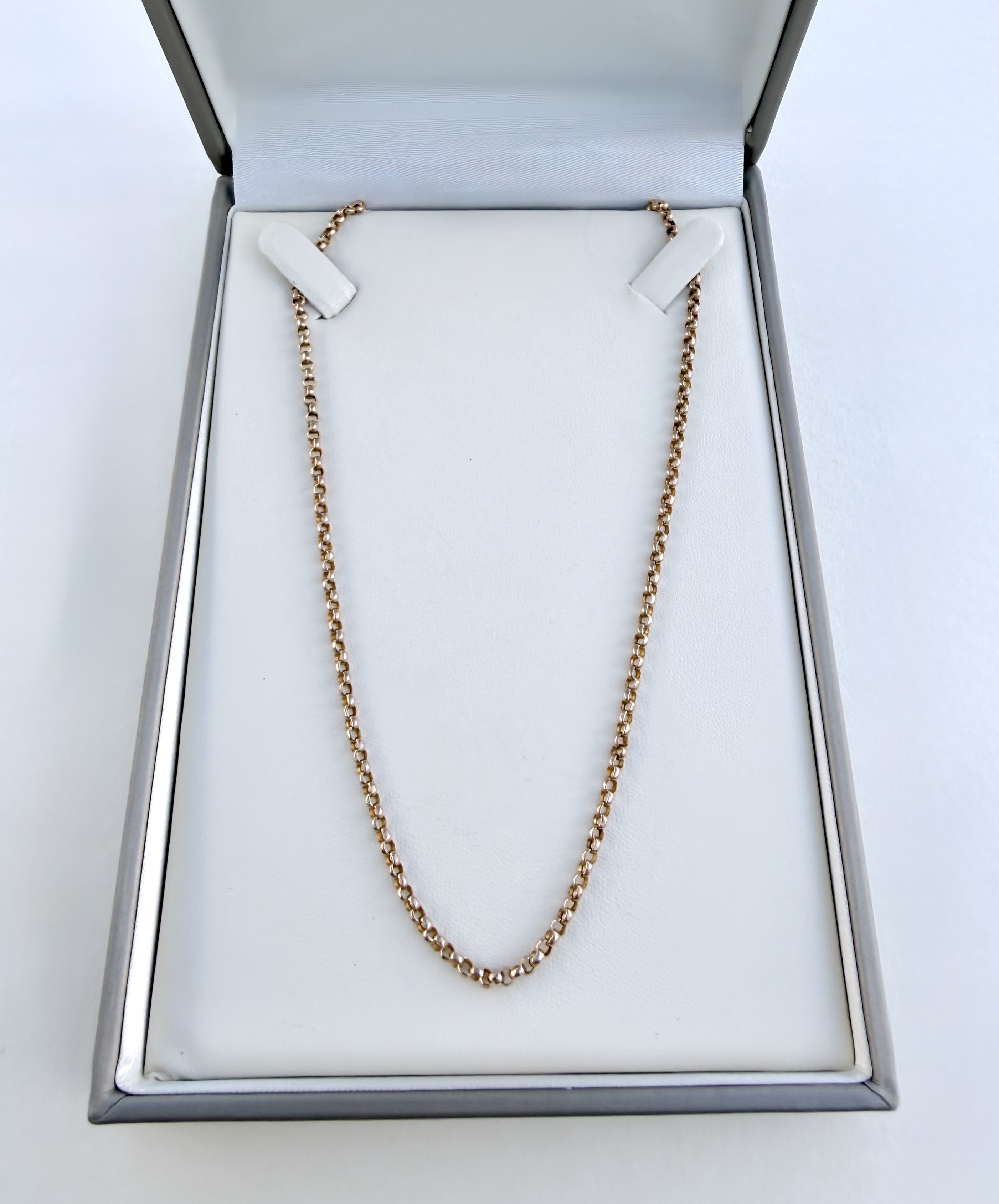 Elegant late-Victorian 9ct. yellow gold Belcher chain, featuring a classic cylinder clasp. The chain is stamped 9ct. on chain links, confirming its gold content. Length: 48¼ cms. (= 19”). Approximate link width is 2.38 mm, offering a refined yet substantial presence - an enduring antique piece with timeless appeal.