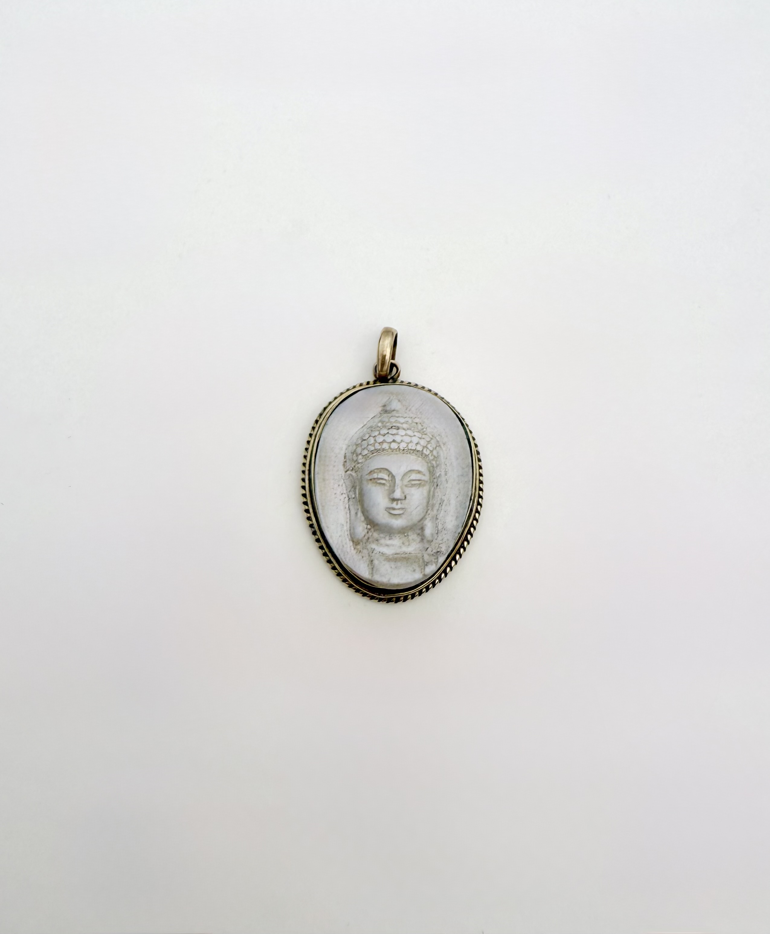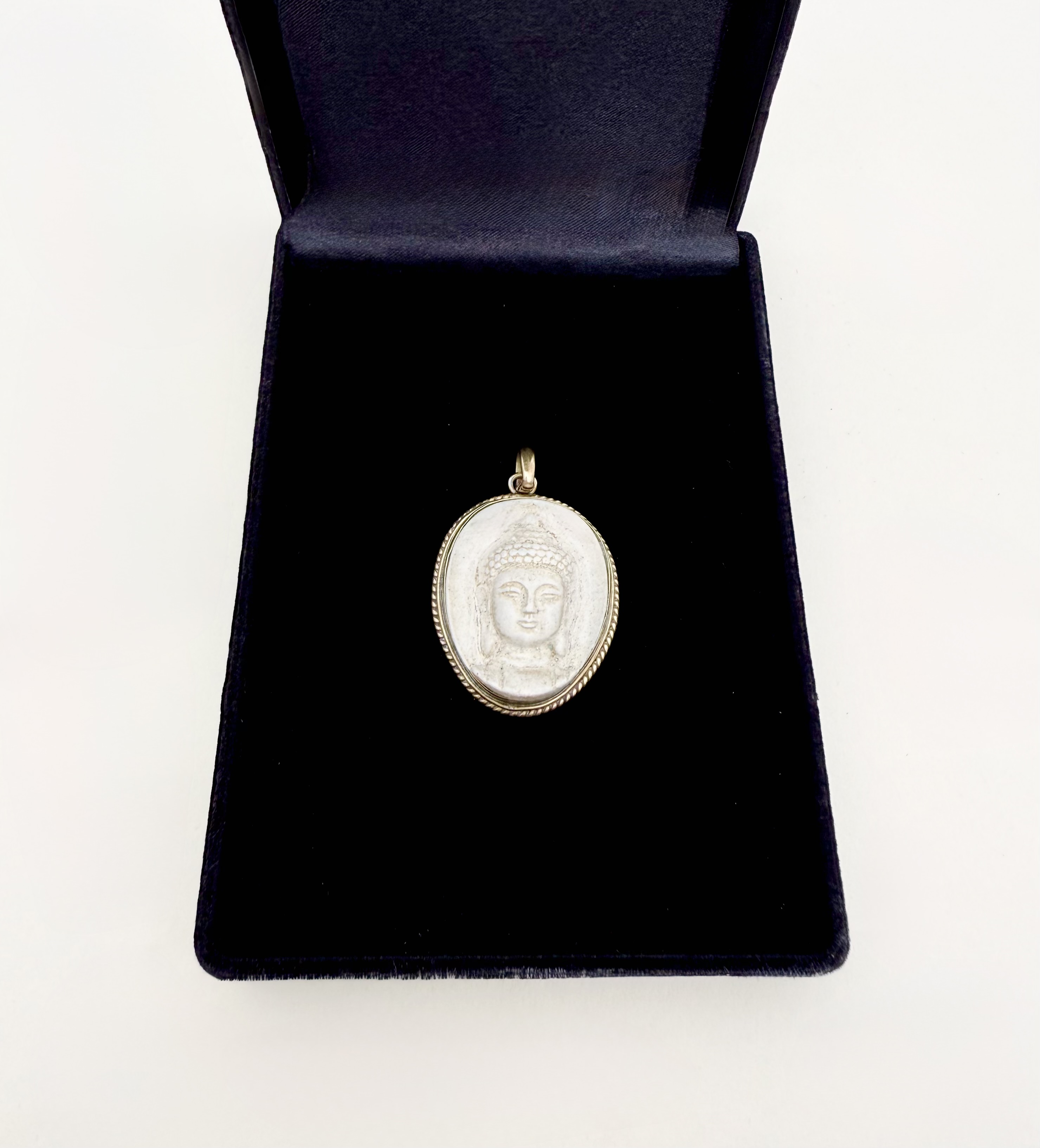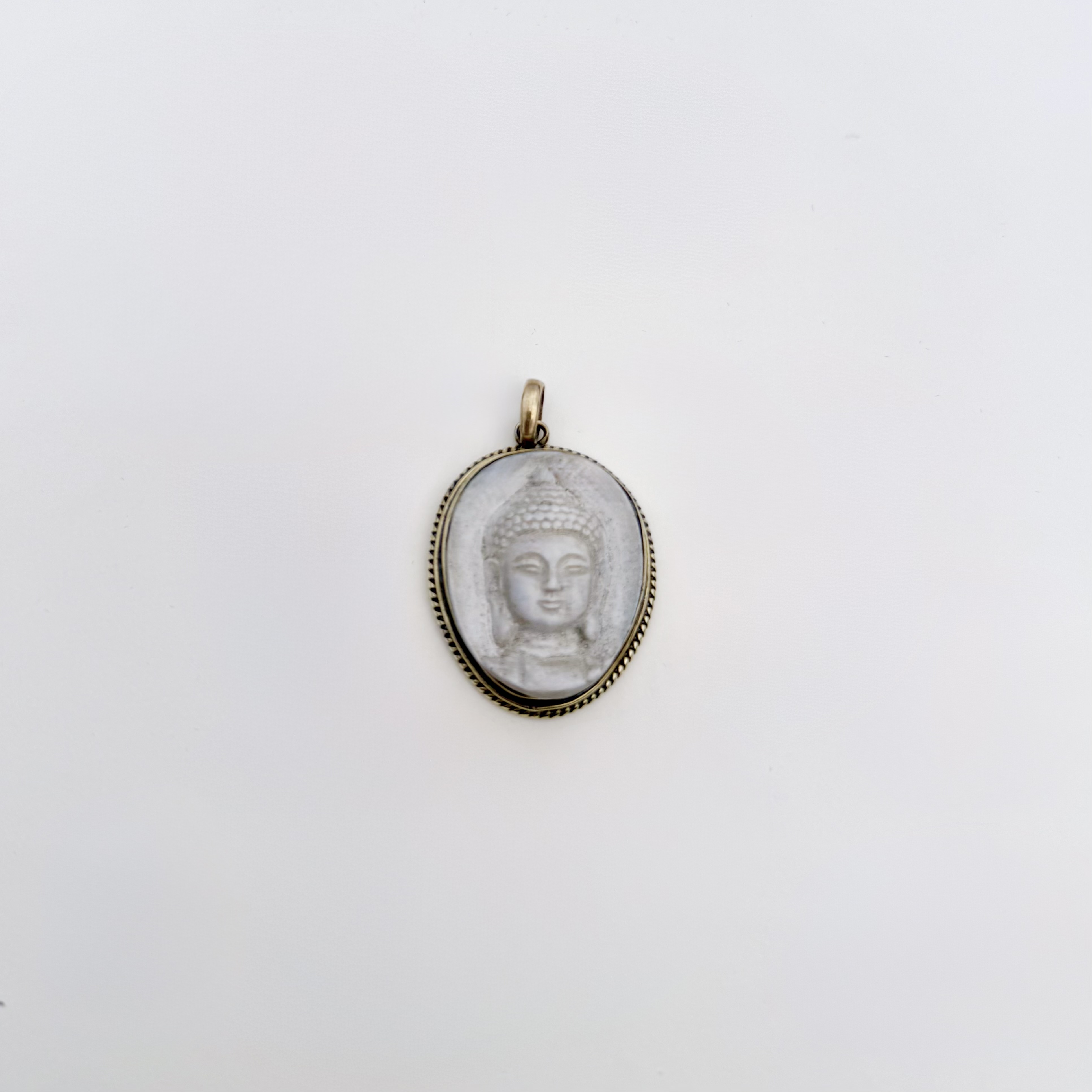 This ivory-coloured Buddha Head pendant is exquisitely detailed, oval in shape and featuring a serene sculptural depiction of the Buddha’s face that embodies calm, balance and inner awareness. The expression is peaceful and harmonious, with gently closed, downcast eyes symbolizing meditation, compassion and spiritual reflection. The nose is straight and refined, and the lips form a faint, calm smile - sometimes called the “Buddha smile” - conveying tranquility and contentment. The ears are long and elongated, a traditional symbol of wisdom and the Buddha’s past life as a prince who wore heavy earrings. The finely sculpted symmetry enhances its tranquil presence, making it both meaningful and visually striking.