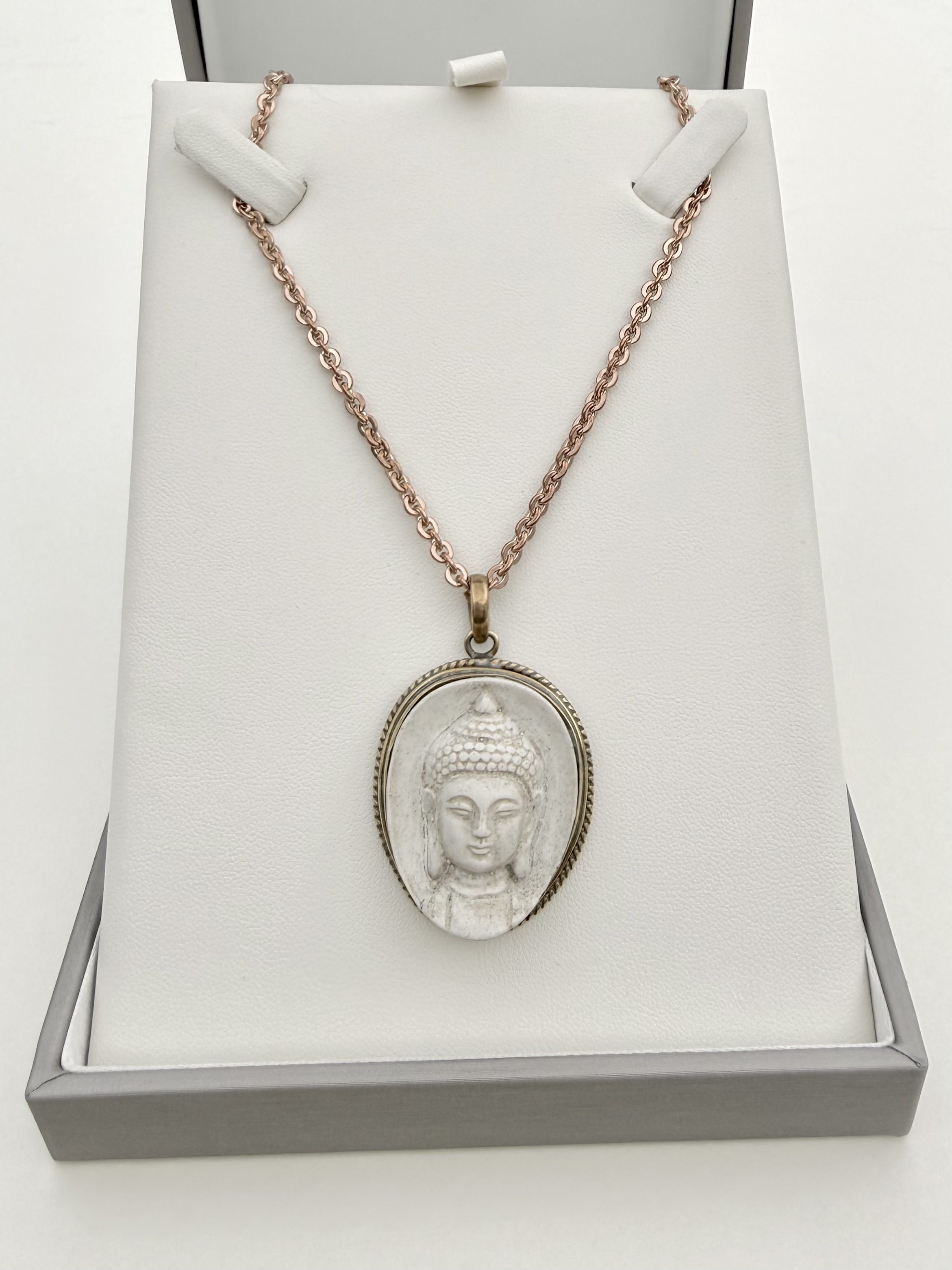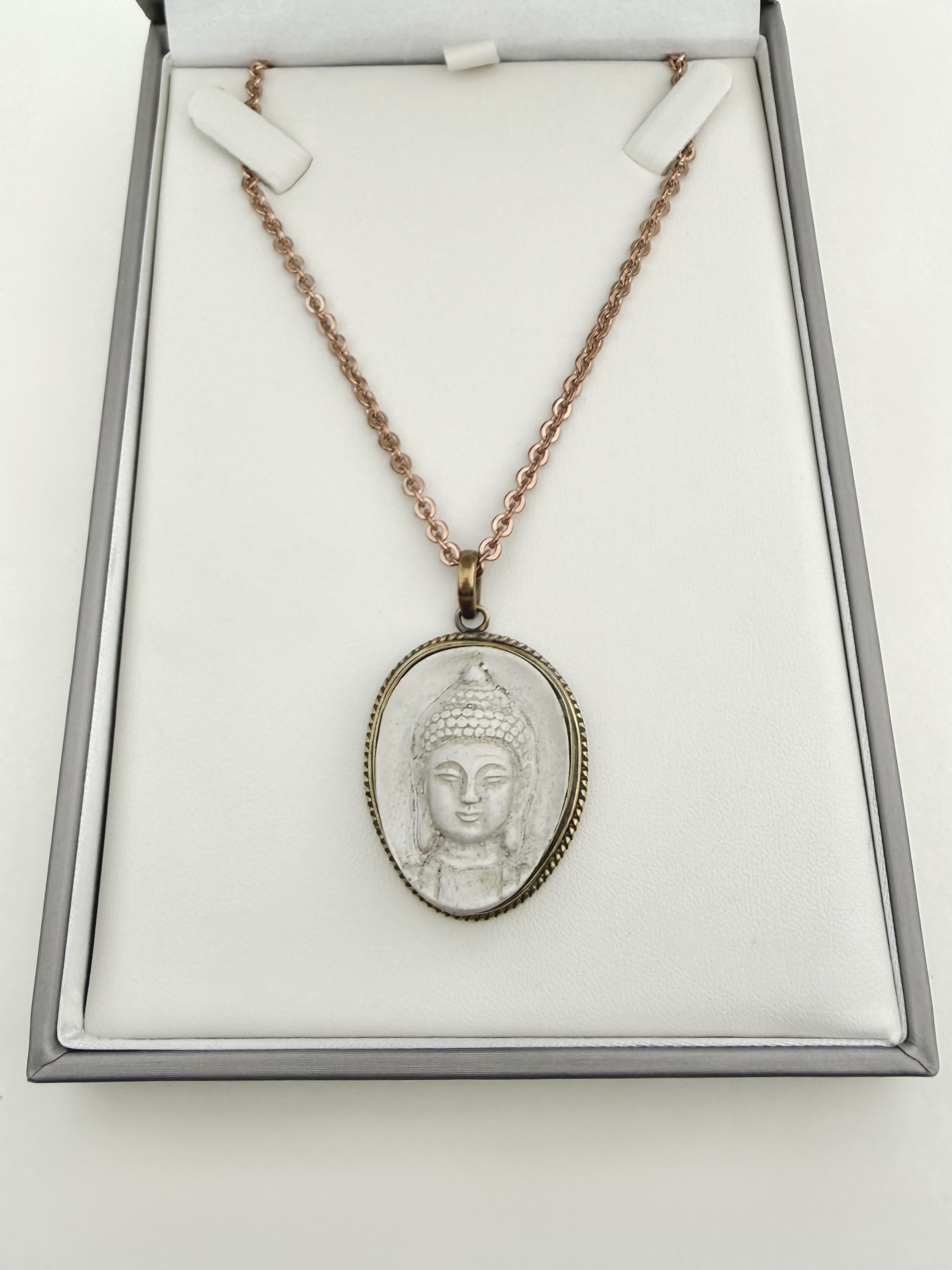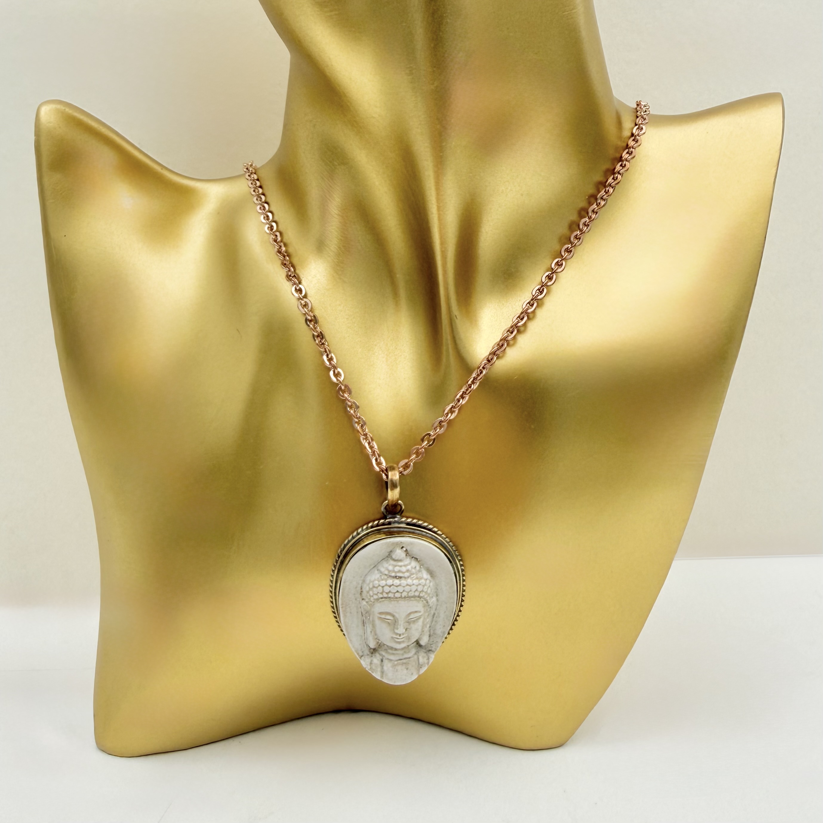 This ivory-coloured Buddha Head pendant is exquisitely detailed, oval in shape and featuring a serene sculptural depiction of the Buddha’s face that embodies calm, balance and inner awareness. The expression is peaceful and harmonious, with gently closed, downcast eyes symbolizing meditation, compassion and spiritual reflection. The nose is straight and refined, and the lips form a faint, calm smile - sometimes called the “Buddha smile” - conveying tranquility and contentment. The ears are long and elongated, a traditional symbol of wisdom and the Buddha’s past life as a prince who wore heavy earrings. The finely sculpted symmetry enhances its tranquil presence, making it both meaningful and visually striking.