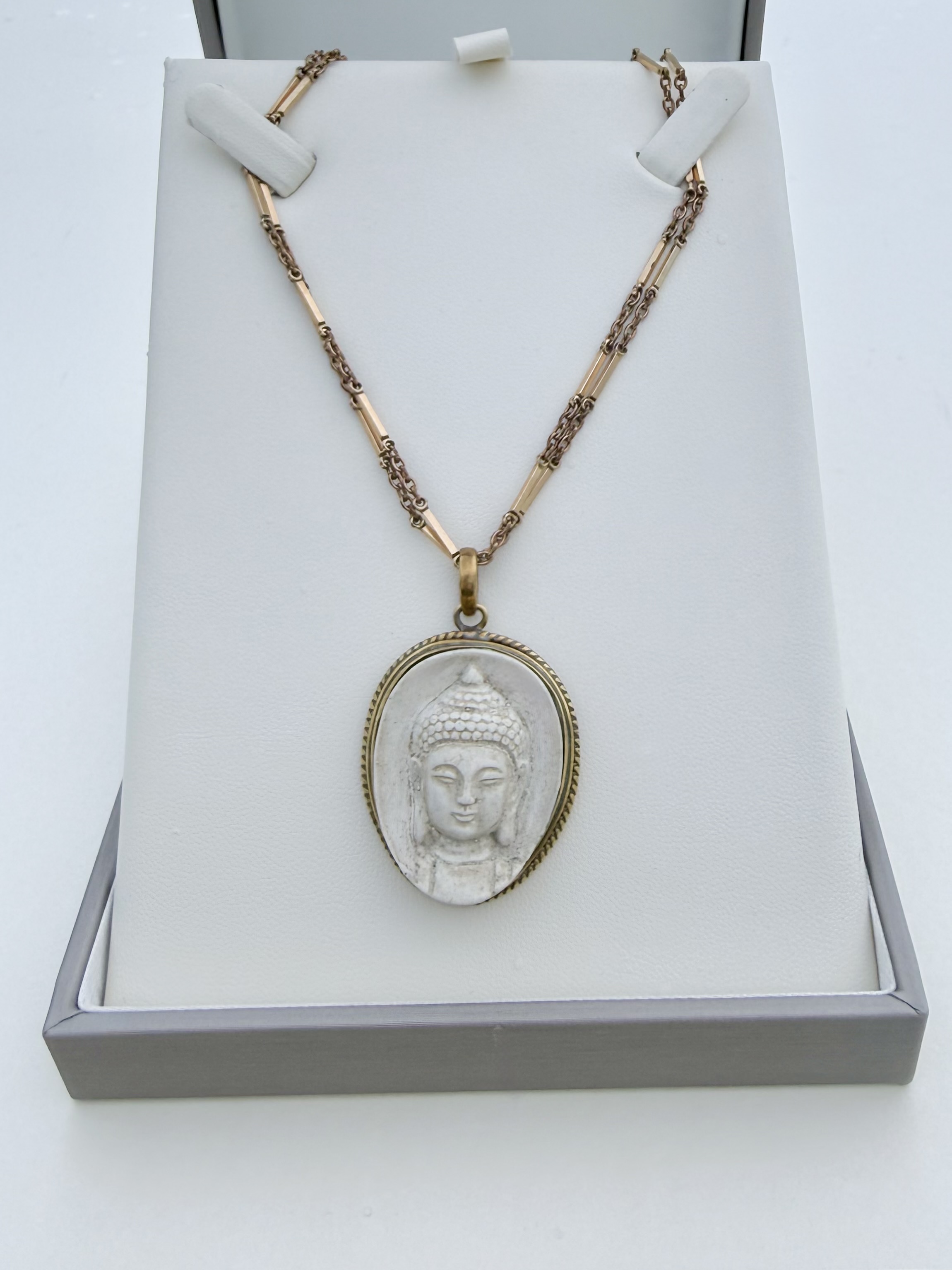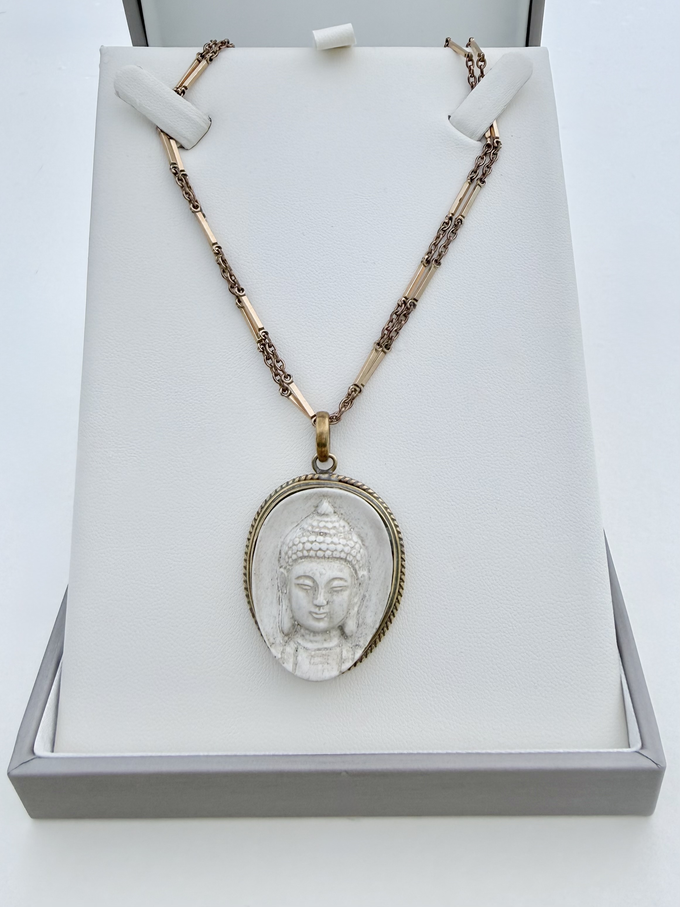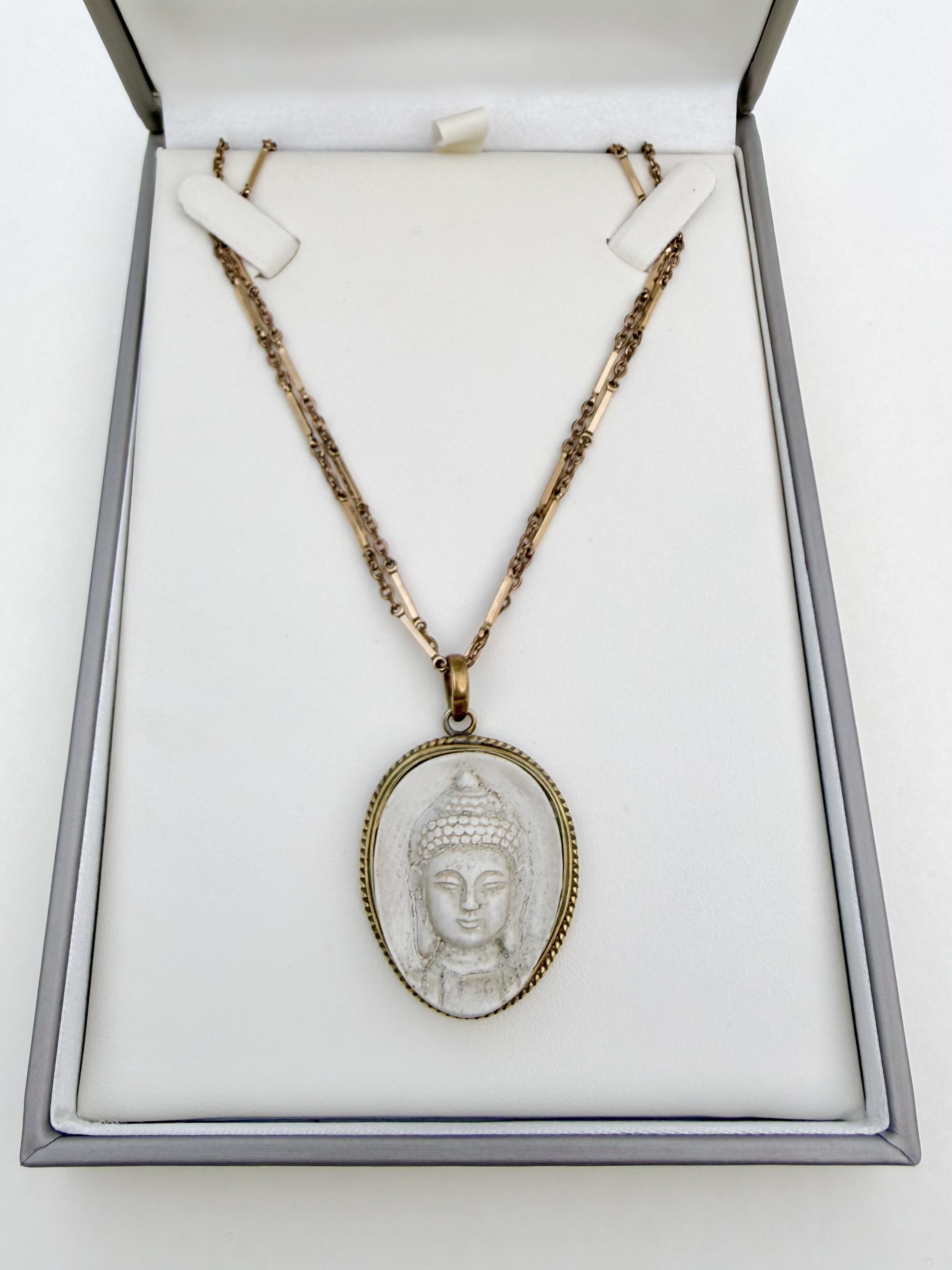 This ivory-coloured Buddha Head pendant is exquisitely detailed, oval in shape and featuring a serene sculptural depiction of the Buddha’s face that embodies calm, balance and inner awareness. The expression is peaceful and harmonious, with gently closed, downcast eyes symbolizing meditation, compassion and spiritual reflection. The nose is straight and refined, and the lips form a faint, calm smile - sometimes called the “Buddha smile” - conveying tranquility and contentment. The ears are long and elongated, a traditional symbol of wisdom and the Buddha’s past life as a prince who wore heavy earrings. The finely sculpted symmetry enhances its tranquil presence, making it both meaningful and visually striking.