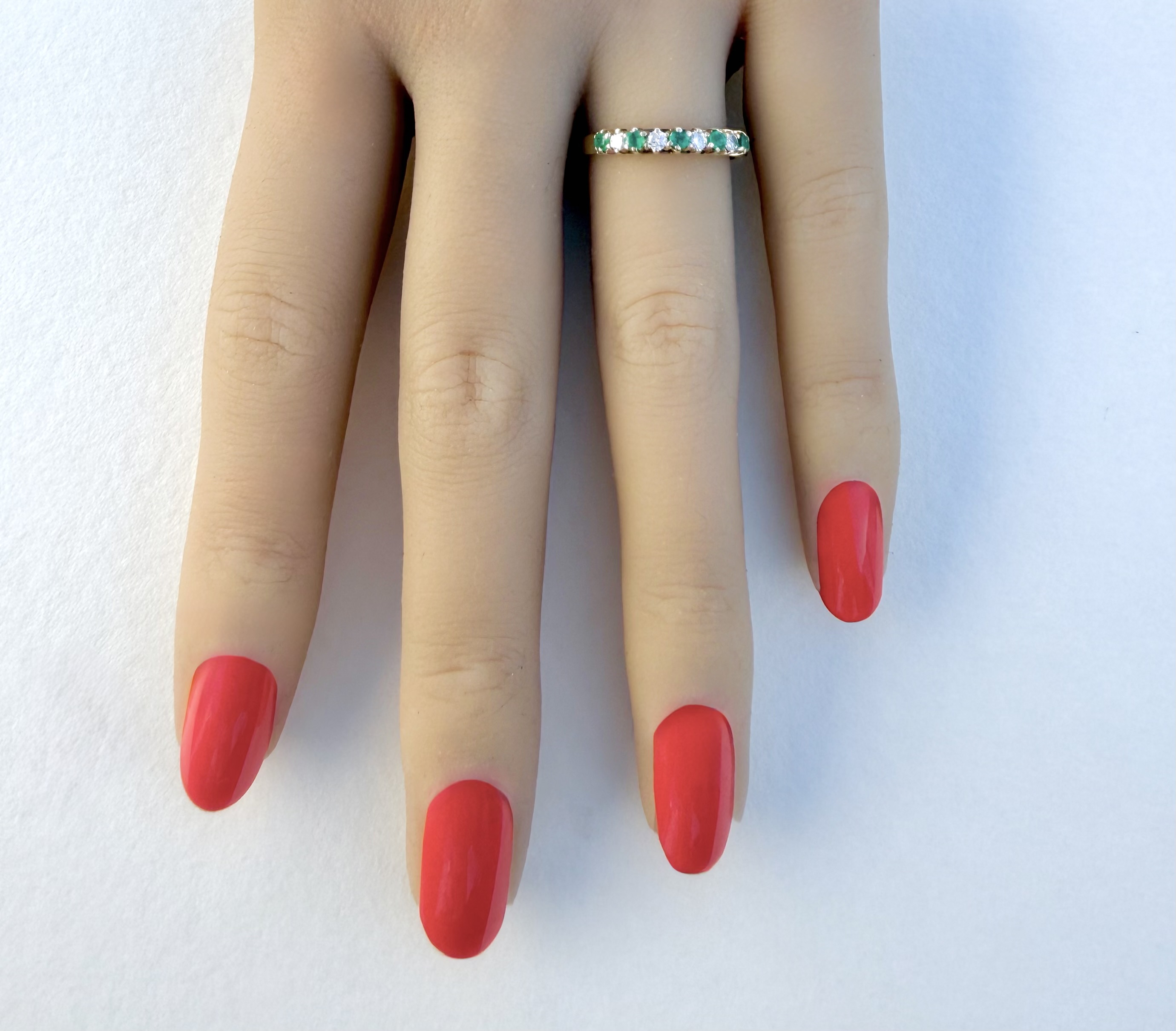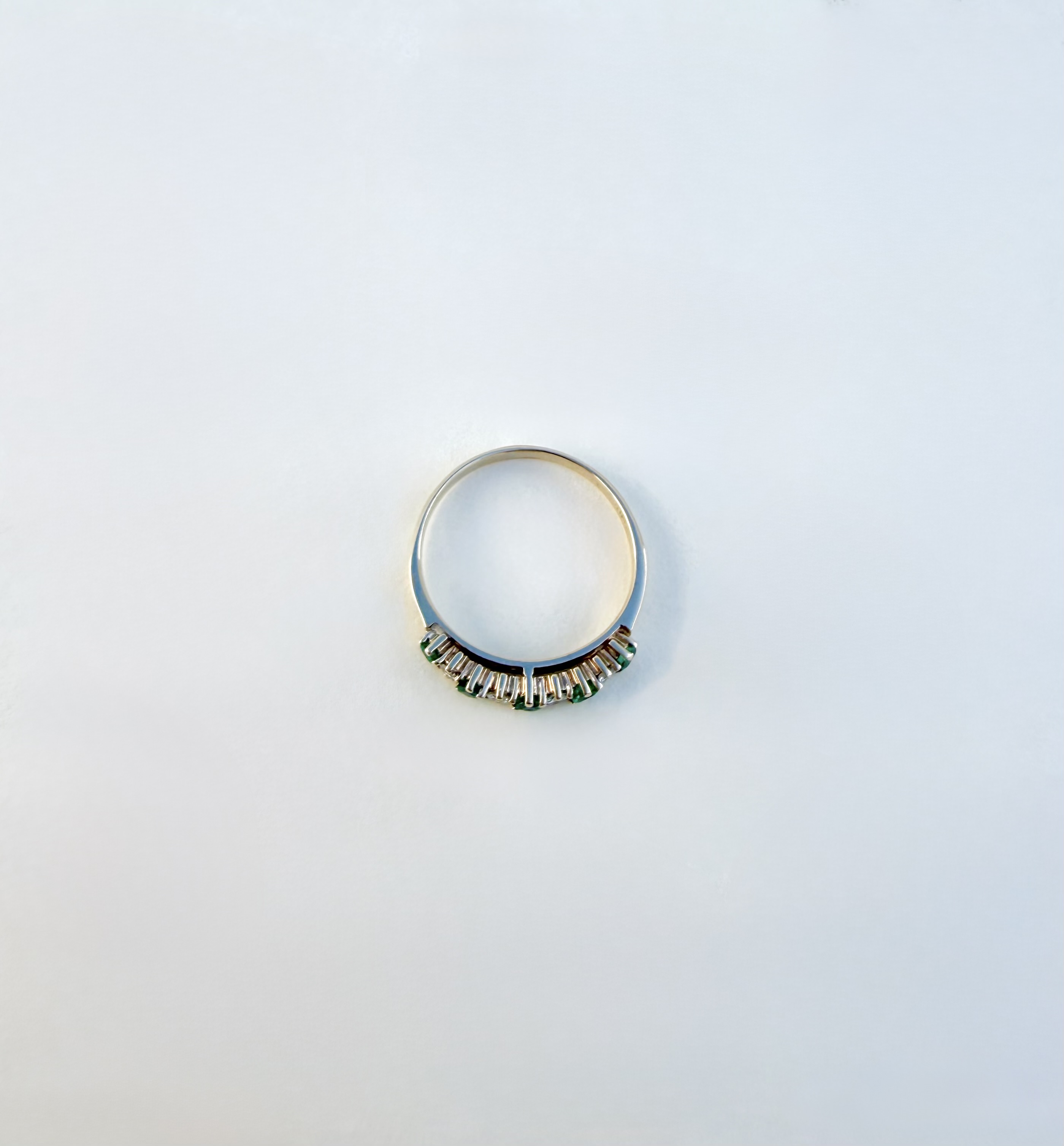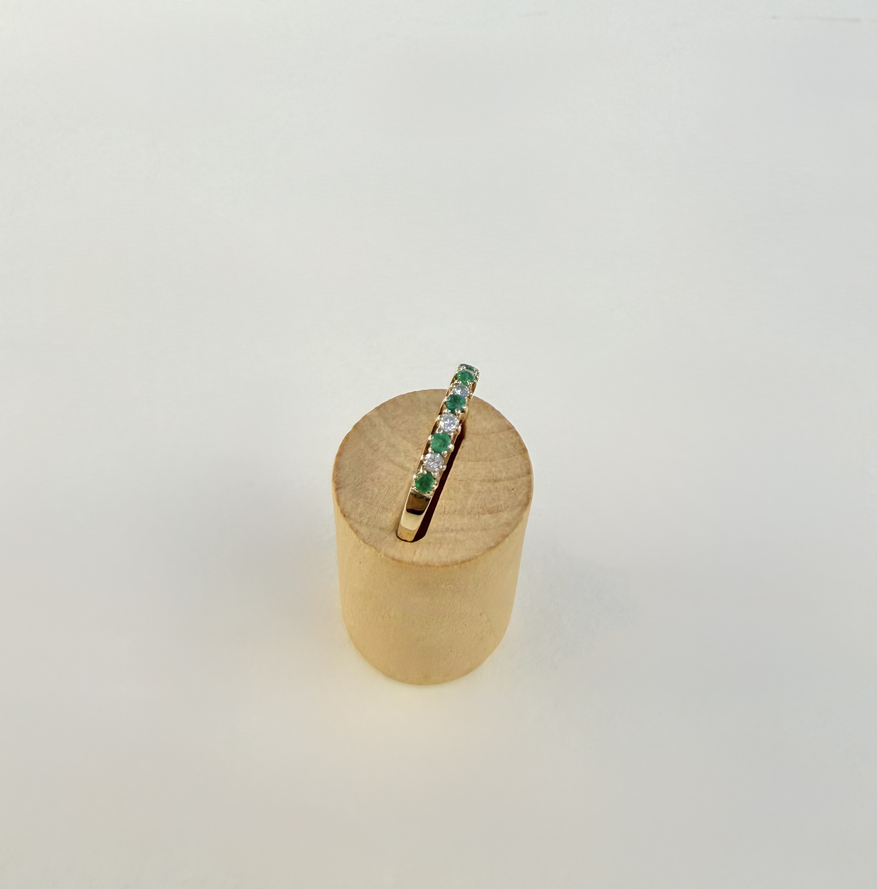 An elegant hallmarked 9ct. yellow gold half-eternity style ring, finely set with five vibrant green emeralds, each delicately interspersed with a sparkling diamond (four diamonds in total). Sheffield hallmarked and dated 1990. Size: N¼.