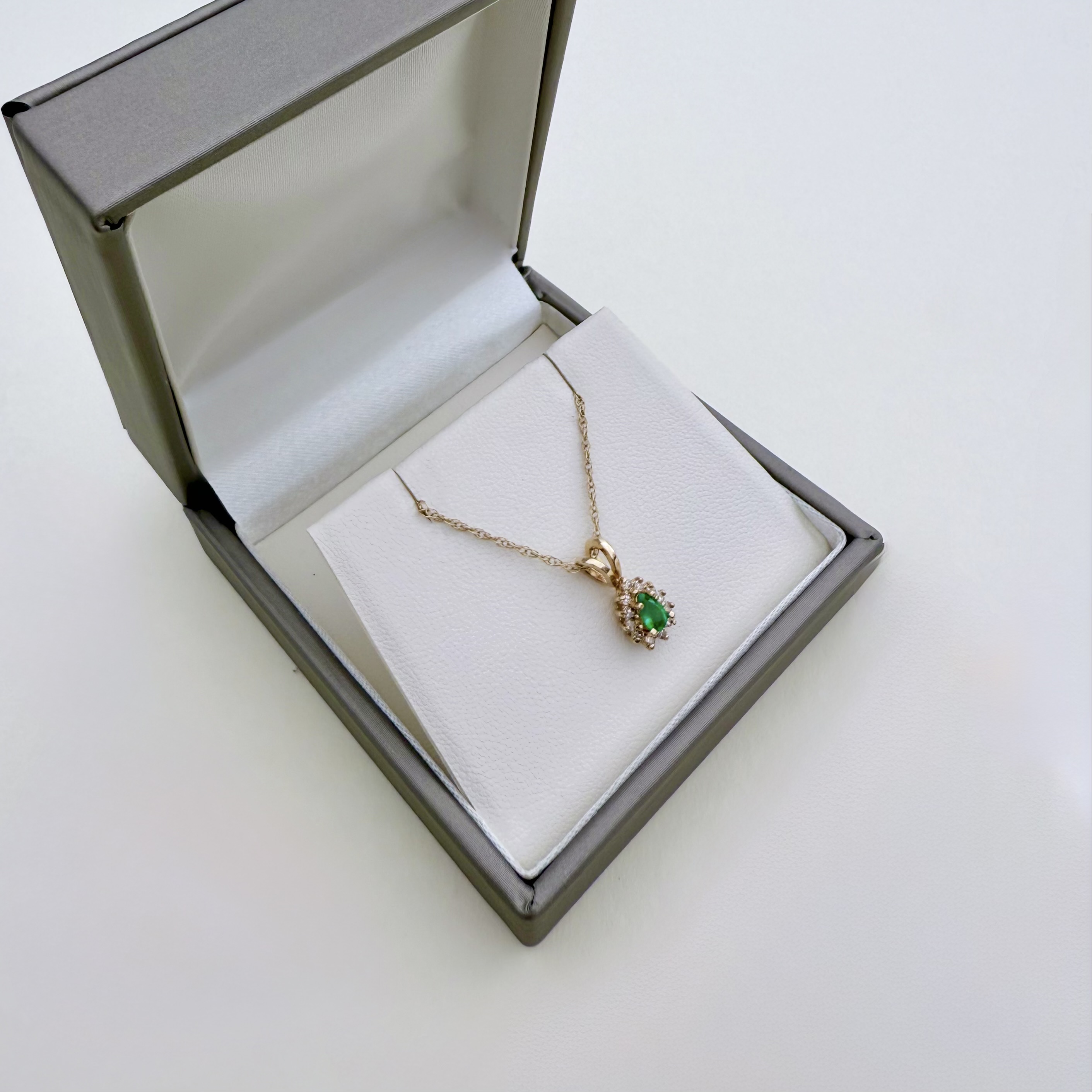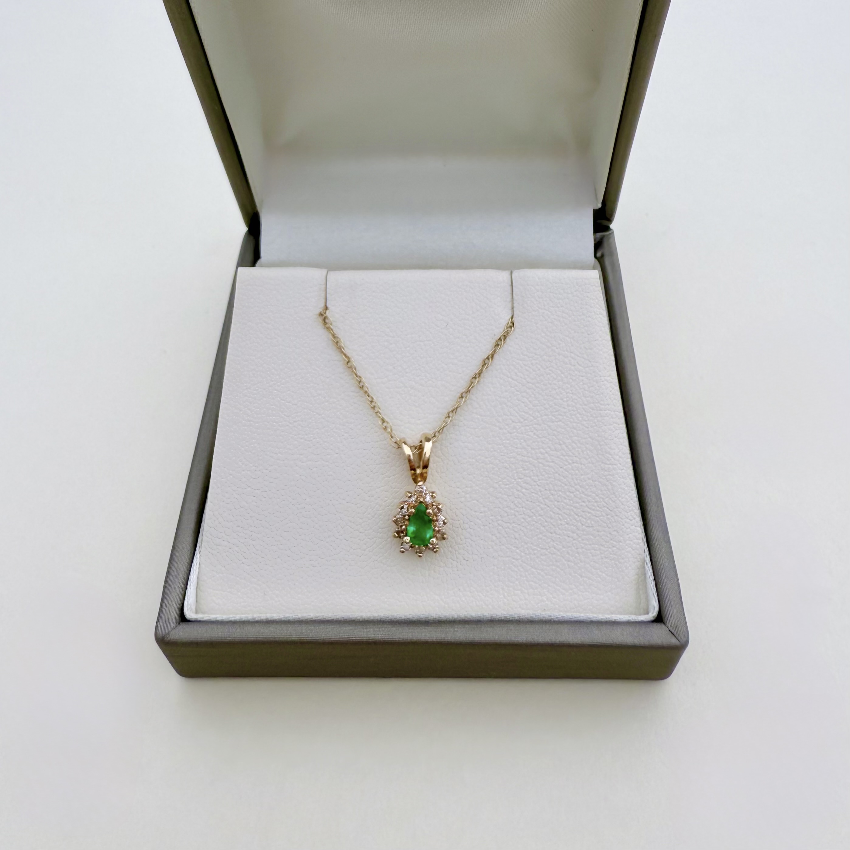 This beautifully crafted pendant features a vibrant, pear-shaped Emerald, elegantly framed by 12 well-matched bright, white and sparkly diamonds. The pendant is suspended from a hallmarked 9ct. gold trace link chain, measuring 45 cms. (= 17¾") in length. The chain is also stamped for authenticity. A timeless piece that blends classic elegance with a touch of luxury - perfect for any occasion.