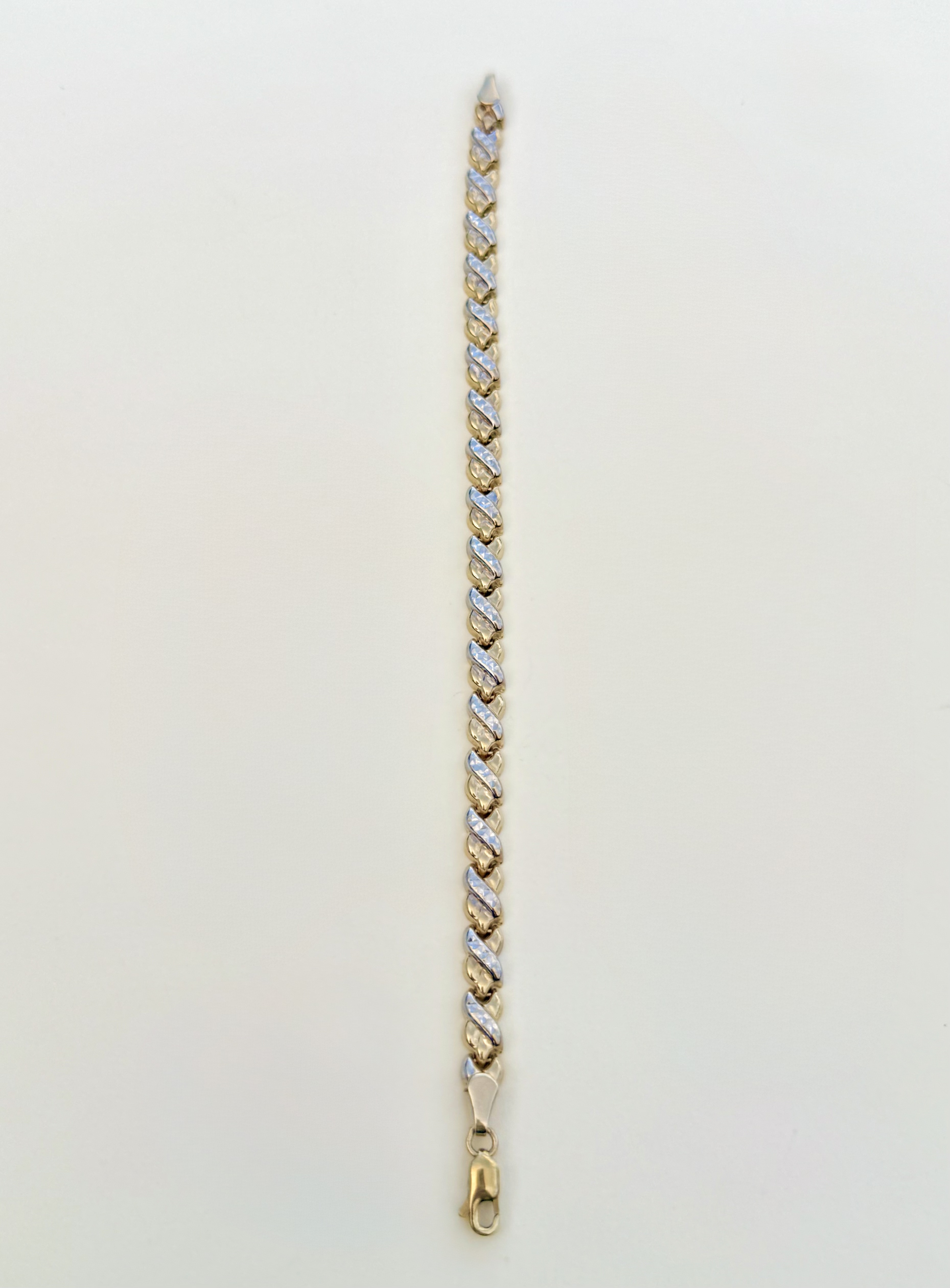 Crafted in hallmarked 9ct. yellow and white gold, this elegant bracelet features an 'X' (kisses) design - potentially symbolizing love and affection. It bears the Common Control Mark (CCM) - an internationally recognized hallmark used by countries, including the UK, that are signatories to the International Convention on Hallmarking. This mark guarantees the chain meets strict international standards for gold purity and quality.