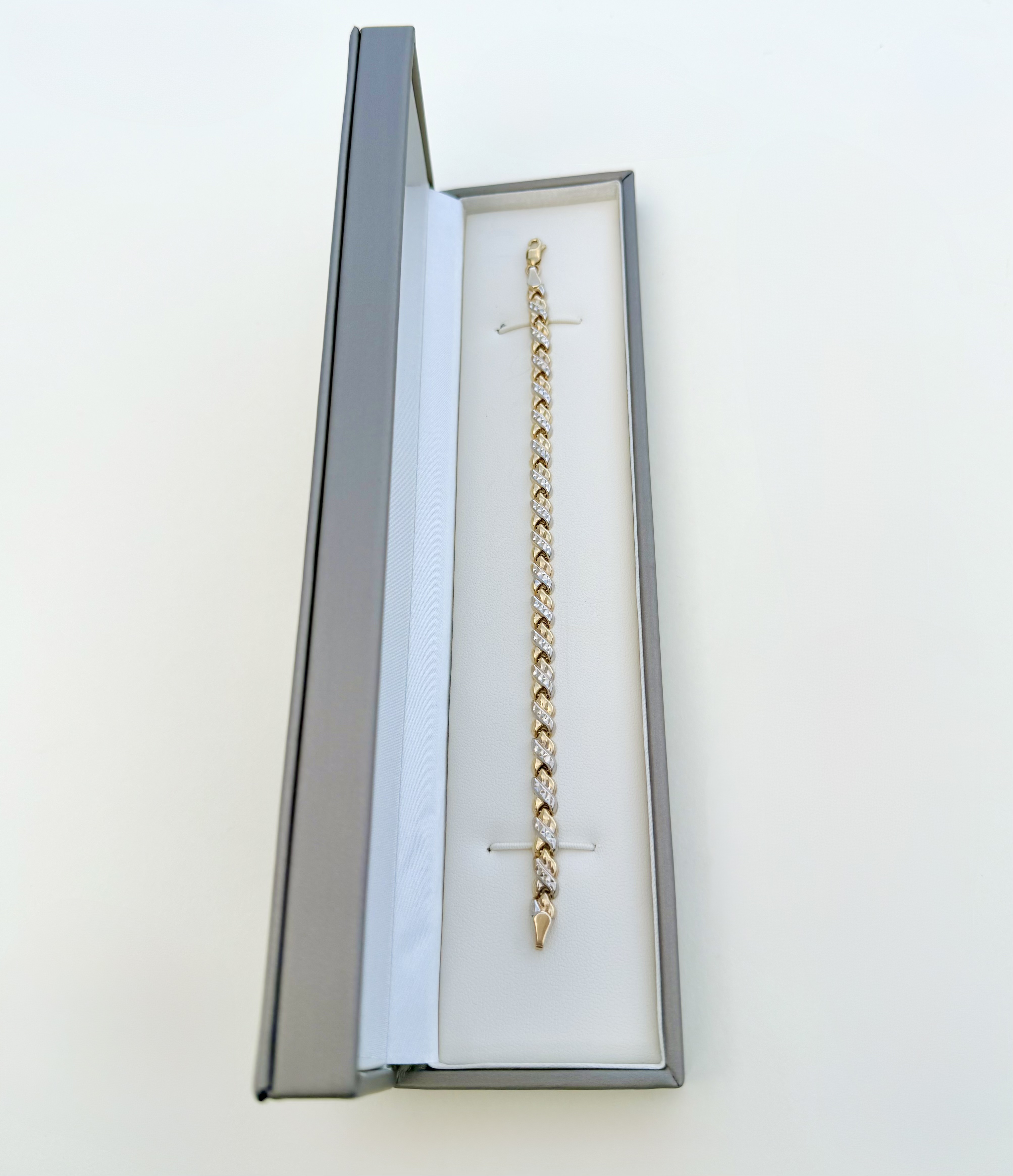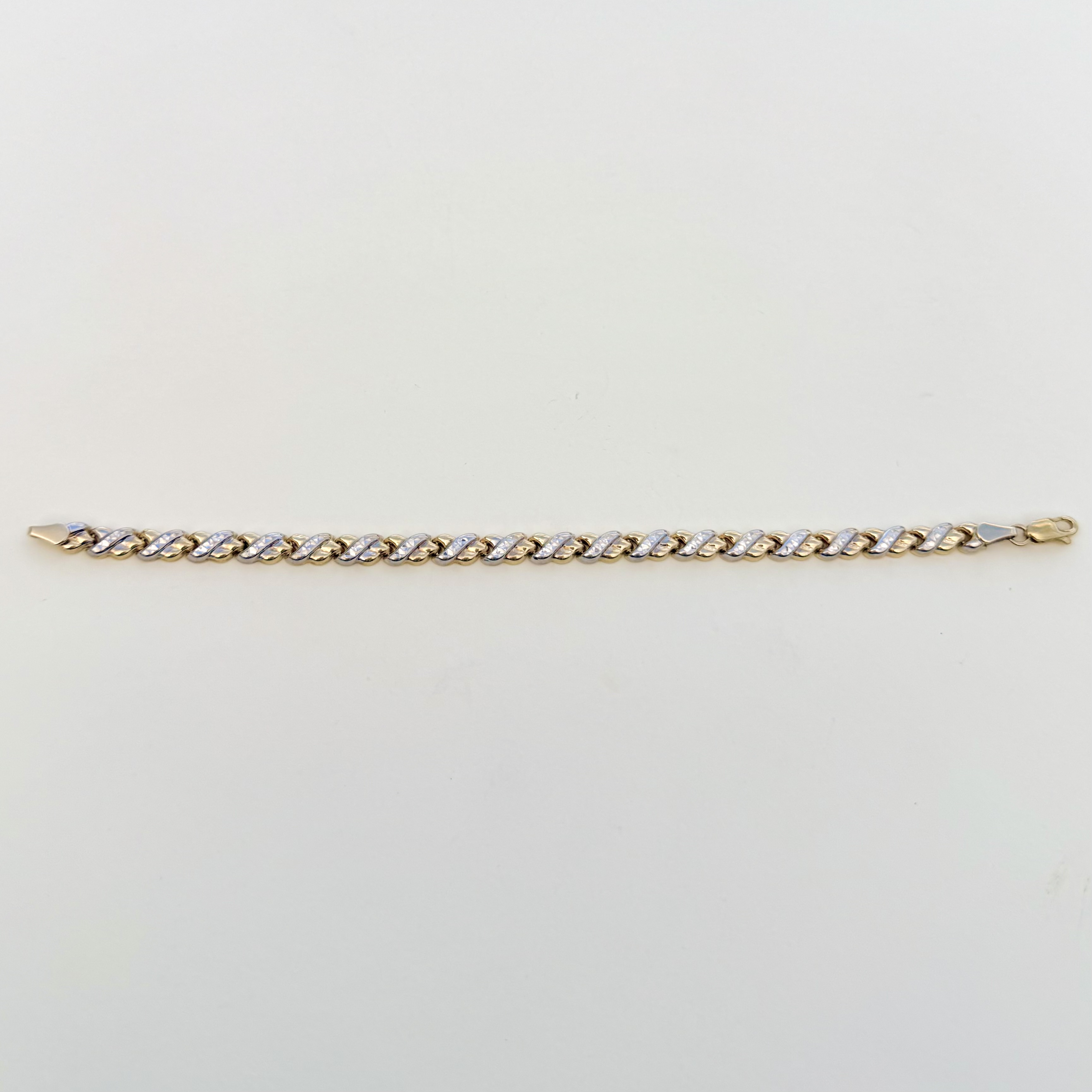 The secure lobster clasp ensures a comfortable and reliable fit, making it ideal for everyday wear or special occasions. Versatile piece - its two-tone finish allows for effortless pairing with both yellow and white gold jewellery. A thoughtful and meaningful gift for someone special - or a stylish treat for yourself. Length: 18 cms. (= 7”). Width of bracelet links: 5.42mm. (= 0.54cms. / 0.21”).
