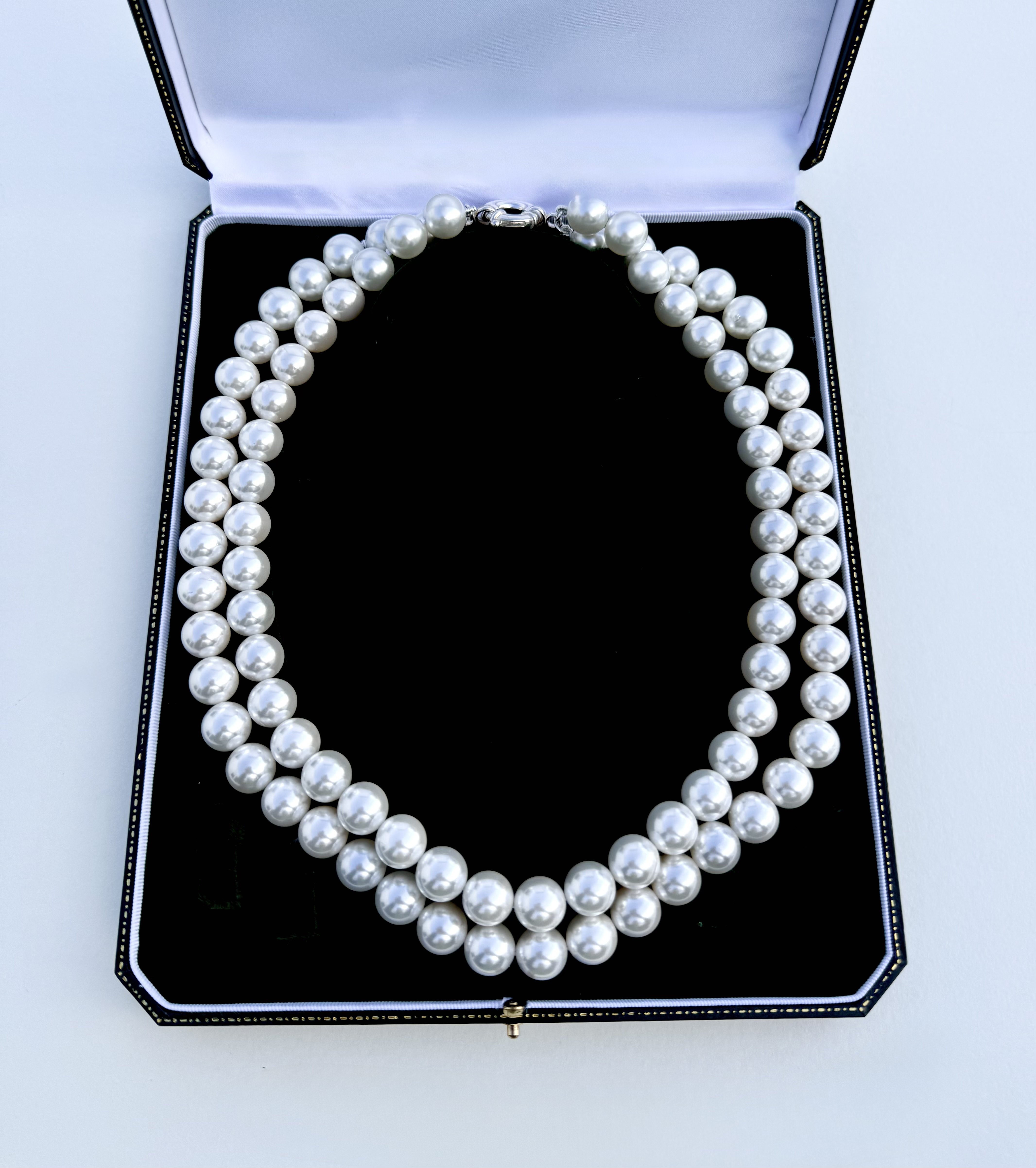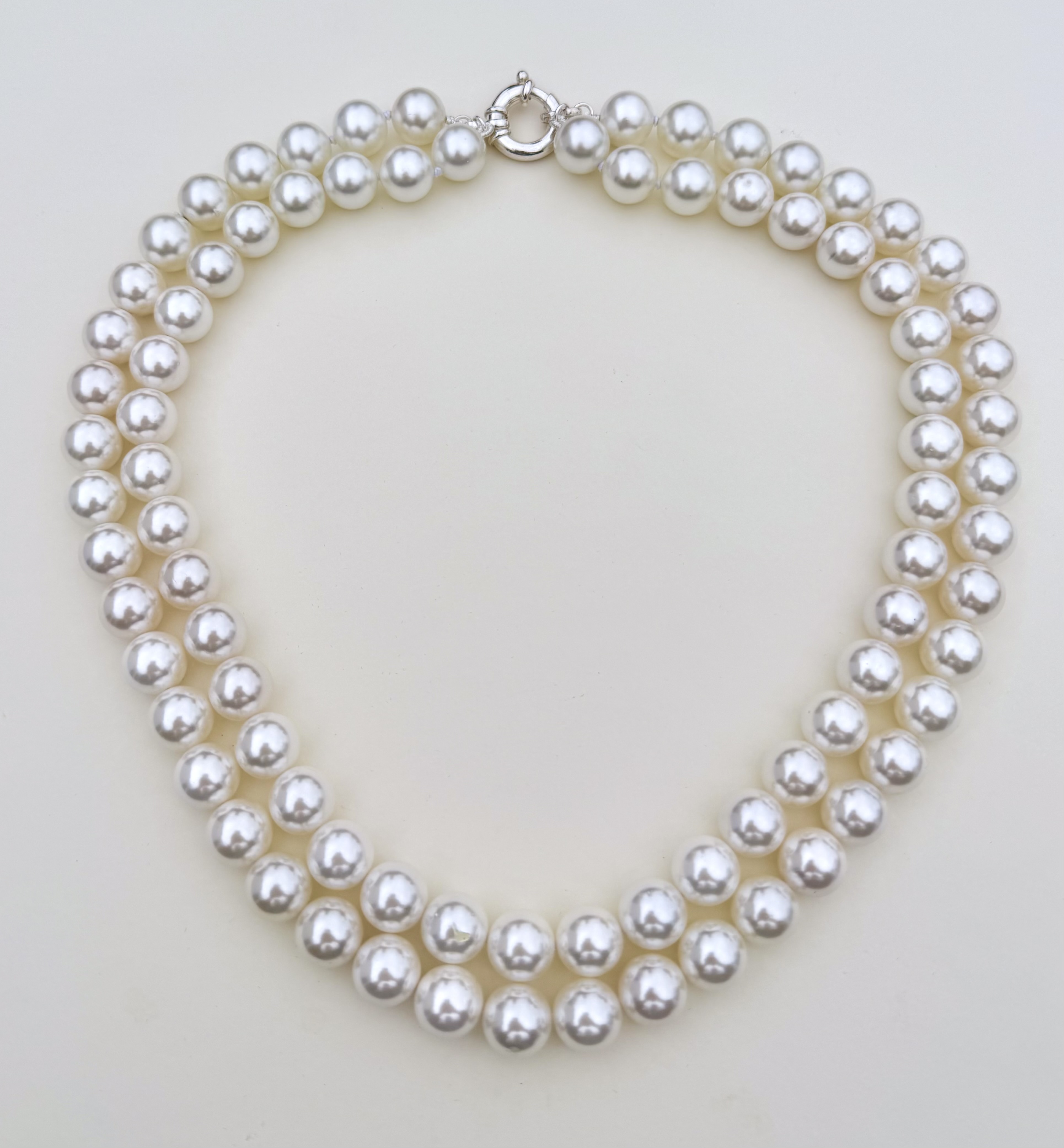 Exquisite Grade AA South Sea shell mother-of-pearl necklace, hand-threaded and individually knotted.. Featuring two perfectly matched rows of luminous 12 mm pearls, this necklace radiates a soft, iridescent glow that enhances every complexion. The necklace is secured by an 18mm sterling silver bolt ring clasp.