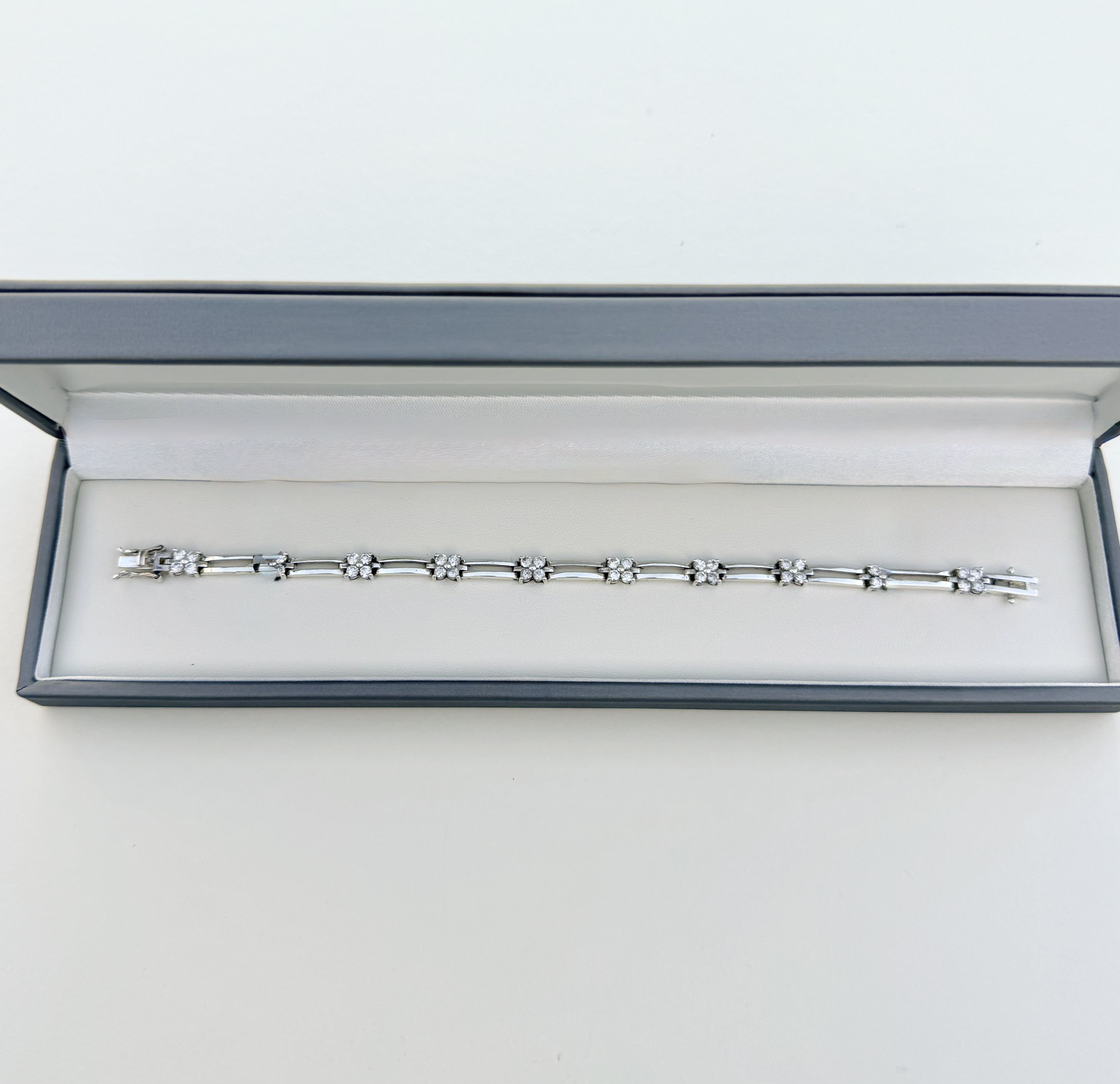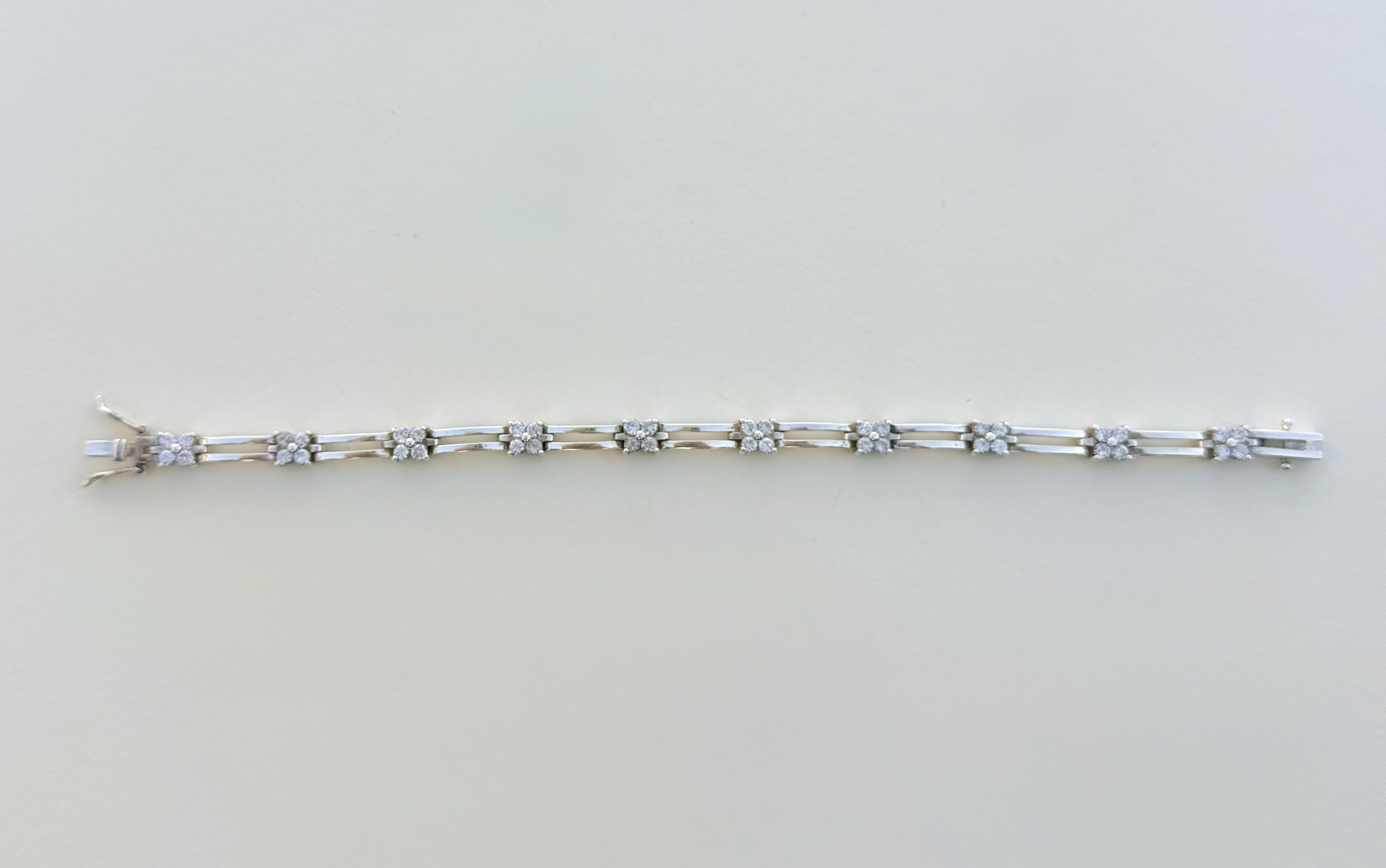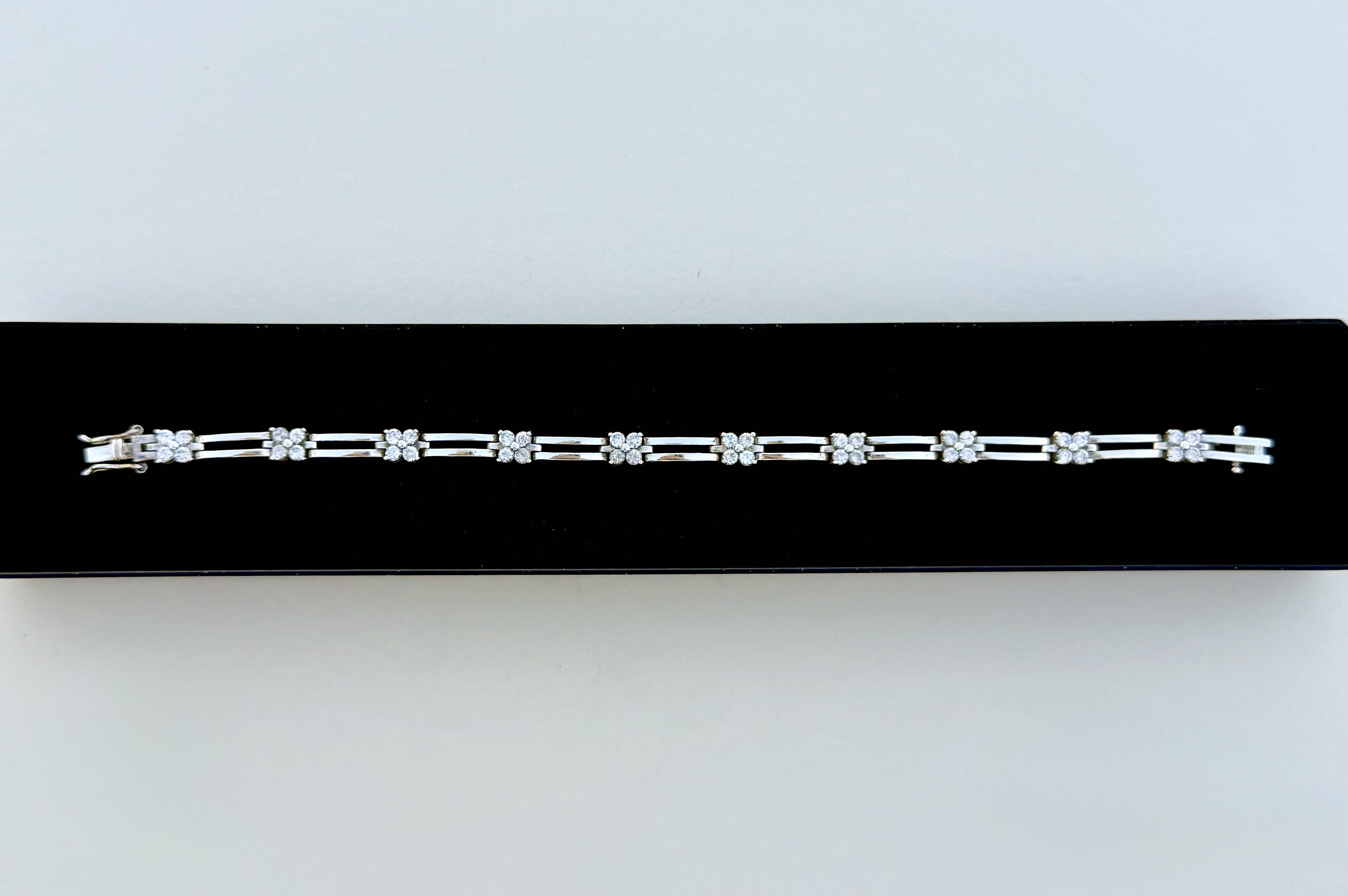 Crafted in sterling silver, this exquisite bracelet features ten sparkling cubic zirconia four-leaf floral motifs, beautifully interspersed by sleek double concave bars for a refined, contemporary touch. A secure push–pull clasp with double side locks ensures comfort and confidence in wear. Perfect as a gift of elegance and sentiment, this bracelet complements any occasion.