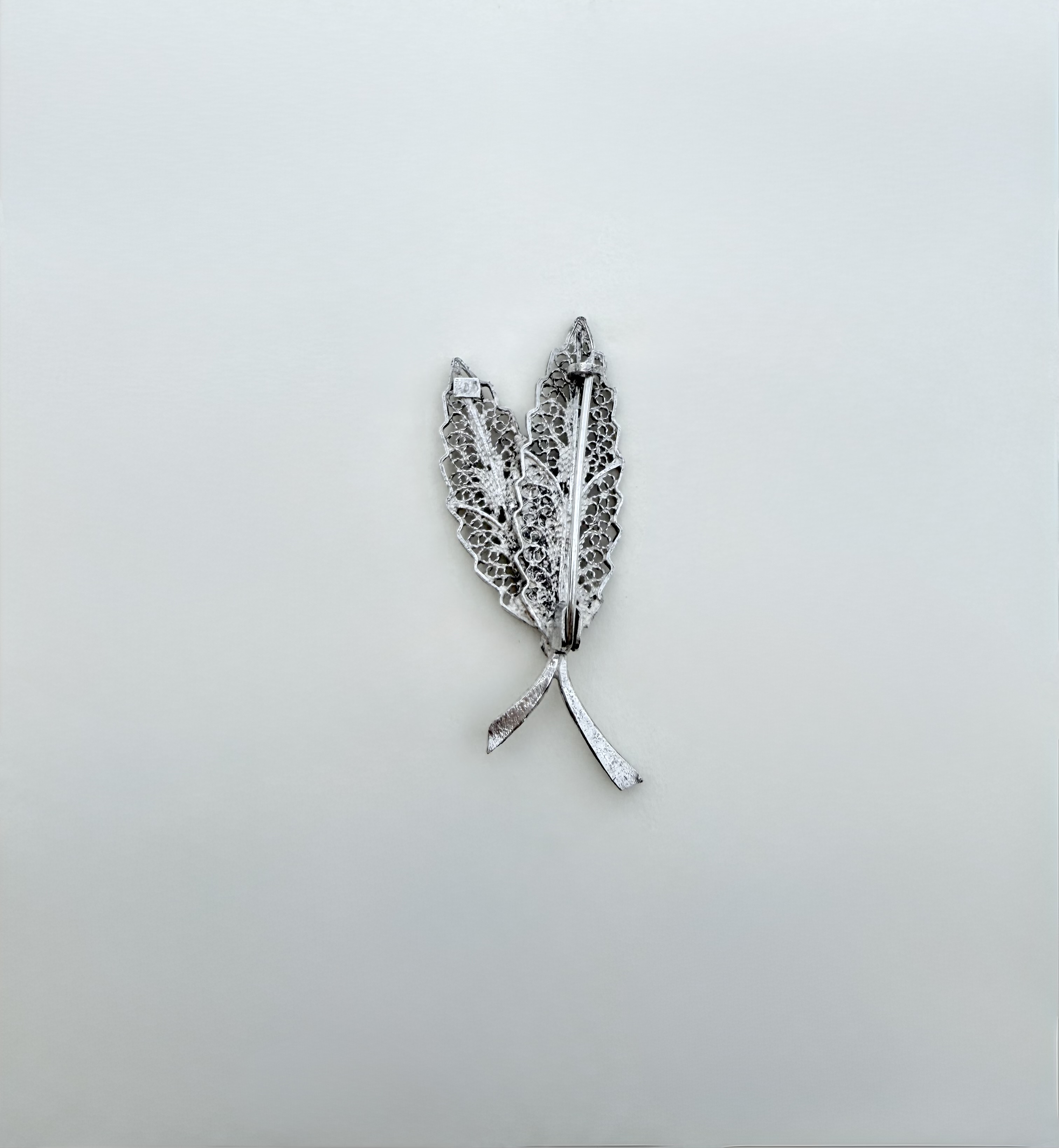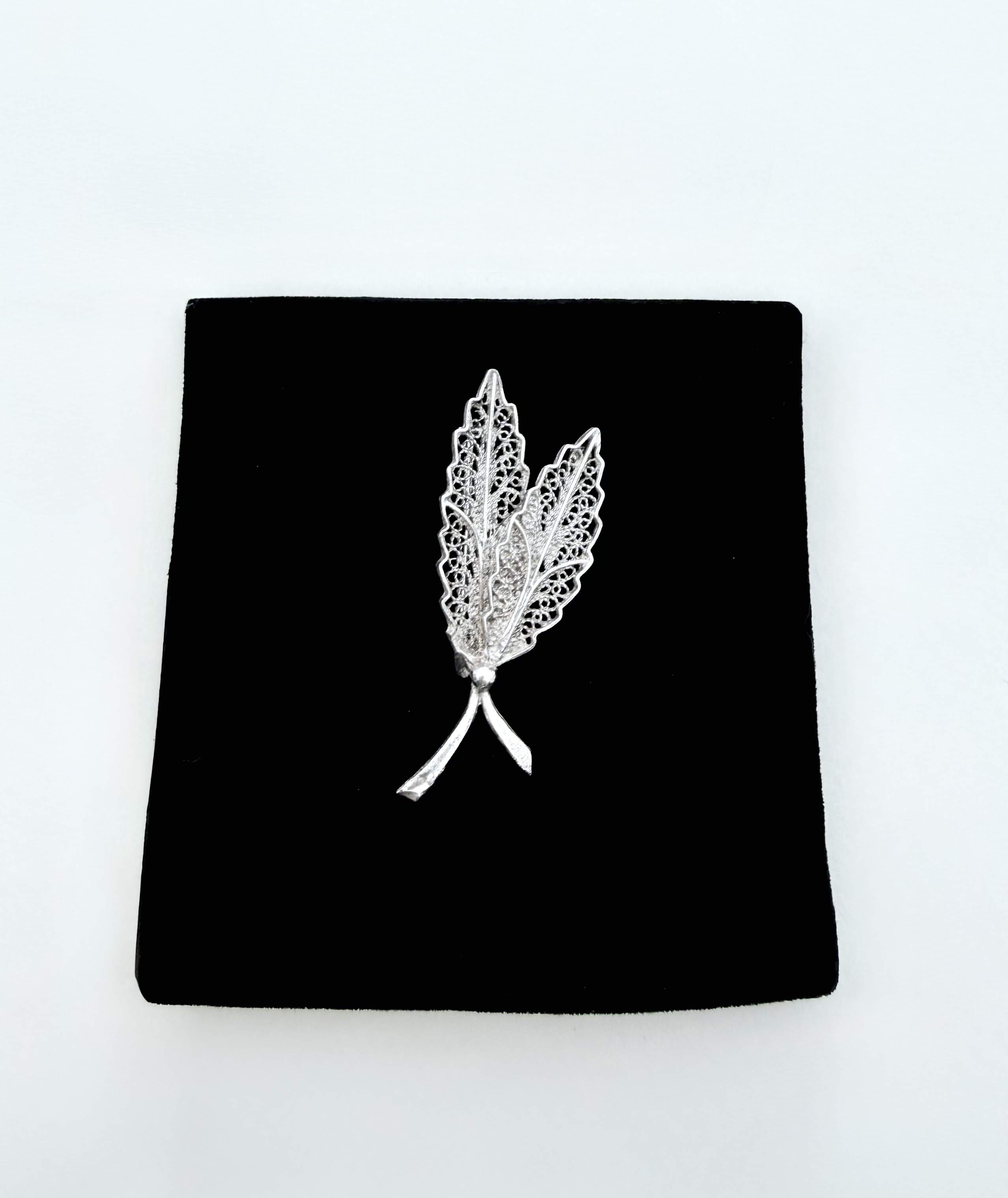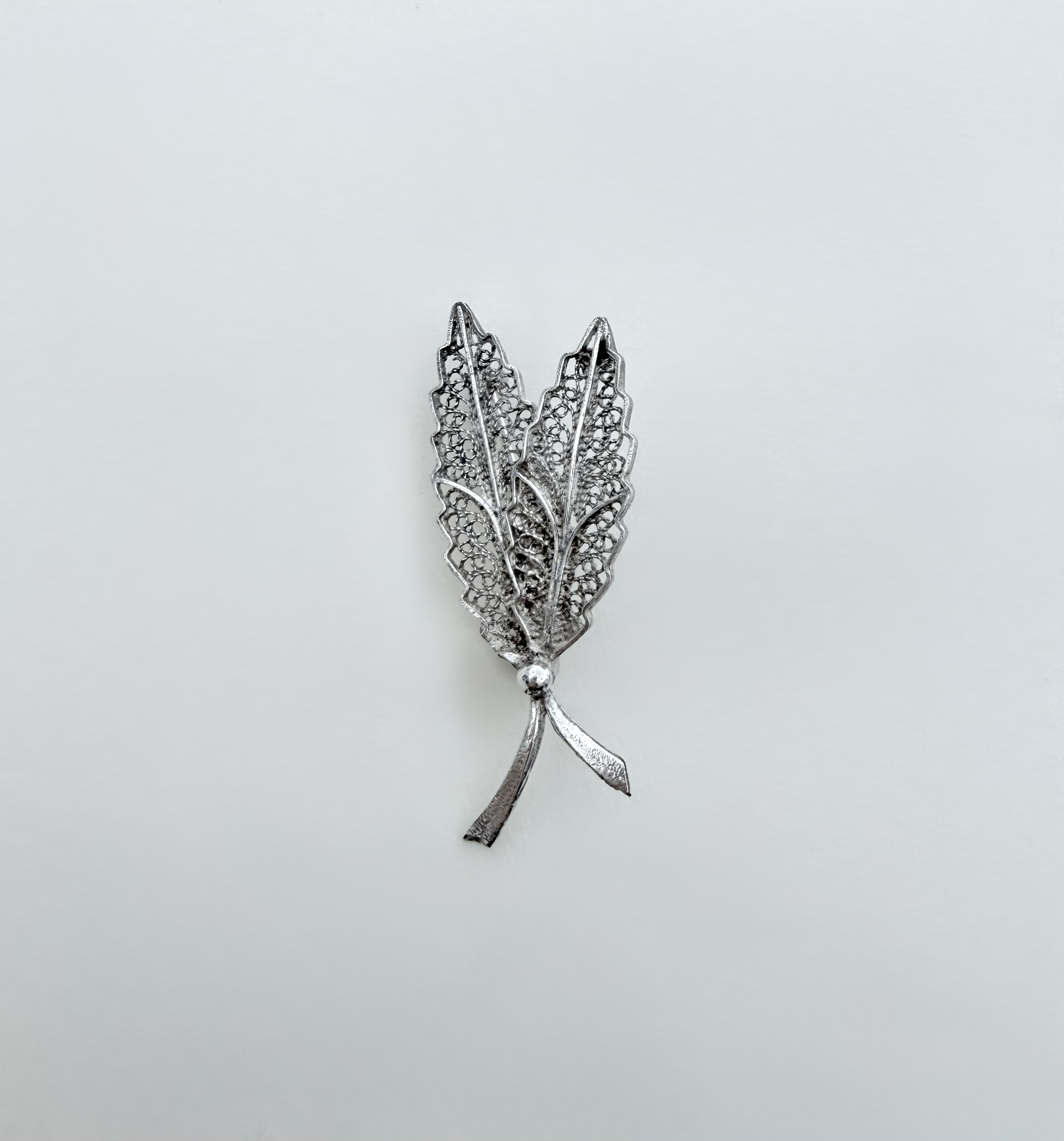 Ideal for nature lovers, this elegant sterling silver filigree Brooch captures the delicate beauty of the natural world. The design features two gracefully intersecting leaves, their finely detailed veins brought to life through intricate filigree work. At the base, bifurcated stems rise and meet, joined by a silver bead that adds a subtle focal point and sense of harmony.