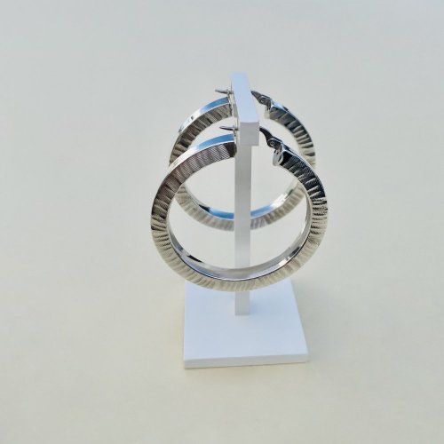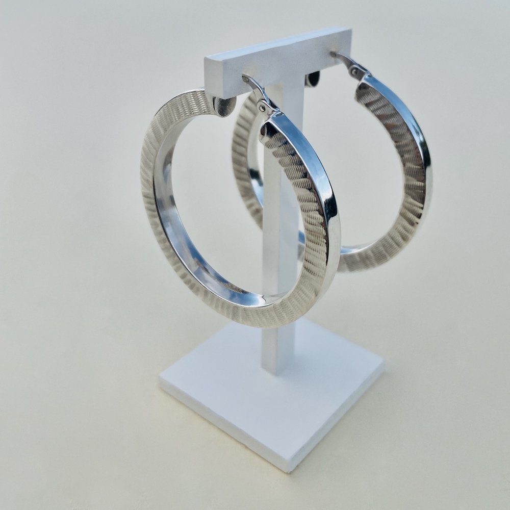 Sterling silver circular statement hoop earriings, embossed with horizontal striations design to outer surface of both sides of earrings and plain silver in-between. Full insert clasps for added security. Cool for casual wear or dress up for night wear!