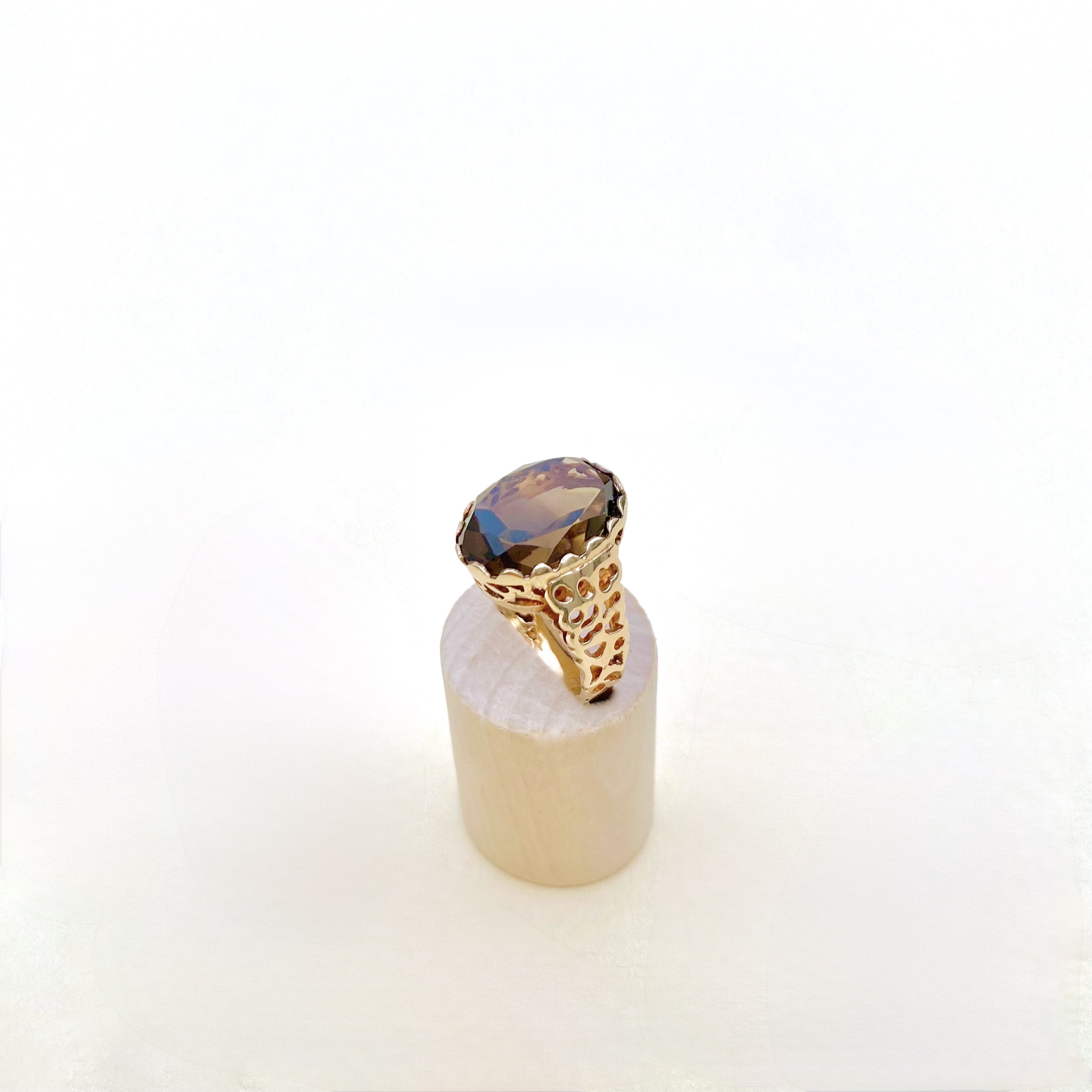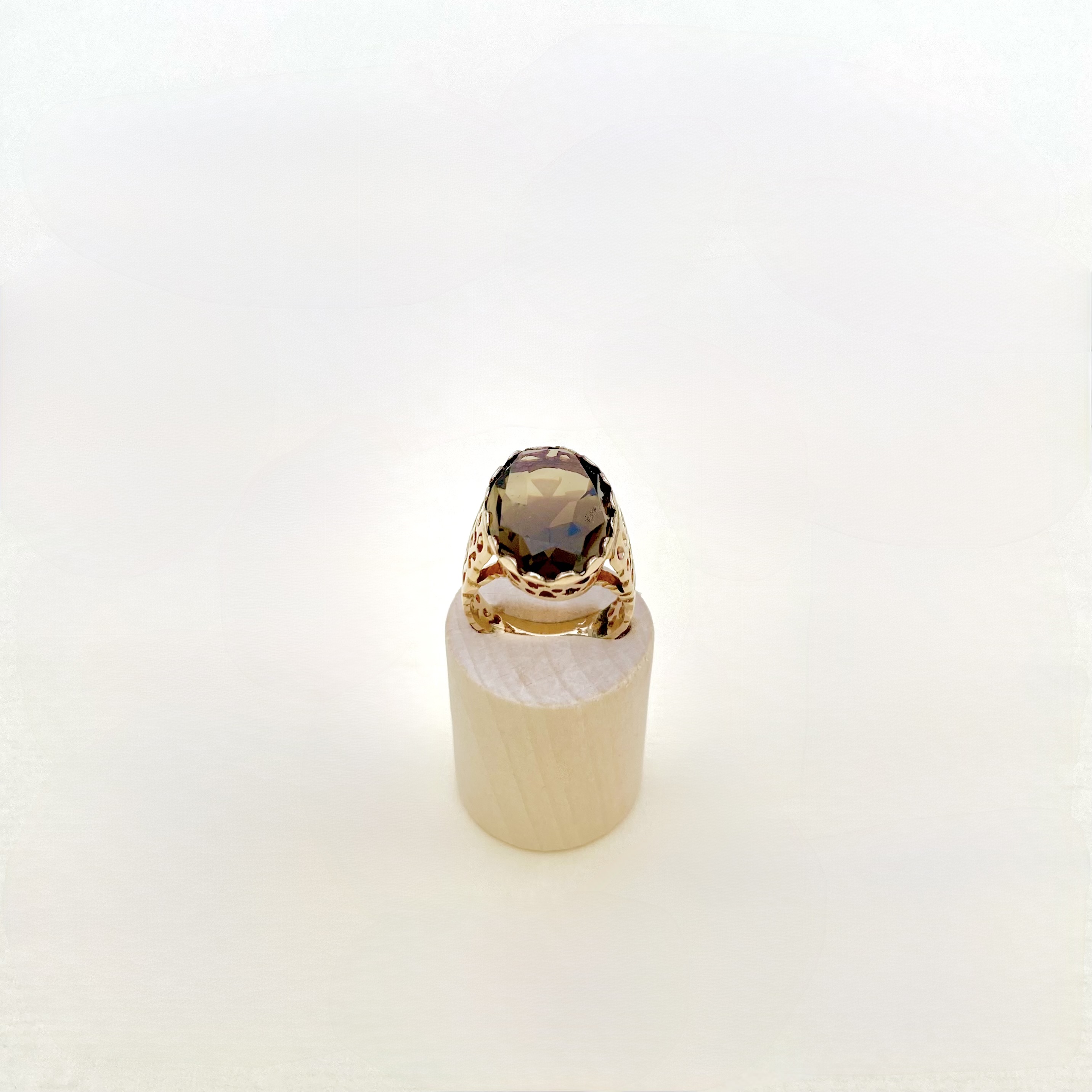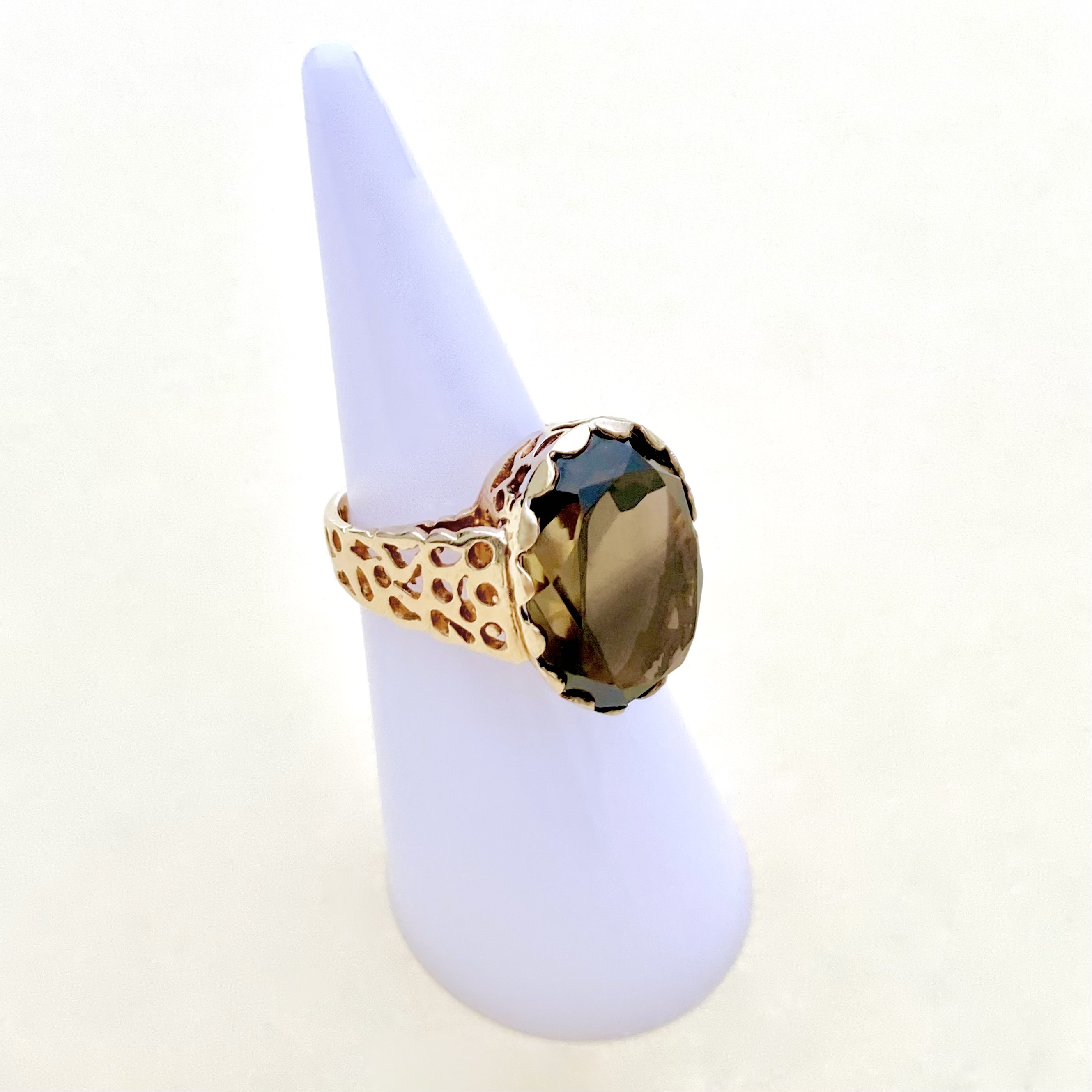 Exquisite vintage 9ct. gold ring (tested), featuring a mesmerizing large oval smoky quartz at its centre. The beautifully faceted quartz, in mint condition, radiates warm, earthy tones that catch the light with every movement.