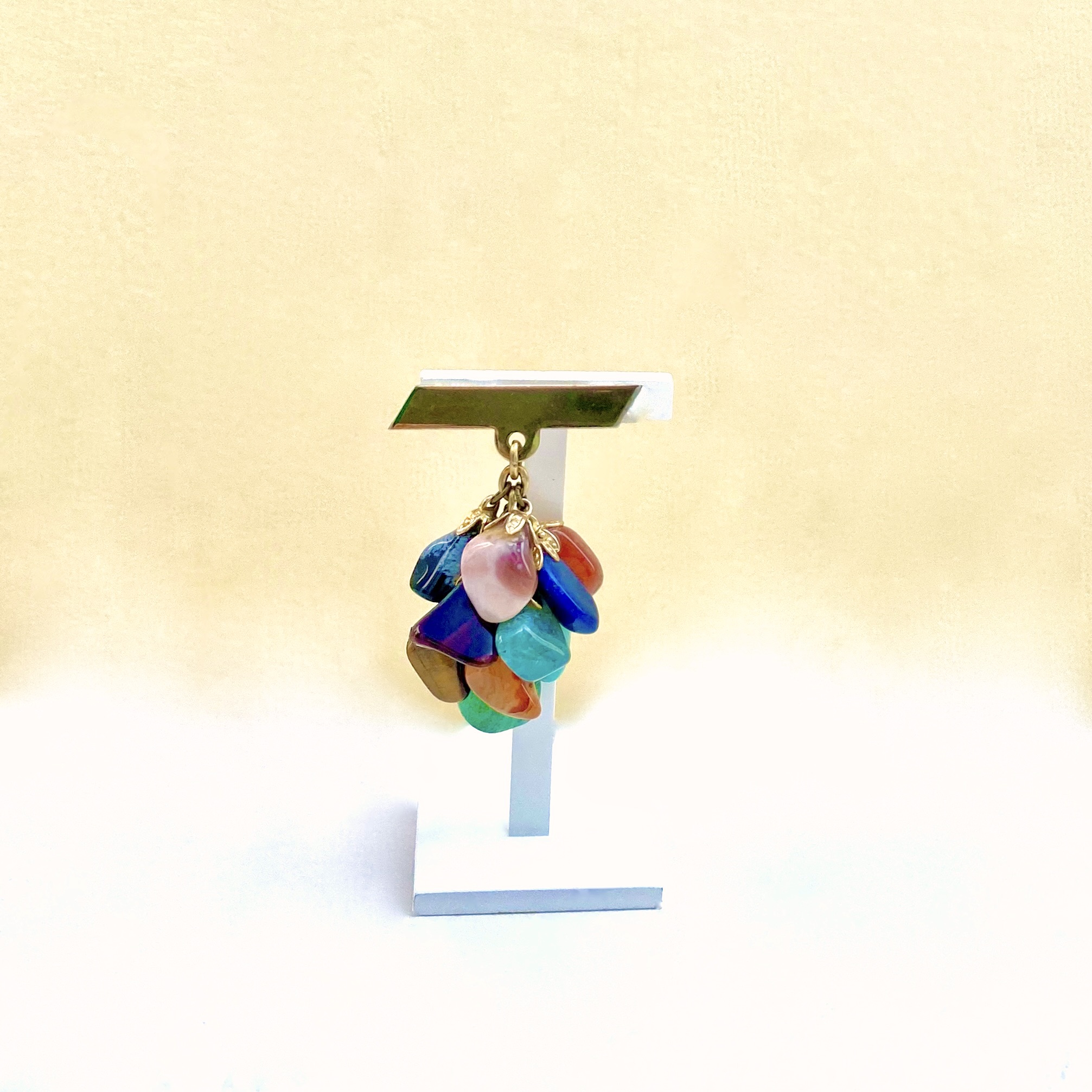 Necklace: A striking piece with 27 layered beads in pastel green and pink, purple, turquoise, black and tiger-eye browns. Bolt ring clasp for secure closure. Sitting gracefully at 41 cm (16"), it’s perfect for accentuating the neckline. Individual Price: €26